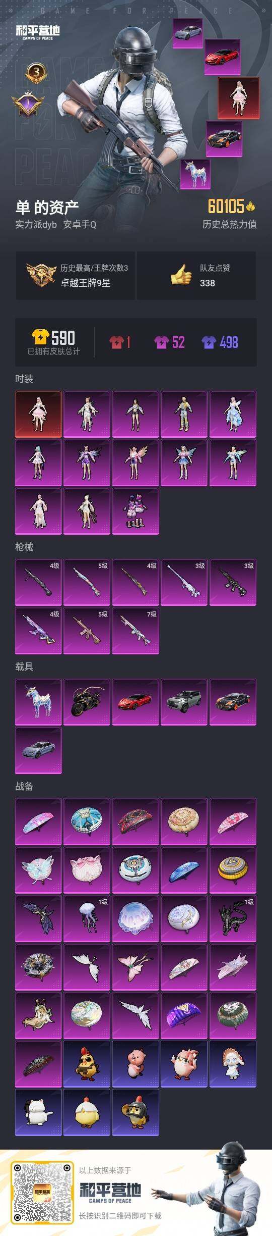 - [11529111]31粉装 6特效枪 1载具 17印记 可二次 可修改实名 身法装备:暗影哥特(红眼罩),冥河战士(老木乃伊),KONE追光队服,萌熊伴侣背包(粉熊背包) 优质装备:冥河战士(老木乃伊),木乃伊套装(老)(冥河战士),兰博基尼Estoque(炫光金),甜心巧克力,萌熊伴侣背包(粉熊背包),M416五爪金龙,SCAR-L梦幻火箭,梦幻火箭(新101)(新火箭少女101粉色套装),宝贝奶油派,天使彩虹糖,放客神游,土曜战麒,金曜白虎,缤纷油彩(猪妹猪脸妹),绚金战神,冰霜白皇,新星烈龙(小白龙),童趣迷兔,AKM梦之光华,馨动时刻,DP-28暗夜鎏金,七级AKM-梦之光华,七级SCAR-L-梦幻火箭,七级M416-五爪金龙,Mk14精灵梦叶罗丽,绯果甜心,Kar98K-巳巳如意 热门装扮:精灵娃娃,酣梦娃娃,岚岚物语,海渊国主,霞光圣骑,寒光使者,暖熊萌萌,傲雪凌霜,音爆索尼克,第五大道,飒粉甜心,呆萌星弥,白勺歌姬,小可学妹,白兰星,闲梦青缨,暖暖奶龙,兔兔白日梦,动感兔斯基,胖达圆圆,胖达团团,萌神柯基,罗小黑,激萌罗小黑,潮萌小黄鸭,万圣娃娃,梦魇先生,好奇恐龙 六级特效枪:六级Mk14-精灵梦叶罗丽 四级特效枪:四级Kar98K-巳巳如意 三级特效枪:三级DP-28-暗夜鎏金 紫色装扮:田园牧歌,轻风白浪,SS22特训,莱茵河畔,SS23特训,幻彩翩翩,灵蜜圈圈,妙红点点,香榭午后,白兰地假日,娇憨猪猪,奶油香芋,樱桃黑巧,夏雨游龙,萌趣咩咩,暖心熊熊,SS21特训,绚烂繁星,熠彩粉晶,SS31特训套装,SS2特训,SS3特训,SS4特训,SS5特训,人气偶像,六六大吉,军械专家,冰原使者,,冰川特警,冷焰舞者,凛冬战士,刚毅裁决者,北国孤狼,千禧之恋,午夜朋克,S5赛事,S3赛事,极速光影,SS30特训套装,云朵鹅,雪绒豹,SS33特训套装,青涩时光,顶瓜瓜,SS20特训,SS14特训,SS19特训,粉团憨憨,软羊咩咩,天籁歌者,瑞龙福将,团圆交子,醒狮腾龙,SS17特训,糖果砰砰,异彩先驱,SS18特训,都市魅力,野性战心,野性战魂,金鼠迎春,长空猛禽,雪山征服者,雪山精英,雷霆特警,霓虹极客,霓虹街区,青年教官,迎春赐吉,风暴特警,缤纷果语,自由不朽乐队,苍影战舞者,荣耀,蓝彩潮人,蓝色守护者,蓝色运动,虎虎生威吉莉,跃动心情,青涩年华,魅力单车,鹤鸣