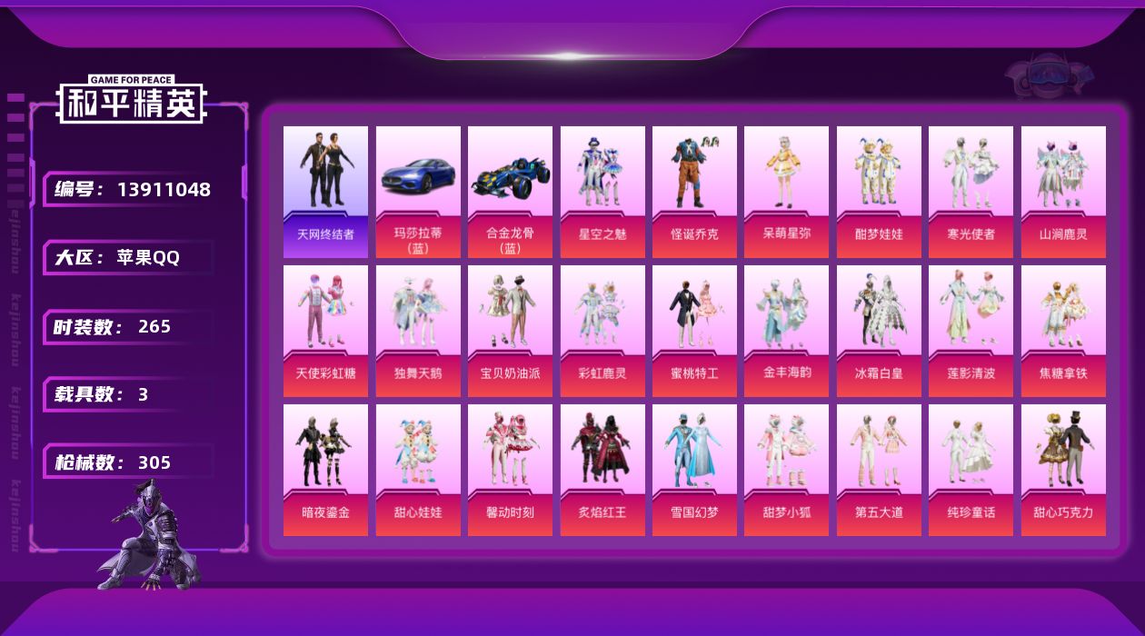 - [8898000]实名: 可修改 时装数: 404 枪械数: 144 战备数: 96 热门装扮: 苍蓝魅影,烈焰拳霸,潮萌小黄鸭,千金淑猫 稀有枪皮: AKM梦之光华,VSS烈焰拳霸,SVD-月影灵韵,Kar98K-巳巳如意 亮点: 3粉装-4特效-0载具-热力值46748-总套装404-总枪皮144-王牌印记7-历史最高超级王牌12星-粉套-苍蓝魅影,粉套-烈焰拳霸,角色-千金淑猫-AKM-梦之光华(7级),Kar98K-巳巳如意(5级),SVD-月影灵韵(4级),VSS-烈焰拳霸(7级)--套装-猎鹰,套装-青年教官,套装-红色运动,套装-黄色运动,套装-蓝色运动,套装-黑色伏地魔,套装-竞技名士,套装-湖蓝色名流,套装-黄色名流,套装-长空猛禽,套装-海岛探路者,套装-冷焰舞者,套装-灼焰舞者,套装-灰色格斗者,套装-滨海假日,套装-冰冻风暴,套装-幻影武者,套装-千禧之恋,套装-怒火燎原,套装-魅力单车,套装-竞技达人朋克,套装-夜莺强袭者,套装-森林游猎者,套装-极地朋克,套装-幻世战舞者,套装-甜蜜熊情侣,套装-缤纷果语,套装-龙魂突击队,套装-风暴特警,套装-冰川特警,套装-元素星魂,套装-格斗先锋,套装-海上生明月,套装-粉红小猪,套装-破蛋小黄鸡,套装-精神漫游,套装-夏日音浪,套装-青春冒险家,套装-潮流游乐家,套装-萌趣颜团子,套装-特种颜团子,套装-战术大师,套装-SS18特训,套装-治愈之星,套装-科技之星,套装-闪银刀客,套装-SS14特训,套装-吉莉礼服,套装-快乐星愿,套装-鹤发童颜,套装-SS15特训,套装-SS16特训,套装-暴风机械师,套装-时空追击者,套装-星辰守护者,套装-暗夜傀儡,套装-SS17特训,套装-醒狮腾龙,套装-瑞龙福将,套装-团圆交子,套装-福星高照,套装-虎虎生威吉莉,套装-SS19特训,套装-沁蓝冰爽,套装-浓情蜜辣,套装-飞驰魅影,套装-音速流光,套装-炫蓝之夏,套装-SS20特训,套装-猎梦纪元,套装-甜心亚梦,套装-虚音幻奏,套装-SS21特训,套装-萌趣咩咩,套装-SS22特训,套装-SS23特训,套装-青玉碎影,套装-