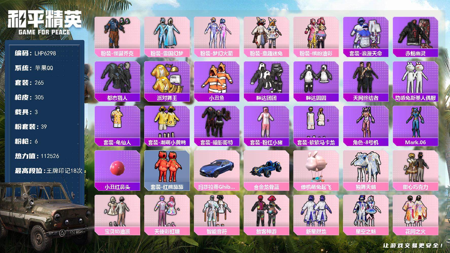 [13911048]【店主推荐捡漏号!可直接换绑】/素材身法号/绝世印记1 苹果 手Q-39粉装-6特效枪-3载具-2粉色飞行器-11.2w热力值-18王牌印记-265套装-305枪皮【热门品类】:粉装-怪诞乔克,粉装-雪国幻梦,粉装-梦幻火箭,粉装-童趣迷兔,粉装-缤纷油彩,套装-浪漫天命,套装-赤蝎幽灵,套装-都市猎人,套装-派对舞王,套装-小丑鱼,套装-胖达团团,套装-胖达圆圆,套装-天网终结者,套装-动感兔斯基人偶服,套装-龟仙人,套装-潮萌小黄鸭,套装-暗影哥特,套装-粉红小猪,套装-软软马卡龙,角色-8号机,角色-Mark.06,小丑红鼻头,套装-红熊茄茄【粉色载具】:玛莎拉蒂Ghibli(蓝),合金龙骨(蓝),僚机-萌兔起飞【粉色套装】:粉装-独舞天鹅,粉装-怪诞乔克,粉装-甜心巧克力,粉装-宝贝奶油派,粉装-天使彩虹糖,粉装-雪国幻梦,粉装-梦幻火箭,粉装-智能音符,粉装-缤纷油彩,粉装-放客神游,粉装-新星烈龙,粉装-星空之魅,粉装-花间之火,粉装-冰霜白皇,粉装-童趣迷兔,粉装-炙焰红王,粉装-馨动时刻,粉装-蜜桃特工,粉装-蝶舞蔷薇,粉装-彩虹鹿灵,粉装-山涧鹿灵,粉装-甜心娃娃,粉装-酣梦娃娃,粉装-焦糖拿铁,粉装-岚岚物语,粉装-甜梦小狐,粉装-暖熊萌萌,粉装-寒光使者,粉装-暗夜鎏金,粉装-第五大道,粉装-心之回忆,粉装-纯珍童话,角色-呆萌星弥,粉装-莲影清波,角色-初号机 觉醒Ver.,粉装-金丰海韵,角色-晶梦幻蝶,粉装-星月云朵,角色-智耀战神【粉色枪皮等级】:SCAR-L-童趣迷兔(七级),M416-五爪金龙(七级),Kar98K-巳巳如意(三级),Kar98K-圣域龙灵(三级),SKS-碧影闪光(四级),DP-28-豹影疾电(五级)【粉色飞行器】:天之羽翼飞行器,圣域金龙飞行器