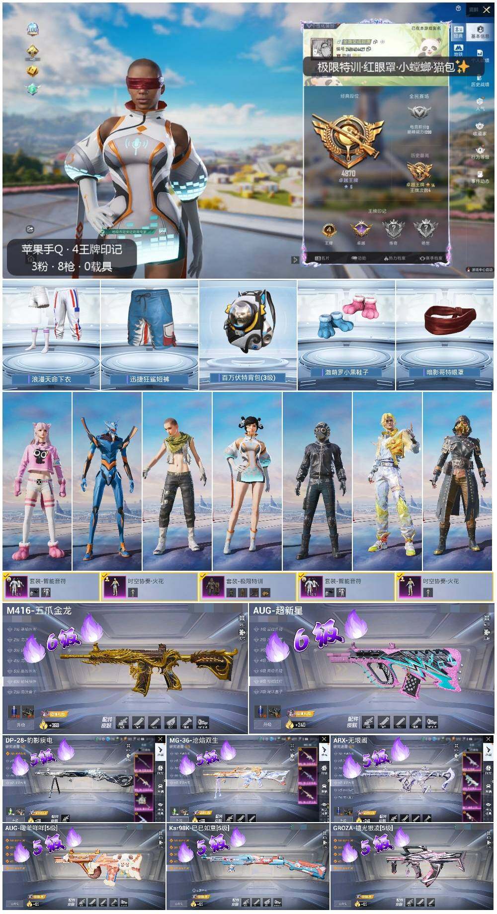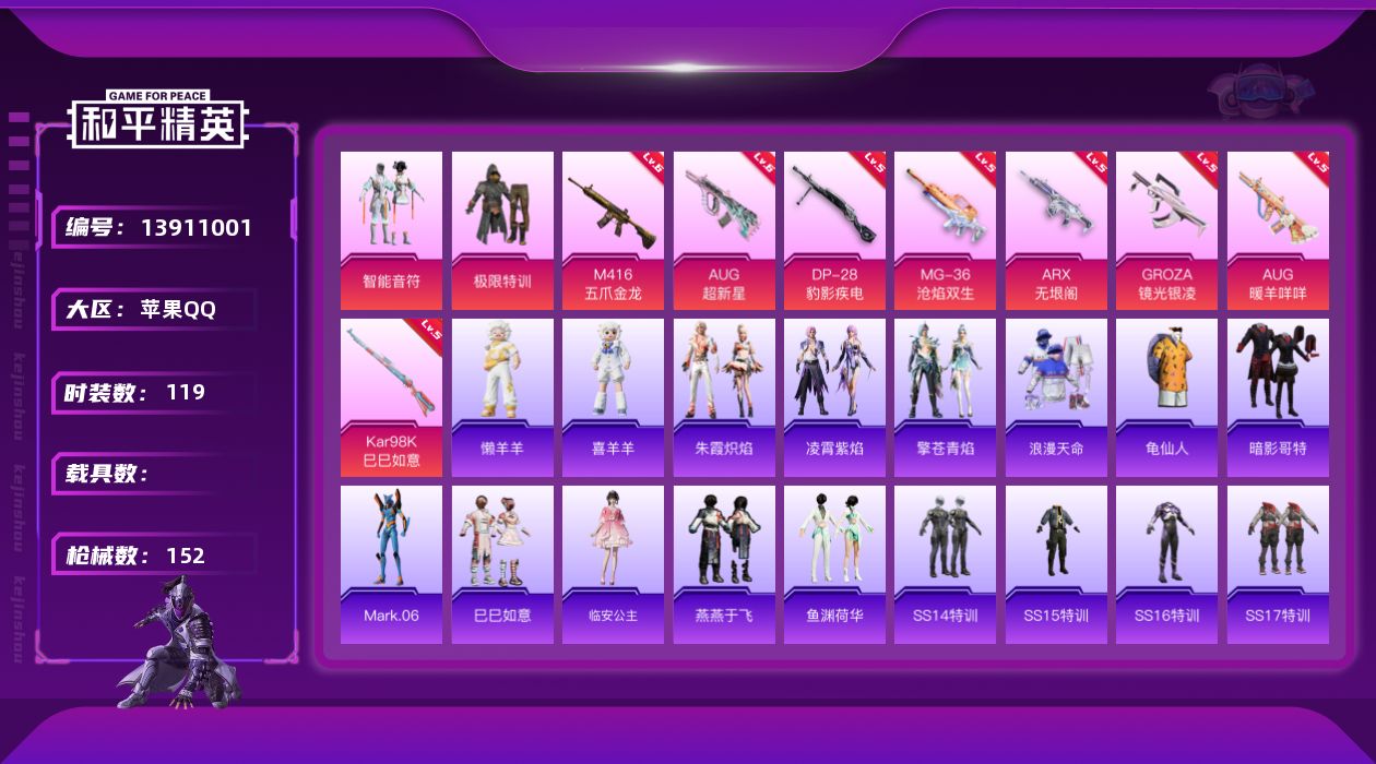 - [11518027]2粉装 9特效枪 1载具 4印记 可二次 可修改实名 身法装备:暗影哥特(红眼罩),Mark.06(新蓝螳螂) 优质装备:宝马M4(圣保罗黄),UMP45量子极限,M762-青锋波束,DP-28-千金淑猫,千金淑猫,GROZA-镜光银凌,MK12-雪月幻音,Kar98K-圣域龙灵,MK14-甜梦熊击,荧海星豚,Kar98K-巳巳如意 热门装扮:鹰眼刺客 稀有枪皮:DP-28-豹影疾电 五级特效枪:五级M762-青锋波束,五级UMP45-量子极限,五级GROZA-镜光银凌,五级Kar98K-巳巳如意,五级MK14-甜梦熊击 四级特效枪:四级DP-28-千金淑猫 三级特效枪:三级Kar98K-圣域龙灵 二级特效枪:二级DP-28-豹影疾电 一级特效枪:一级MK12-雪月幻音 紫色装扮:SS31特训套装,冰川特警,冷焰舞者,SS30特训套装,SS33特训套装,青涩时光,都市魅力,缤纷果语,蓝彩潮人,蓝色运动,蓝海鲸歌,蜜露汐语,魅力单车,黄色伏地魔,黄色运动,黑色伏地魔,冰河战士,龙魂突击队,蝶变,香桃花海,柠萌假日,海岛探路者,幻影武者,白色伏地魔,破蛋小黄鸡,红色运动,猛禽,小熊娃娃,雏菊兔兔,萝兰蝴蝶,SS29特训,多纳泰罗,星途旅人,纯真浪花,热情海星,曼妙人鱼,SS28特训,Mark.06(新蓝螳螂),鱼渊荷华,燕燕于飞,巳巳如意,都市丽猫,青团波波,糖糖葫芦,棉花软糖,绒宝小鹅,摩登魅猫,暗影哥特(红眼罩),街头风暴,芝莓熊熊,SS32特训服(SS32特训套装),荒漠狂战,漫步者 优质战备:奇迹舞步降落伞,守护天翼降落伞,创世·救赎降落伞,精灵梦叶罗丽降落伞,初号机 觉醒Ver.降落伞,星途旅人降落伞,深渊漩涡飞行器,忍者神龟降落伞,金丰海韵降落伞,千金淑猫降落伞,幽焰列车飞行器,幽焰骑士降落伞,齐天大圣降落伞
