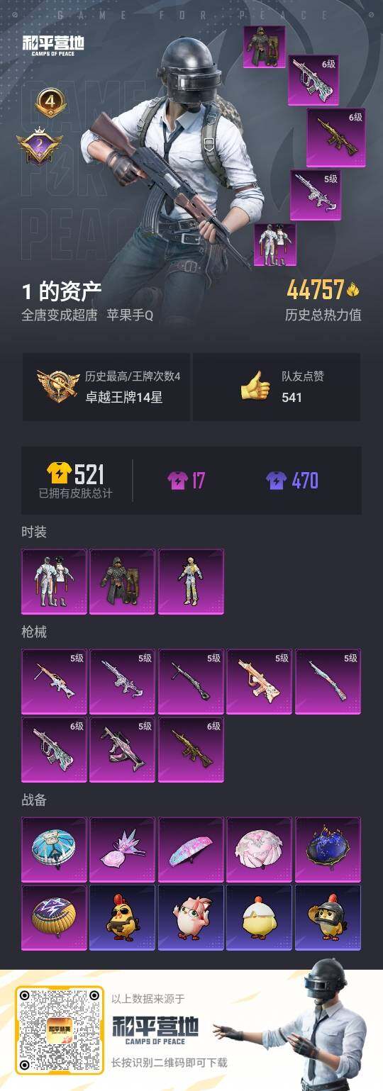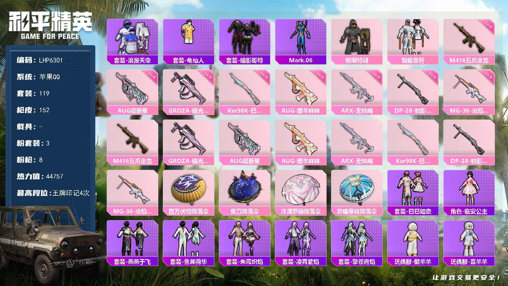 [13911001]【店主推荐捡漏号!可直接换绑】/地铁满天赋 苹果 手Q-3粉装-8特效枪-1粉色飞行器-4.4w热力值-4王牌印记-119套装-152枪皮【热门品类】:套装-浪漫天命,套装-龟仙人,套装-暗影哥特,角色-Mark.06【粉色套装】:粉装-极限特训,粉装-智能音符【粉色枪皮等级】:M416-五爪金龙(六级),GROZA-镜光银凌(五级),AUG-超新星(六级),AUG-暖羊咩咩(五级),ARX-无垠阁(五级),Kar98K-巳巳如意(五级),DP-28-豹影疾电(五级),MG-36-沧焰双生(五级)