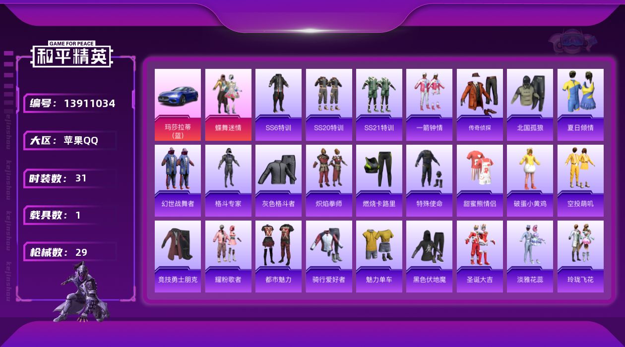 - [12062637]3粉装 6特效枪 12印记 可二次 可修改实名 身法装备:舞王派对(派对舞王、小金鞋),8号机(新粉螳螂) 优质装备:舞王派对(派对舞王、小金鞋),M416心之恋语,洛天依,AKM绿萝繁花,SCAR-L-锦绣绵绵,七级M416-心之恋语,UMP45量子极限,Kar98K-巳巳如意 热门装扮:炫光之旅,金丰海韵,梦魇先生,派对舞王(小金鞋) 稀有枪皮:DP-28-豹影疾电 五级特效枪:五级UMP45-量子极限,五级Kar98K-巳巳如意,五级DP-28-豹影疾电,五级SCAR-L-锦绣绵绵,五级AKM-绿萝繁花 紫色装扮:田园牧歌,轻风白浪,和煦暖阳,SS22特训,SS23特训,幻彩翩翩,妙红点点,娇憨猪猪,萌趣咩咩,SS21特训,绚烂繁星,SS31特训套装,六六大吉,冰川特警,霓虹热舞,旭日情侣,SS30特训套装,SS33特训套装,青涩时光,顶瓜瓜,SS20特训,SS16特训,萌趣颜团子,特种颜团子,猎梦纪元,飞驰魅影,音速流光,SS19特训,竞技角斗士,覆海蛟龙,甜心亚梦,虚音幻奏,瑞龙福将,团圆交子,SS17特训,冰川谧蓝,异彩先驱,SS18特训,都市漫游者,酒红色名流,野性战心,长空猛禽,霓虹极客,霓虹街区,缤纷果语,蓝色运动,虎虎生威吉莉,无面战甲,飞行日记,龙腾端午,骑行爱好者,鹤鸣,黄色名流,黄色运动,黎明保卫者,黑色伏地魔,龙的传人,龟仙人,冰河战士,龙魂突击队,蝶变,香桃花海,柠萌假日,沙漠兵团,活力之心,海岛探路者,滨海假日,幻影武者,幻世战舞者,探宝勇士,湖蓝色名流,滨海厨神,破晓战魂,甜蜜告白,福星高照,空岛之星,空投萌叽,红色运动,王牌教练,灰色格斗者,炫蓝之夏,热血青春,小熊娃娃,雏菊兔兔,萝兰蝴蝶,SS29特训,先驱飞行员,星途旅人,创世·幻影,纯真浪花,热情海星,曼妙人鱼,SS28特训,8号机(新粉螳螂),异域银装,鱼渊荷华,玉兔迎春,燕燕于飞,巳巳如意,风玲,青团波波,糖糖葫芦,棉花软糖,竞技名士,街头风暴,银尘,惊鸿侠骨,SS24特训(SS24特训套装),SS25特训,绝对偶像,金戈铁马,锦衣飞扬,粉红小猪,焰鹰斗篷,幻羽潜行,幽夜迷踪,SS27特训,明鸳圣池,日照花林,SS26特训,春光漫游,快闪甜心,贝斯之夜,智谋强哥,大橘大利,耀粉歌者,春日漫步,粉恋花,蓝冰羽,紫幽梦,SS32特训服(SS32特训套装),瑰梦爱神,绯格组合