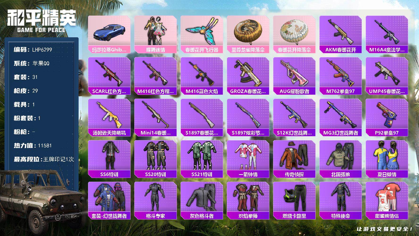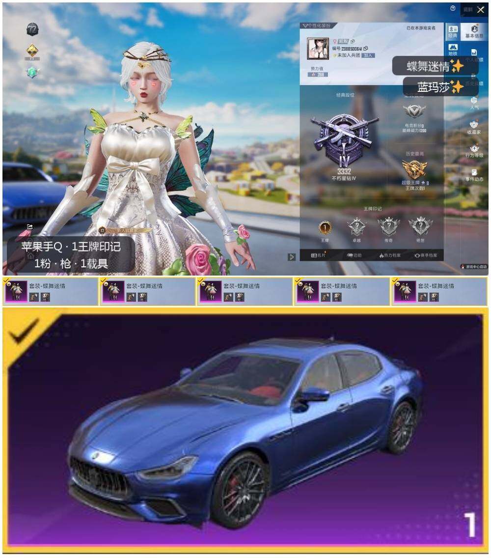 [13911034]苹果 手Q-1粉装-1载具-1粉色飞行器-1.1w热力值-1王牌印记-31套装-29枪皮【粉色载具】:玛莎拉蒂Ghibli(蓝)【粉色套装】:粉装-蝶舞迷情【粉色飞行器】:春暖花开飞行器