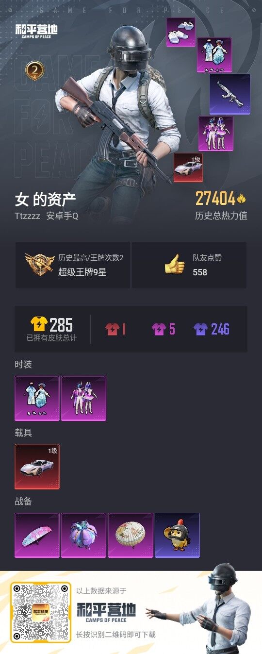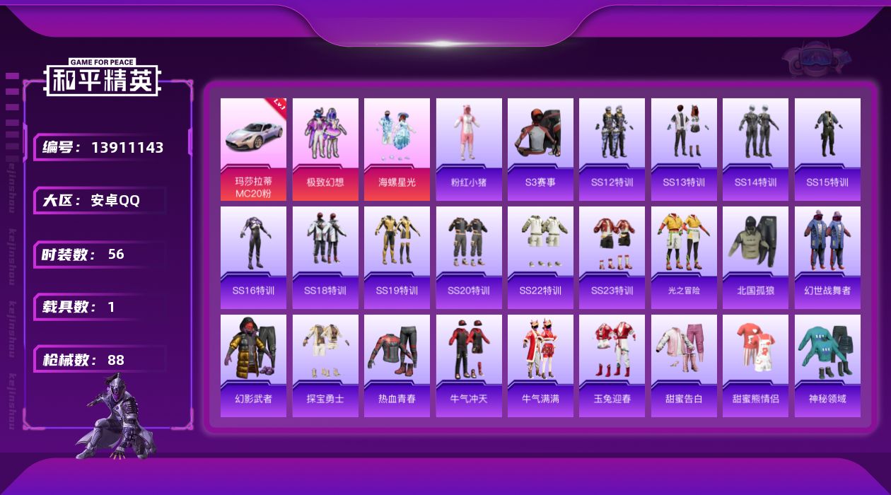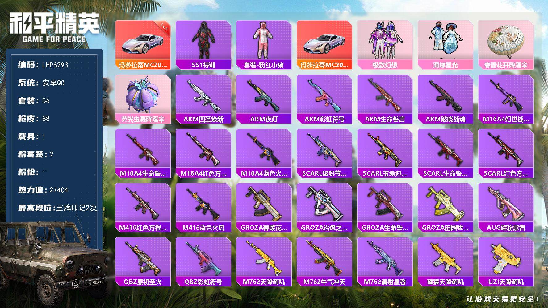 [13911143]【店主推荐捡漏号!可直接换绑】 安卓 手Q-2粉装-1载具-2.7w热力值-2王牌印记-56套装-88枪皮【红色载具】:玛莎拉蒂MC20(幻星粉)(一级)【热门品类】:套装-SS1特训,套装-粉红小猪【粉色载具】:玛莎拉蒂MC20(幻星粉)【粉色套装】:粉装-极致幻想,粉装-海螺星光
