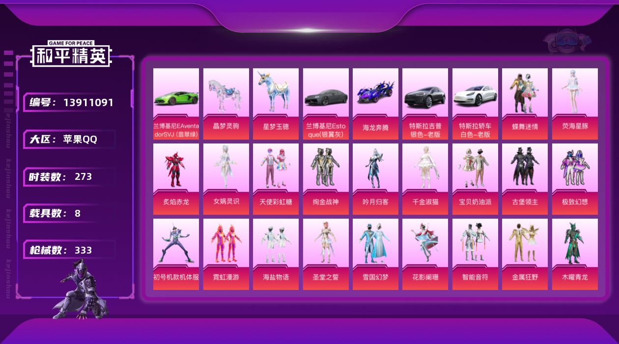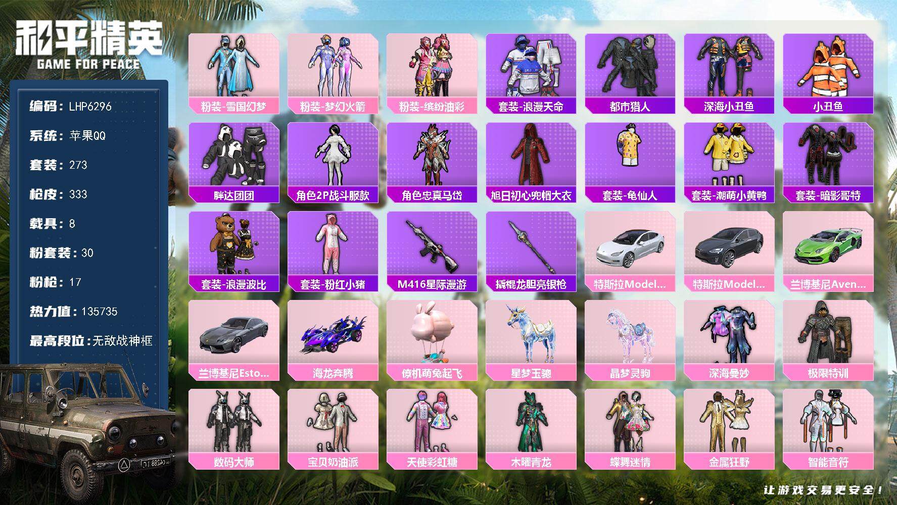 [13911091]【店主推荐捡漏号!可直接换绑】/素材身法号/无敌战神框3/绝世印记1 苹果 手Q-无敌战神框-30粉装-17特效枪-8载具-11粉色飞行器-13.5w热力值-23王牌印记-273套装-333枪皮【热门品类】:粉装-雪国幻梦,粉装-梦幻火箭,粉装-缤纷油彩,套装-浪漫天命,套装-都市猎人,套装-深海小丑鱼,套装-小丑鱼,套装-胖达团团,角色-2P战斗服款,角色-忠真马岱,旭日初心兜帽大衣,套装-龟仙人,套装-潮萌小黄鸭,套装-暗影哥特,套装-浪漫波比,套装-粉红小猪,M416-星际漫游,撬棍-龙胆亮银枪【粉色载具】:特斯拉Model 3(珍珠白),特斯拉Model X(冷光银),兰博基尼Aventador SVJ(翡翠绿),兰博基尼Estoque(银翼灰),海龙奔腾,僚机-萌兔起飞,星梦玉骢,晶梦灵驹【粉色套装】:粉装-深海曼妙,粉装-极限特训,粉装-数码大师,粉装-宝贝奶油派,粉装-天使彩虹糖,粉装-木曜青龙,粉装-雪国幻梦,粉装-蝶舞迷情,粉装-梦幻火箭,粉装-金属狂野,粉装-智能音符,粉装-缤纷油彩,粉装-放客神游,粉装-古堡领主,粉装-极致幻想,粉装-绚金战神,粉装-炙焰赤龙,粉装-飓风飞鹰,粉装-齐天大圣,粉装-花影阑珊,粉装-吟月归客,角色-初号机款机体服,粉装-海盐物语,角色-圣堂之誓,粉装-霓虹漫游,角色-光极星,角色-千金淑猫,角色-女娲灵识,角色-樱桃泡泡,角色-荧海星豚【粉色枪皮等级】:AKM-甜心宝贝(七级),AKM-炫紫旋律(一级),AKM-梦之光华(一级),SCAR-L-锦绣绵绵(五级),M416-五爪金龙(六级),M416-风花雪月(一级),M416-电玩时刻(五级),GROZA-焦糖拿铁(七级),UMP45-雪国精灵(七级),AKS-74U-信仰神谕(七级),Kar98K-巳巳如意(五级),M24-暗星紫秘(五级),Mini14-龙虾霸霸(五级),Mk14-樱桃泡泡(七级),DP-28-豹影疾电(五级),MG3-酷泡奶龙(七级),烟雾弹-电雾迷城(四级)【粉色飞行器】:深海曼妙飞行器,炫紫旋律飞行器,神秘黑猫飞行器,古堡领主飞行器,齐天大圣飞行器,风花雪月飞行器,天之羽翼飞行器,沙丘之主天马,繁龙极客飞行器,镜域双华-灵镜之阶