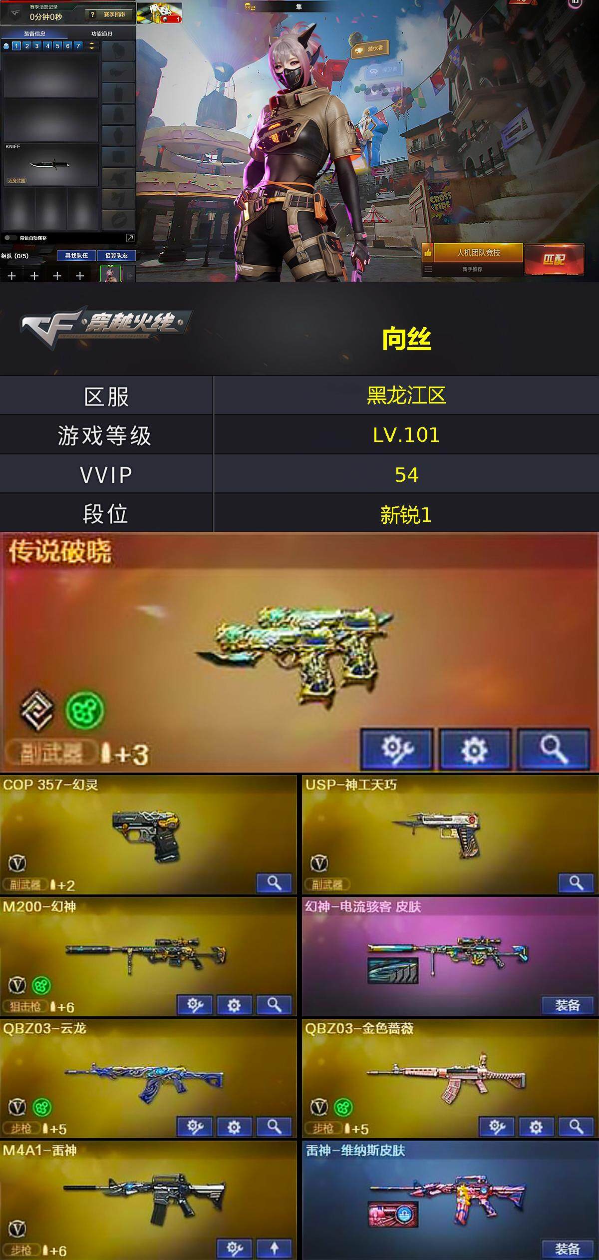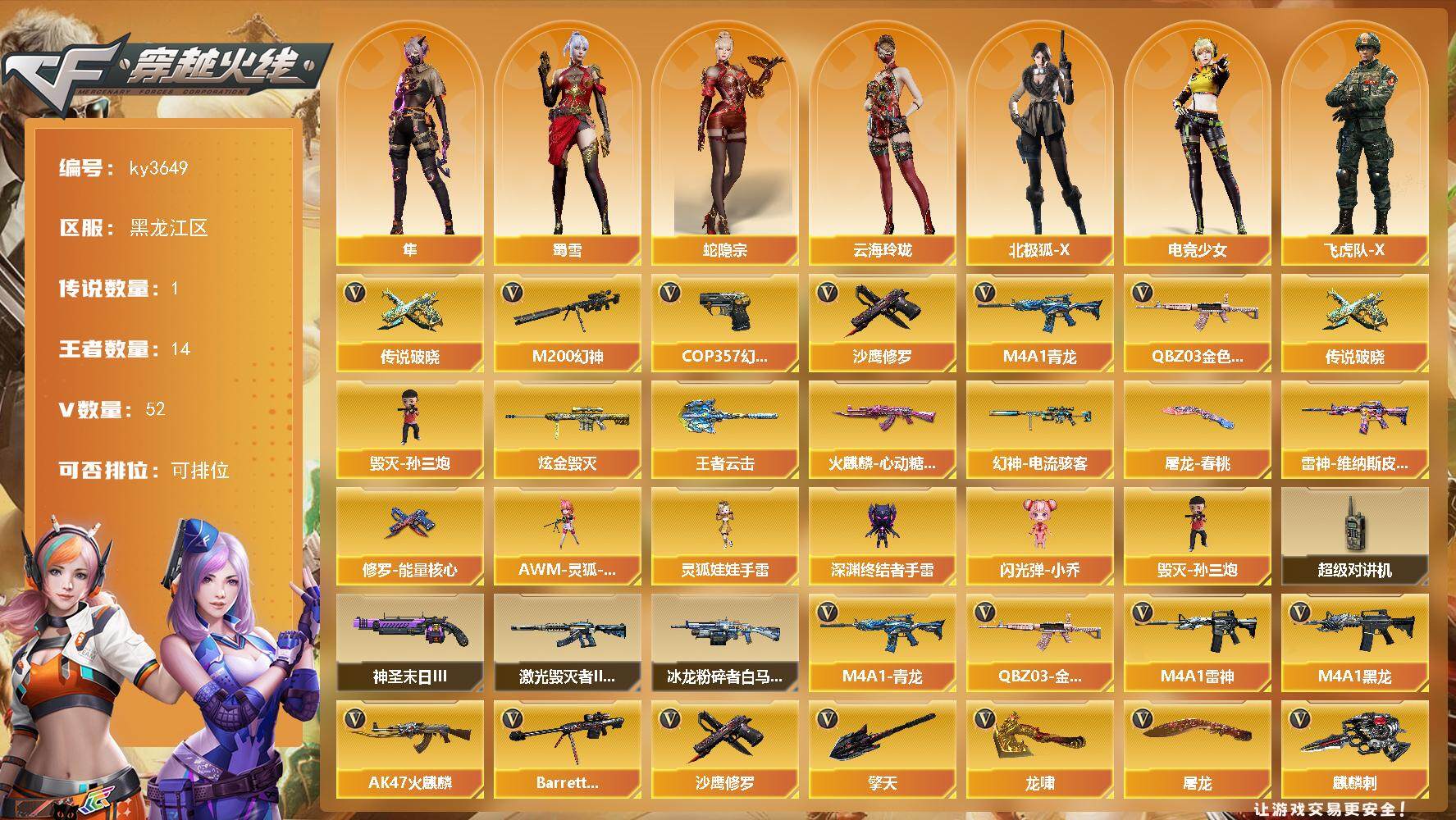 [13914780]黑龙江区-52V-14王者-1炫金 【传说武器】:传说破晓 【热门武器】:传说破晓,QBZ03-金色蔷薇,M4A1-青龙,M200-幻神,毁灭-孙三炮,COP 357-幻灵,沙鹰-修罗 【王者炫金武器】:王者云击,炫金毁灭 【皮肤】:幻神-电流骇客 皮肤,雷神-维纳斯皮肤,火麒麟-心动糖果,修罗-能量核心,屠龙-春桃 皮肤 【角色】:隼,蛇隐宗,云海玲珑,北极狐-X,电竞少女,飞虎队-X,风暴女*2,虎妞,嘉年华灵狐,灵狐-花神,灵狐者-X,灵狐者-七夕宝贝,潘多拉-X,潜龙队-X,蛇姬,斯沃特-X,蜀雪,维纳斯,夜玫瑰-幻能朋克,影武者-X,游珑儿 【人偶武器】:毁灭-孙三炮,AWM-灵狐-15周年嘉年华,深渊终结者手雷,闪光弹-小乔,灵狐娃娃手雷*2 【暴走生化】:超级对讲机 【挑战大师】:冰龙粉碎者-白马银枪,激光毁灭者III-白马银枪*2,神圣爆裂者-末日III 【英雄级武器】:AK47-火麒麟,M4A1-黑龙,M4A1-雷神,M4A1-青龙,M4A1-神工天巧,无影-神兵利器,QBZ03-云龙,黑武士-锦绣游龙,QBZ03-金色蔷薇,王者之武-觉醒版,Barrett-毁灭,M200-幻神,炼狱-悦蓝-觉醒版,沙鹰-修罗,COP 357-幻灵,USP-神工天巧,屠龙,龙啸,擎天,麒麟刺,唐刀-神工天巧,擎天-云海游龙,高爆手雷-幻灵*3,高爆手雷-神工天巧*6,手雷-云海游龙,高爆手雷-古蛇迷踪,闪光弹-竞技荣光*2,闪光弹-神工天巧*6,闪光弹-云龙*2,闪光弹-雷霆王者-觉醒版*4,烟雾弹-幻灵,烟雾弹-神工天巧*7,烟雾弹-云龙,烟雾弹-古蛇迷踪,烟雾弹-雷霆王者-觉醒版*2 【道具】:CFS限定背包,全能枪王背包,战舰背包,炫彩背包,超级背包,夺命之镰,防化服,金色流光-枪王排位*2,星辰流光-枪王排位,巅峰赛先锋-金色流光,枪王排位28赛季金色流光,枪王排位29赛季金色流光,云海游龙表情,EP战队名片,EP战队喷图,EP战队击杀图标*2,防弹头盔,防弹衣,C4工具钳,手雷包 【特殊枪械】:
