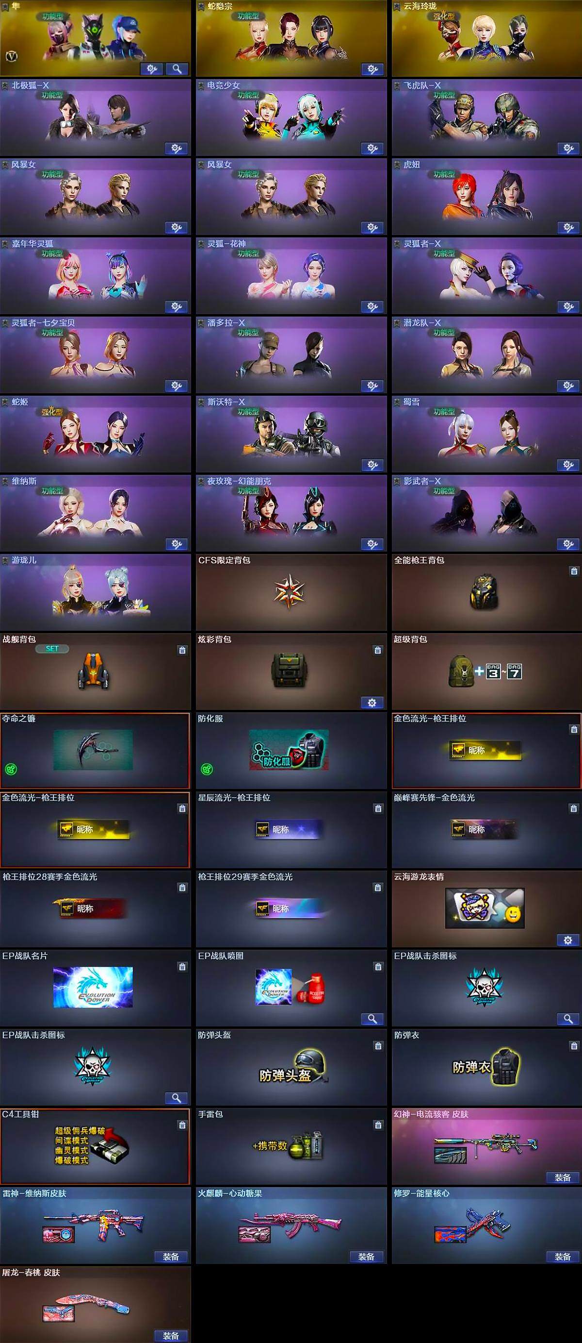 【道具】:CFS限定背包,全能枪王背包,战舰背包,炫彩背包,超级背包,夺命之镰,防化服,金色流光-枪王排位*2,星辰流光-枪王排位,巅峰赛先锋-金色流光,枪王排位28赛季金色流光,枪王排位29赛季金色流光,云海游龙表情,EP战队名片,EP战队喷图,EP战队击杀图标*2,防弹头盔,防弹衣,C4工具钳,手雷包