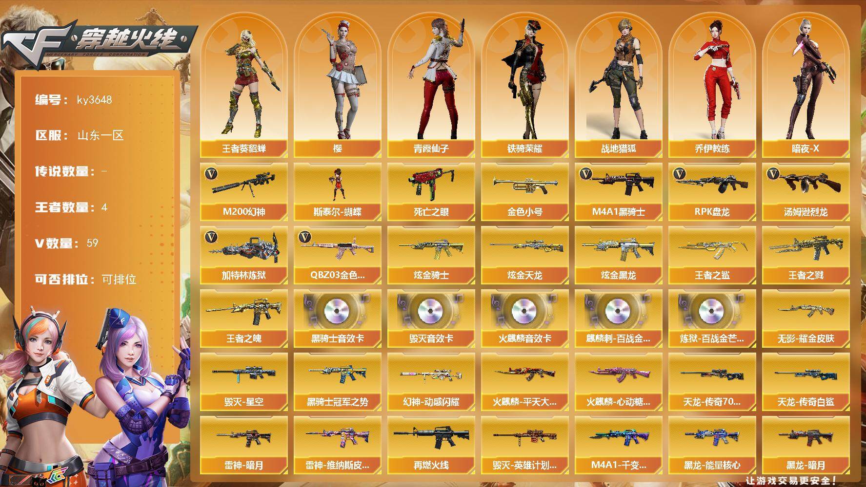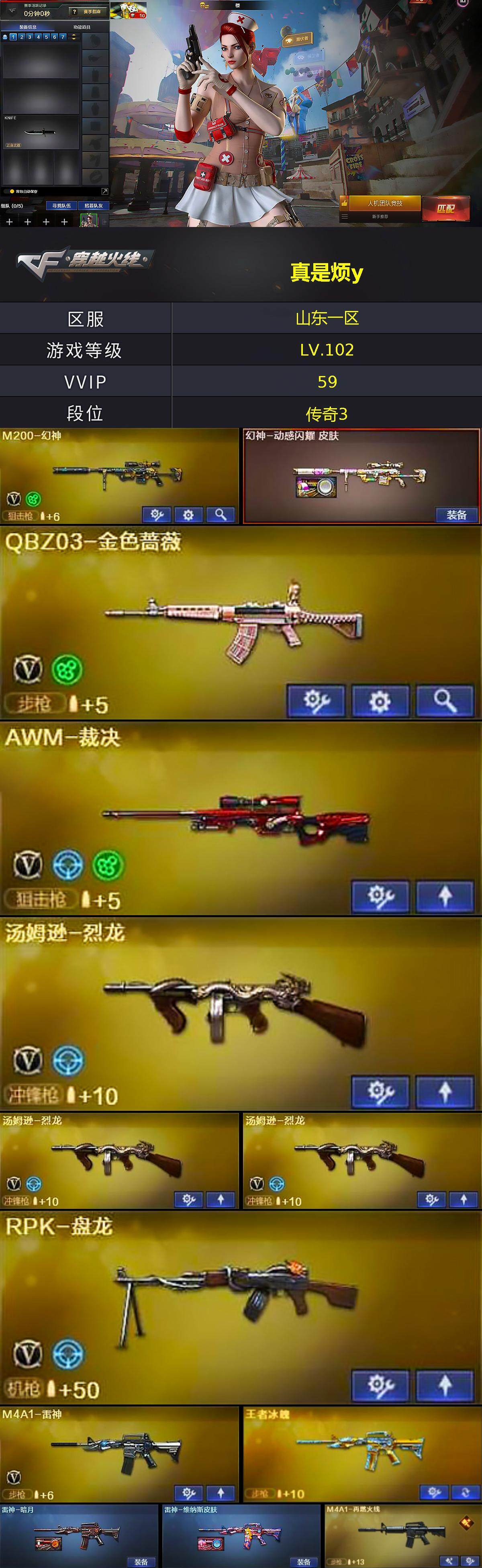 [13914945]山东一区-59V-4王者-3炫金 【热门武器】:QBZ03-金色蔷薇,M200-幻神,死亡之眼,金色小号,M4A1-黑骑士,汤姆逊-烈龙*3,RPK-盘龙,加特林-炼狱*2,斯泰尔-蝴蝶 【王者炫金武器】:王者之鲨,王者之戮,王者之魄,炫金骑士,炫金黑龙,炫金天龙 【音效卡】:AK47-火麒麟音效卡,M4A1-黑骑士音效卡,Barrett-毁灭音效卡,麒麟刺-百战金芒-盛典舞曲音效卡,炼狱-百战金芒-庆典舞曲音效卡 【皮肤】:幻神-动感闪耀 皮肤,雷神-暗月,雷神-维纳斯皮肤,M4A1-再燃火线,火麒麟-平天大圣,火麒麟-心动糖果,毁灭-星空,毁灭-英雄计划 皮肤,M4A1-千变-孔明皮肤,黑龙-能量核心,黑龙-暗月*2,黑骑士-冠军之势,无影耀金皮肤,战神-粉色甜心皮肤*5,战神-紫绶金章皮肤*7,战神-流金岁月皮肤*6,AK47-B-常胜将军-刘备,AWM-天龙-传奇70KG,AWM-天龙-传奇白鲨,极光-能量核心,轻型军用手斧-再燃火线 【角色】:樱,战地猎狐,王者-葵-貂蝉,乔伊教练,暗夜-X,初恋灵狐,芳心审判者,风暴女,娟娟,灵狐-花神,麻雀,曼陀罗-礼服,潜龙队-X,青霞仙子,斯沃特-X,铁骑荣耀,兔囡囡,维纳斯,雪莉杨-摸金校尉,樱-战斗天使 【人偶武器】:斯泰尔-蝴蝶,迷你深渊冰龙,迷你裂空之翼,迷你牛魔王,迷你波特博士,迷你曼提柯尔,夺魂,迷你牛牛*2,迷你火种,迷你生化手雷*2,闪光弹-小乔,迷你巨石泰坦-魔花研究所,灵狐娃娃手雷 【暴走生化】:死亡之眼 【挑战大师】:冰龙粉碎者-白马银枪,激光毁灭者III-白马银枪,VEPR-12-金魔,激光毁灭者III,机甲撕裂者III,试炼破坏者III,KAC-圣炎切割者III,神圣爆裂者-末日III,阐释者III 【英雄级武器】:AK47-火麒麟*4,M4A1-黑龙*2,M4A1-雷神,M4A1-黑骑士,AK47-无影,AK47-黑鲨,M4A1-龙血*3,QBZ03-金色蔷薇,烈火-动感闪耀,AK-47-猩红传说*8,AK47-B-战神,黑骑士-海王,AWM-天龙,Barrett-毁灭,Barrett-极光,AWM-裁决,M200-幻神,RPK-盘龙,加特林-炼狱*2,炼狱-百战金芒,汤姆逊-烈龙*3,沙鹰-天神*2,天神-动感闪耀,屠龙,麒麟刺-堕天神,擎天,屠龙-动感闪耀*2,麒麟刺-百战金芒,高