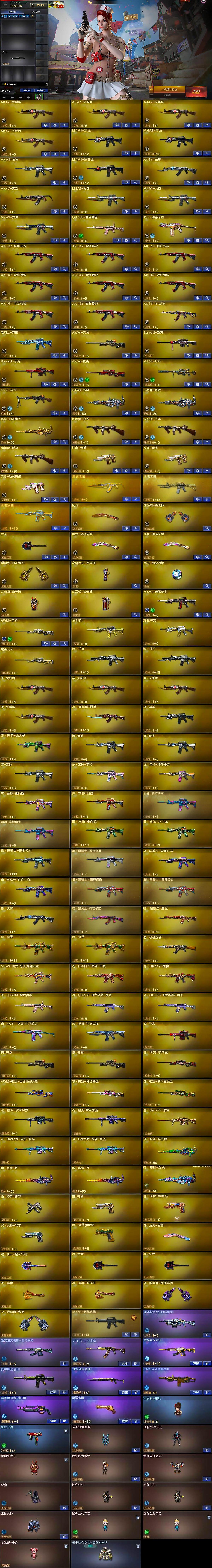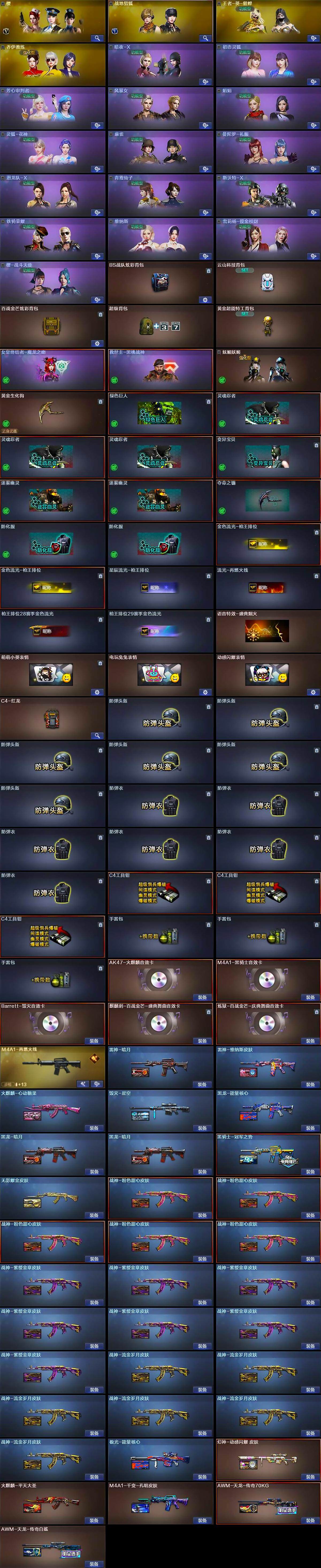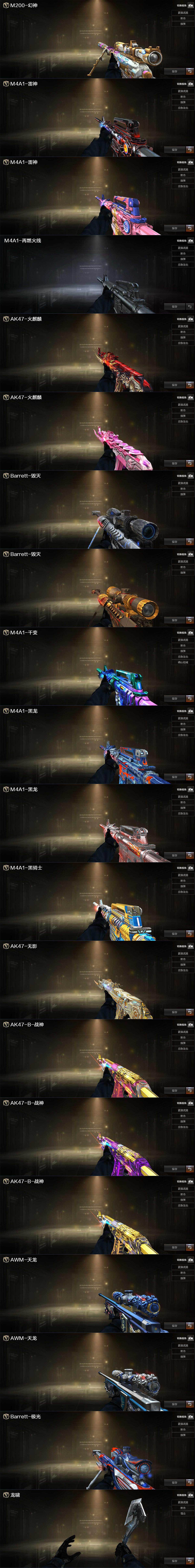 【英雄级武器】:AK47-火麒麟*4,M4A1-黑龙*2,M4A1-雷神,M4A1-黑骑士,AK47-无影,AK47-黑鲨,M4A1-龙血*3,QBZ03-金色蔷薇,烈火-动感闪耀,AK-47-猩红传说*8,AK47-B-战神,黑骑士-海王,AWM-天龙,Barrett-毁灭,Barrett-极光,AWM-裁决,M200-幻神,RPK-盘龙,加特林-炼狱*2,炼狱-百战金芒,汤姆逊-烈龙*3,沙鹰-天神*2,天神-动感闪耀,屠龙,麒麟刺-堕天神,擎天,屠龙-动感闪耀*2,麒麟刺-百战金芒,高