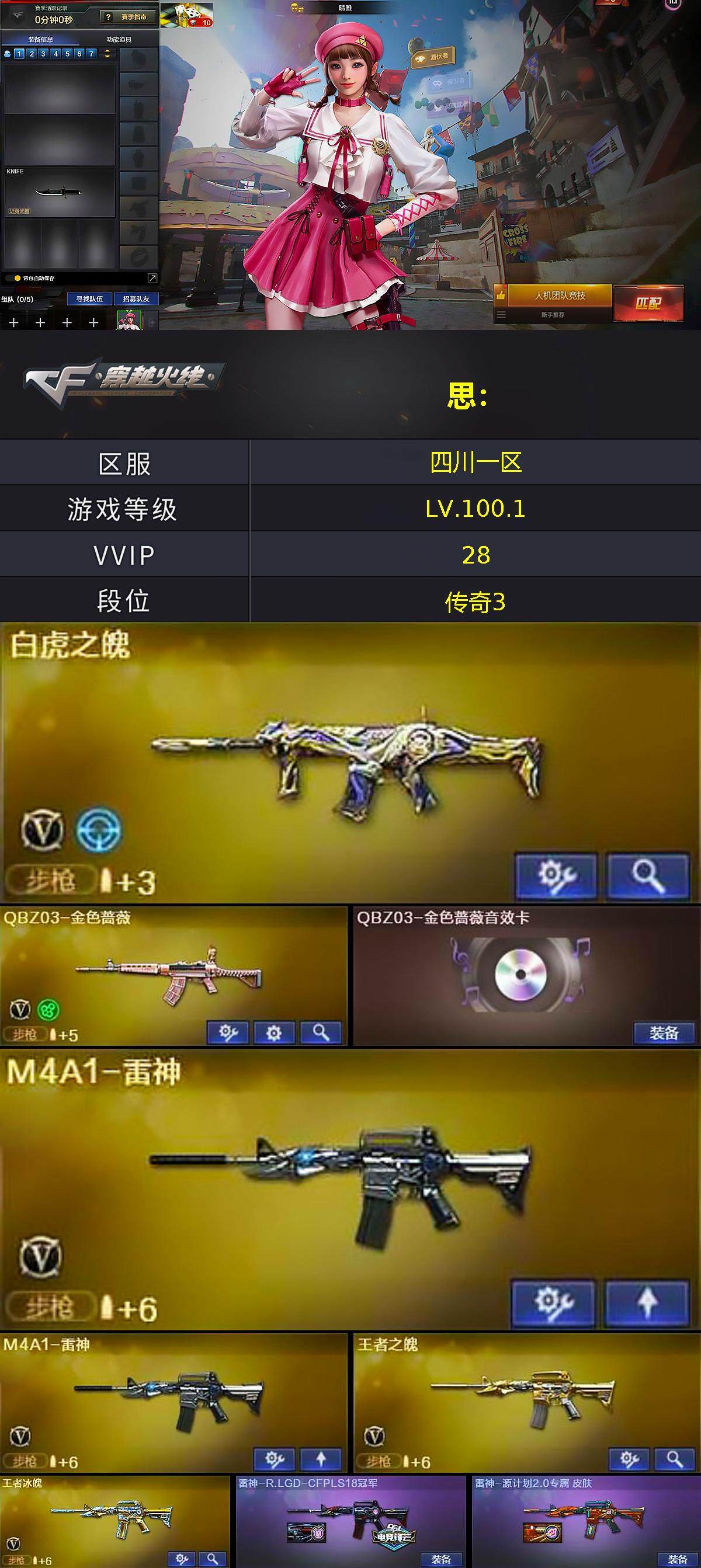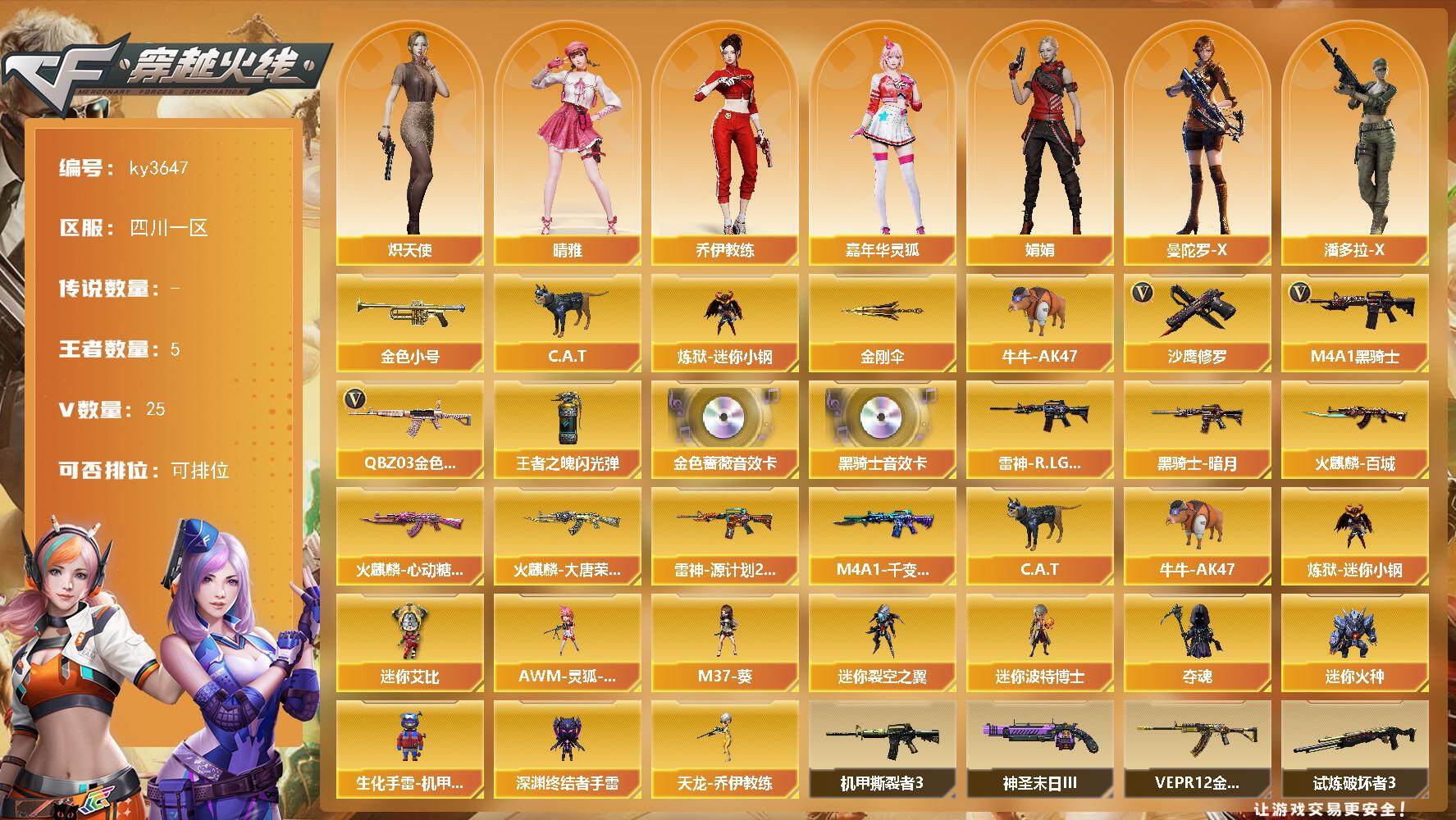 [13915369]四川一区-25V-5王者-0炫金 【热门武器】:QBZ03-金色蔷薇,金色小号,C.A.T,炼狱-迷你小钢*2,牛牛-AK47,M4A1-黑骑士*2,沙鹰-修罗*2,金刚伞 【王者炫金武器】:王者之魄闪光弹 【音效卡】:M4A1-黑骑士音效卡,QBZ03-金色蔷薇音效卡 【皮肤】:雷神-R.LGD-CFPLS18冠军,雷神-源计划2.0专属 皮肤,火麒麟-百城,火麒麟-大唐荣光,火麒麟-心动糖果,M4A1-千变-孔明皮肤,黑骑士-暗月 【角色】:晴雅,乔伊教练,炽天使,嘉年华灵狐,娟娟,曼陀罗-X,潘多拉-X,潘多拉-甜心教官,斯沃特-X,雪莉杨-摸金校尉 【人偶武器】:炼狱-迷你小钢*2,天龙-乔伊教练,AWM-灵狐-15周年嘉年华,M37-葵,C.A.T,牛牛-AK47,迷你裂空之翼,迷你波特博士*3,夺魂,迷你火种,生化手雷-机甲核心,深渊终结者手雷,迷你艾比 【挑战大师】:VEPR-12-金魔,机甲撕裂者III,试炼破坏者III,神圣爆裂者-末日III,阐释者III*2 【英雄级武器】:AK47-火麒麟,M4A1-雷神*2,M4A1-黑骑士*2,AK47-黑武士,无影-神兵利器,黑武士-锦绣游龙,QBZ03-金色蔷薇,烈火-动感闪耀,王者之魄-觉醒版,王者之势-觉醒版,王者冰魄-觉醒版,白虎之魄-觉醒版,沙鹰-修罗*2,天神-动感闪耀,屠龙-动感闪耀,高爆手雷-神工天巧*2,手雷-动感闪耀,闪光弹-神工天巧*2,烟雾弹-神工天巧*2 【道具】:CFS限定背包,亚洲杯纪念炫彩背包,全能枪王背包,炫彩背包-诺拉,超级背包,女皇终结者-魔龙之吻,绿色巨人,灵魂忍者,迷雾幽灵,夺命之镰,防化服*2,金色流光-枪王排位*2,星辰流光-枪王排位,流光-鎏金之域,枪王排位28赛季金色流光,动感闪耀表情,EP战队名片,EP战队喷图,防弹头盔*2,防弹衣*2,C4工具钳*2,手雷包*2 【特殊枪械】:2黑骑士