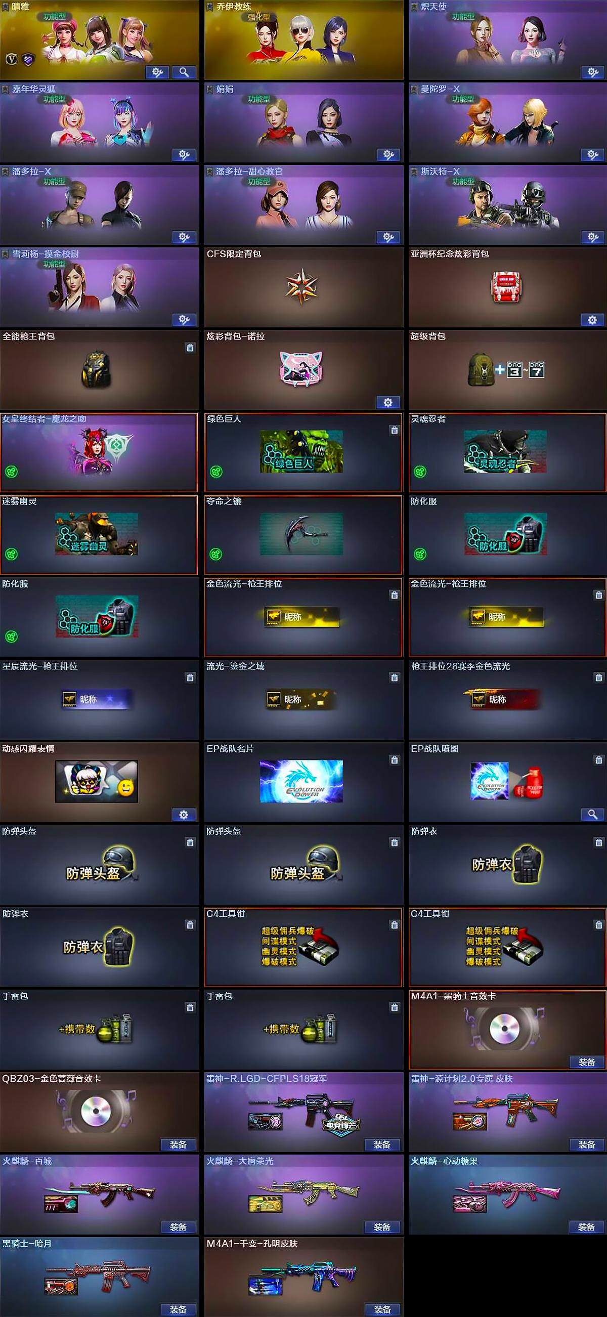 【道具】:CFS限定背包,亚洲杯纪念炫彩背包,全能枪王背包,炫彩背包-诺拉,超级背包,女皇终结者-魔龙之吻,绿色巨人,灵魂忍者,迷雾幽灵,夺命之镰,防化服*2,金色流光-枪王排位*2,星辰流光-枪王排位,流光-鎏金之域,枪王排位28赛季金色流光,动感闪耀表情,EP战队名片,EP战队喷图,防弹头盔*2,防弹衣*2,C4工具钳*2,手雷包*2