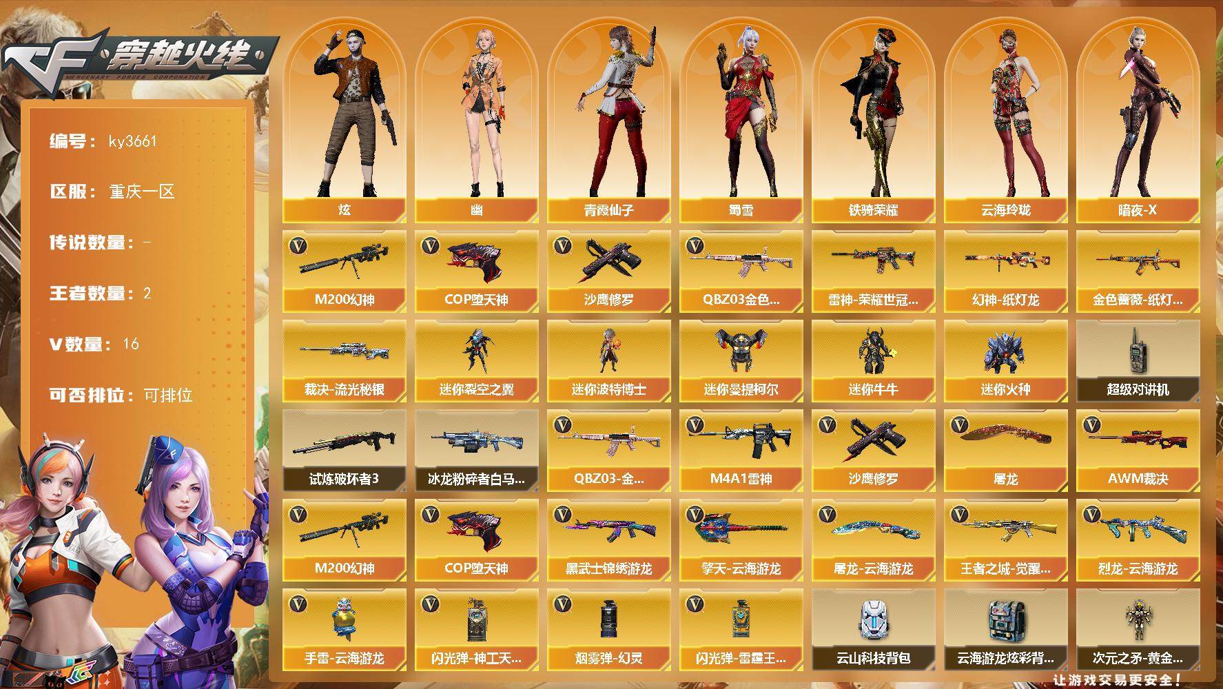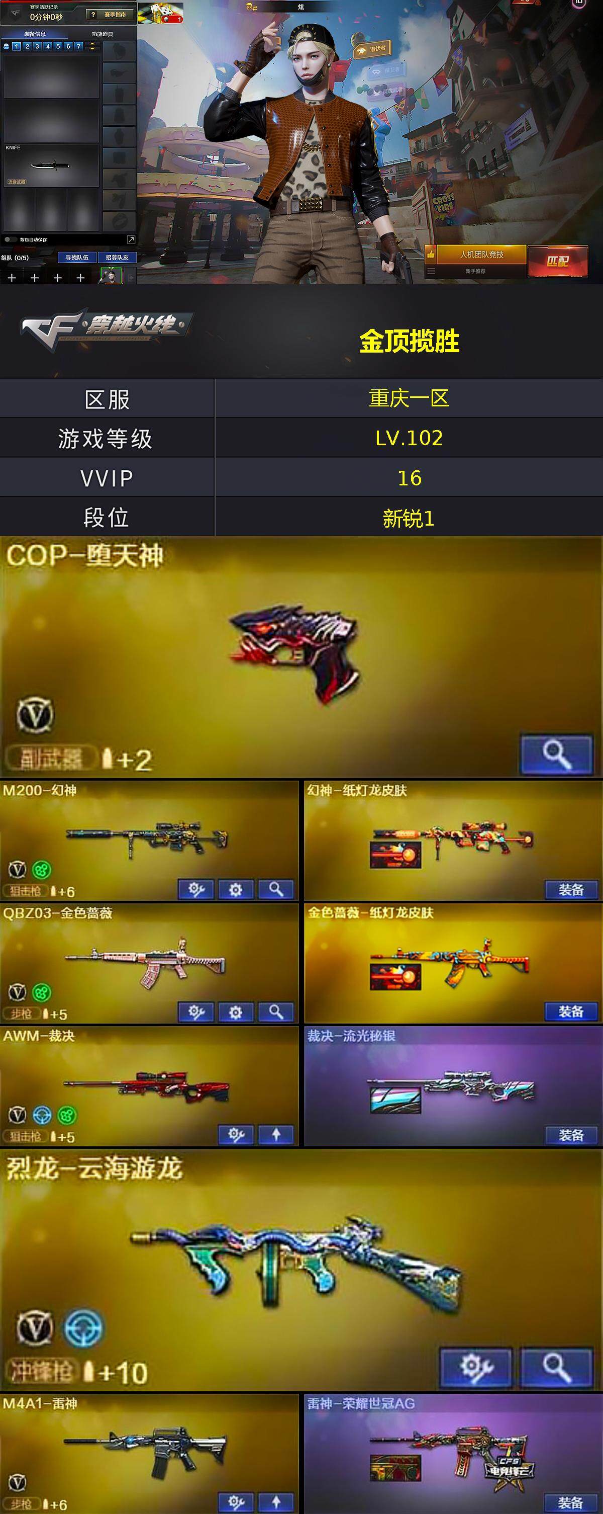 [13915788]重庆一区-16V-2王者-0炫金 【热门武器】:QBZ03-金色蔷薇,M200-幻神,COP-堕天神,沙鹰-修罗 【皮肤】:幻神-纸灯龙皮肤,金色蔷薇-纸灯龙皮肤,裁决-流光秘银,雷神-荣耀世冠AG 【角色】:炫,云海玲珑,暗夜-X,初恋灵狐,芳心审判者,风暴女,虎妞,嘉年华灵狐,娟娟,兰-新年限定,灵狐者-X,灵狐者-黄金海岸,灵狐者-七夕宝贝,龙儿-小淘气,女战神,潘多拉-X,潘多拉-甜心教官,青霞仙子,斯沃特-X,蜀雪,铁骑荣耀,樱-战斗天使,影武者-X,幽,游珑儿 【人偶武器】:迷你裂空之翼,迷你波特博士,迷你曼提柯尔,迷你牛牛,迷你火种 【暴走生化】:超级对讲机 【挑战大师】:冰龙粉碎者-白马银枪,试炼破坏者III 【英雄级武器】:M4A1-雷神,黑武士-锦绣游龙,QBZ03-金色蔷薇,王者之城-觉醒版,AWM-裁决,M200-幻神,烈龙-云海游龙,沙鹰-修罗,COP-堕天神,屠龙,擎天-云海游龙,屠龙-云海游龙,手雷-云海游龙,闪光弹-神工天巧,闪光弹-雷霆王者-觉醒版,烟雾弹-幻灵 【道具】:云山科技背包,云海游龙炫彩背包,次元之矛-黄金背包,虎牙炫彩背包,女皇终结者-魔龙之吻,救世主-黑桃战神,绿色巨人,灵魂忍者,迷雾幽灵,夺命之镰,防化服*3,金色流光-枪王排位,星辰流光-枪王排位,枪王排位28赛季金色流光,语音特效-机器人,云海游龙表情,防弹头盔*3,防弹衣*3,C4工具钳*3,手雷包*3 【特殊枪械】: