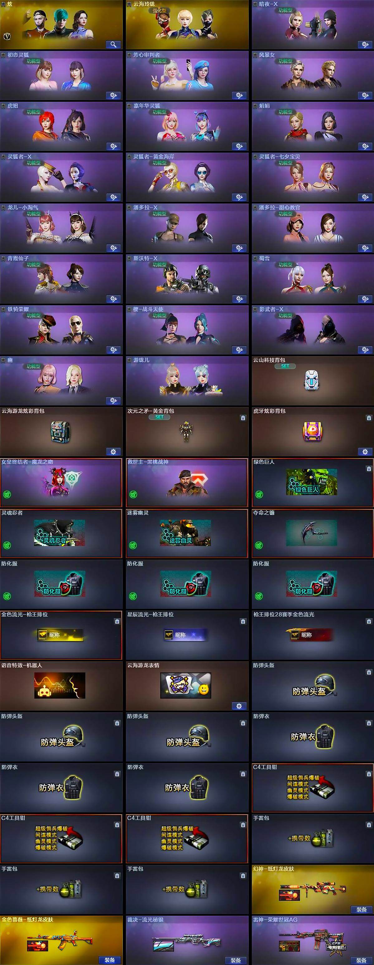 【道具】:云山科技背包,云海游龙炫彩背包,次元之矛-黄金背包,虎牙炫彩背包,女皇终结者-魔龙之吻,救世主-黑桃战神,绿色巨人,灵魂忍者,迷雾幽灵,夺命之镰,防化服*3,金色流光-枪王排位,星辰流光-枪王排位,枪王排位28赛季金色流光,语音特效-机器人,云海游龙表情,防弹头盔*3,防弹衣*3,C4工具钳*3,手雷包*3