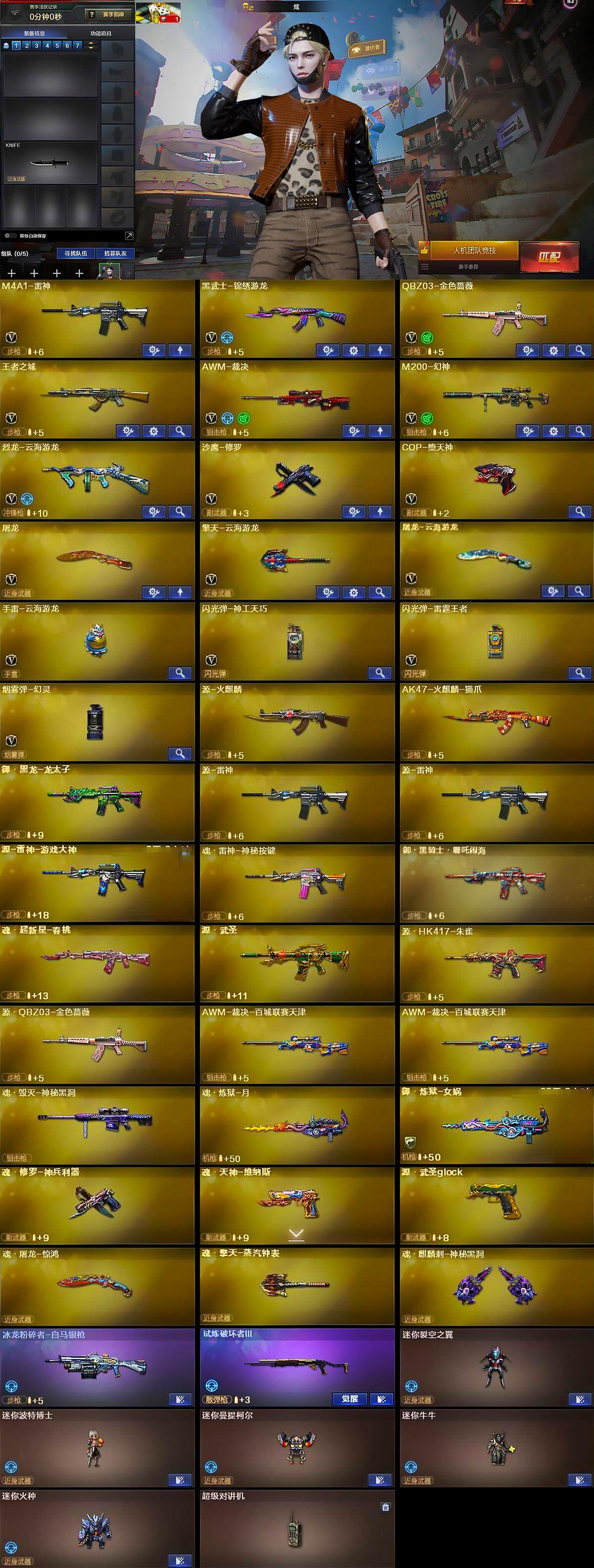 【英雄级武器】:M4A1-雷神,黑武士-锦绣游龙,QBZ03-金色蔷薇,王者之城-觉醒版,AWM-裁决,M200-幻神,烈龙-云海游龙,沙鹰-修罗,COP-堕天神,屠龙,擎天-云海游龙,屠龙-云海游龙,手雷-云海游龙,闪光弹-神工天巧,闪光弹-雷霆王者-觉醒版,烟雾弹-幻灵