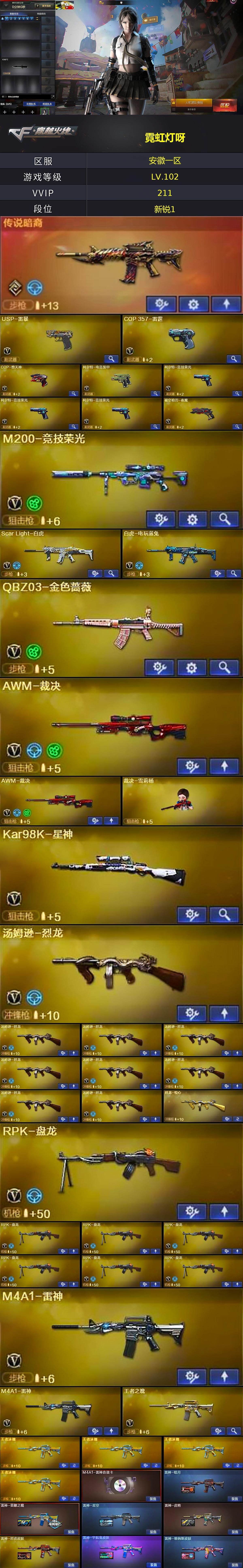 [13916274]安徽一区-210V-22王者-7炫金 【传说武器】:传说暗裔 【热门武器】:传说暗裔,QBZ03-金色蔷薇,Scar Light-白虎,HK417-朱雀,M200-竞技荣光,死亡之眼,白虎-电玩蓝兔,Kar98K-星神,M4A1-黑骑士*5,汤姆逊-烈龙*9,RPK-盘龙*7,加特林-炼狱*5,斯泰尔-蝴蝶,MK5-炽火炎龙,羊驼玩偶,裁决-雪莉杨,USP-雷暴,COP-堕天神,沙鹰-修罗*3 【王者炫金武器】:王者之势,王者之魄*4,王者之怒,烈龙-悦心,王者之灵*4,炫金骑士*3,炫金毁灭*3,炫金修罗 【音效卡】:AK47-火麒麟音效卡,M4A1-雷神音效卡,M4A1-黑骑士音效卡,Barrett-毁灭音效卡,绝迹语音包 【皮肤】:雷神-暗月,雷神-荣耀之魄,雷神-星空,雷神-虎将,雷神-烈虎皮肤,雷神-宇航兔皮肤,雷神-维纳斯皮肤,火麒麟-雷神,火麒麟-冠军之心,AK47-火麒麟-传奇EVEN,火麒麟-战神关羽,火麒麟-平天大圣*2,火麒麟-百城,火麒麟-心动糖果,毁灭耀金皮肤,毁灭-冠军之怒,毁灭-黑大圣皮肤,毁灭-风暴,毁灭-航天科技皮肤,黑龙-能量核心,黑龙-暗月,黑骑士-暗月*3,无影-暗月*3,AK47-黑武士-361,战神-粉色甜心皮肤,战神-紫绶金章皮肤,战神-流金岁月皮肤,AK47-B-常胜将军-孙权*3,天龙-能量核心,AWM-天龙-传奇70KG,AWM-天龙-传奇白鲨,修罗-能量核心*2,修罗-星空 【角色】:零,葵,瞳,炫,电竞教官-云悠悠,王者-瞳-闭月羞花,王者-葵-貂蝉,王者-魅影,乔伊教练,修道士,空,暗夜-X,初恋灵狐,芳心审判者,风暴女,虎妞,嘉年华灵狐,娟娟,兰-空鹰,兰-新年限定,灵狐-花神,灵狐者-黄金海岸,灵狐者-七夕宝贝,龙儿-小淘气,麻雀,潘多拉-X,潜龙队-X,斯沃特-X,铁骑荣耀,兔囡囡,维纳斯,新娜塔莎,雪莉杨-摸金校尉,樱-战斗天使,影武者-X,游珑儿,职业选手 【人偶武器】:裁决-雪莉杨,天龙-曼陀罗,火麒麟-灵狐*3,M4A1-雷神-精英刀锋,MK5-炽火炎龙,斯泰尔-蝴蝶,AWM-灵狐-15周年嘉年华,M37-葵,COP-旗袍,迷你深渊冰龙,迷你裂空之翼*2,迷你波特博士*2,迷你曼提柯尔,夺魂,迷你火种*2,迷你生化手雷,深渊终结者手雷,闪光弹-小乔,迷你艾比,迷你超能女侍 【暴走生化】:死亡之