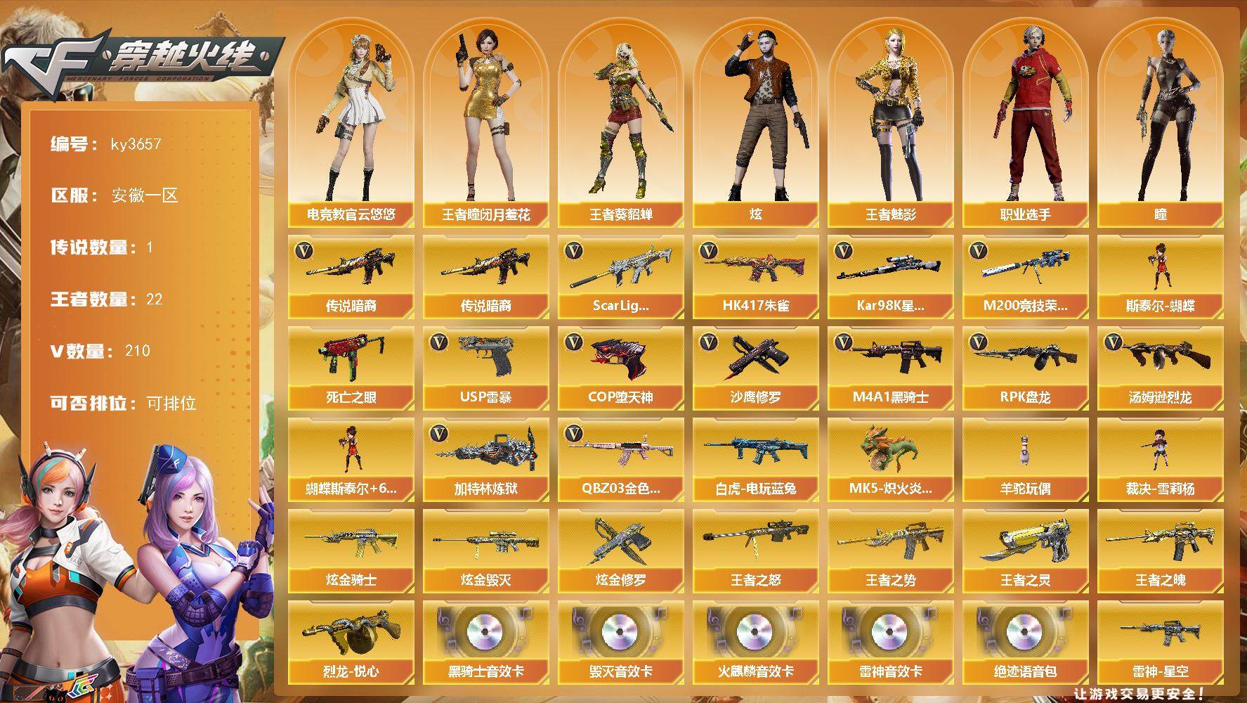 - [12954802]南方大区-69V-5王者-4炫金 【热门武器】:QBZ03-金色蔷薇,M200-幻神,死亡之眼,荣耀世冠-雷神,白虎-电玩蓝兔,荣耀世冠-柯尔特,牛牛-AK47,M4A1-黑骑士,汤姆逊-烈龙*6,RPK-盘龙*5,加特林-炼狱,沙鹰-修罗*3 【王者炫金武器】:炫金天龙*2,炫金毁灭,炫金武士,王者之戮 【音效卡】:M4A1-黑骑士音效卡 【稀有皮肤】:M200-幻神-黄忠皮肤,幻神-青鹤,雷神-能量核心*2,雷神-星空,雷神-荣耀世冠AG,火麒麟-轻羽皮肤,火麒麟-心动糖果,黑骑士-暗月*2,黑骑士-冠军之势,M4A1-黑龙-361,天龙-秘银,天龙-能量核心,AWM-天龙-传奇70KG,AWM-天龙-传奇白鲨,M200-庆典-CFS 2021,天神-暗月 【角色】:王者玲珑,灵狐者-职业经理,电竞教官-云悠悠,蜀雪,迷迭香,审判者,铁骑荣耀 【人偶武器】:AWM-灵狐-15周年嘉年华,牛牛-AK47,迷你超能女侍,迷你生化手雷,闪光弹-小乔 【暴走生化】:死亡之眼,超级对讲机 【挑战大师】:神圣爆裂者-末日III,阐释者III,激光毁灭者III,激光毁灭者III-白马银枪,AK47-冰龙粉碎者,冰龙粉碎者-白马银枪 【英雄级武器】:唐刀-神工天巧,荣耀世冠-雷神,荣耀世冠-柯尔特,QBZ03-金色蔷薇,白虎-电玩蓝兔,无影-神兵利器,M4A1-雷神*2,M4A1-黑龙,M4A1-黑骑士,RPK-盘龙*5,加特林-炼狱,汤姆逊-烈龙*6,AK47-无影,AK47-火麒麟*2,AK12-天启,AWM-天龙,Barrett-毁灭*2,Barrett-极光,AA-12-雷霆,M200-幻神,AK47-黑鲨*2,AK-47-猩红传说*6,AK47-B-战神,沙鹰-天神*2,沙鹰-修罗*3,麒麟刺,擎天*2,龙啸,屠龙*4 【特殊枪械】:0白虎,1黑骑士,6烈龙,5盘龙,1炼狱,0蝴蝶斯泰尔