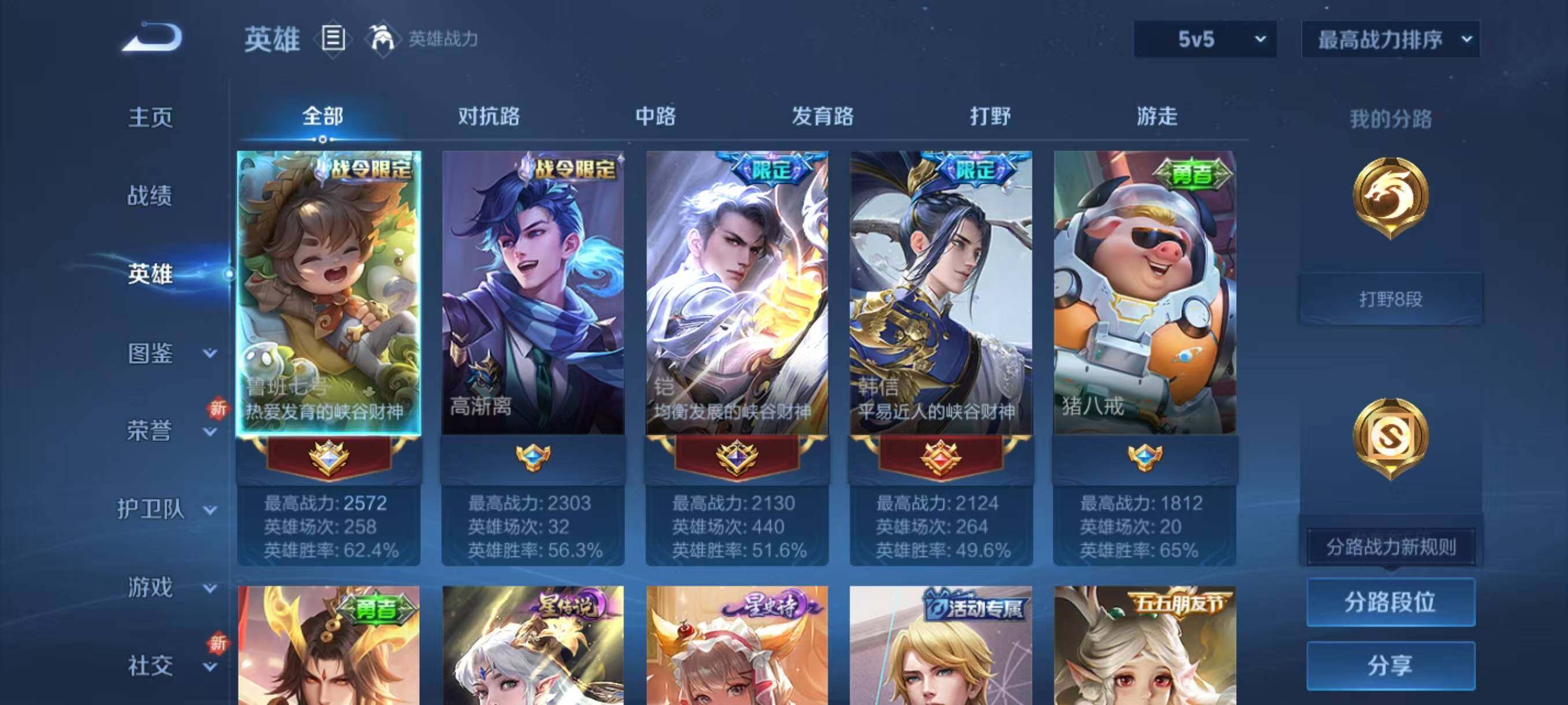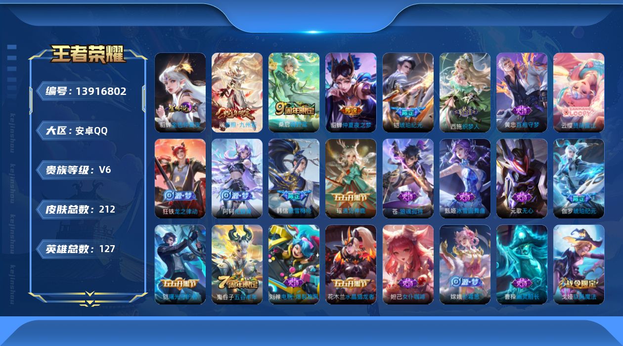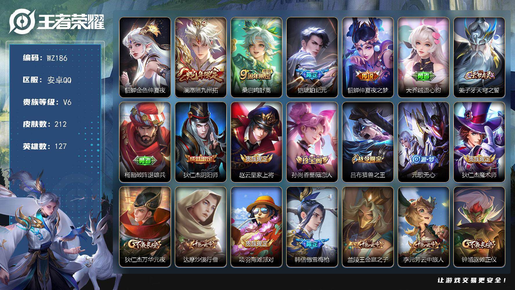 - [11796623]V7 1典藏 7传说 124英雄 337皮肤 可修改实名 优质装备:神鉴启示录,地狱之眼,霜月吟,涂山容容 传说皮:幻光神枪 珍宝阁皮:万物之道,蔷薇恋人,女武神 限定皮:愿照·九州拓(澜年限),逐霄战戟,鸣野蒿,傲雪梅枪,神威(电光马子),遇见飞天,高山流水,怒海麟威,五谷丰年,天狼狩猎者,岱宗(典韦年限),李小龙,猪悟能,大圣娶亲,寅虎·赤拳(老虎年限),神器·万象笔 史诗皮:鸭鸭历险记-刘禅,飞车小橘子,器灵·浮梦炉,化蝶舞,星界战将,谪仙醉月,龙之律动,石田雨龙,百相守梦-周瑜,茶境仙,破空之剑,蔬乡物语(鲁班七号),百相守梦-百里守约,百相守梦-黄忠,遇见神鹿,电玩小子(小书包),黄金分割率,特工魅影,千年之狐,江河有灵,匿光侦查者,魅语,百解令(蒙犽),高渐离燃音魔法,蒙恬荣光圣徽,无限星赏官,冰冠公主,白蛇,晚萤,电玩·爆裂旋风,百相守梦(刘备),末日机甲-吕布,猫狗日记-孙策,猫狗日记-大乔,时之恋人-孙尚香,乱世虎臣,节奏热浪,修罗,女仆咖啡,摇滚巨星,水果甜心,绅士熊喵,天才门将,星夜王子,心灵骇客,功夫厨神,德古拉伯爵,暗隐猎兽者,幽灵船长,鬼剑武藏,心灵战警,舞动绿茵,地狱岩魂,纤云弄巧,繁星吟游(呼啦呼啦),拒霜思,缤纷独角兽,乘风破浪,逐浪之夏,水晶猎龙者,曙光守护者,箭羽风息,唤灵魅影,金属风暴,原初追逐者,圣诞狂欢,圣诞恋歌,鹰眼统帅,暗夜贵公子,魅力维加斯,黎明之约,滕王阁序,无心,未来纪元-赵云