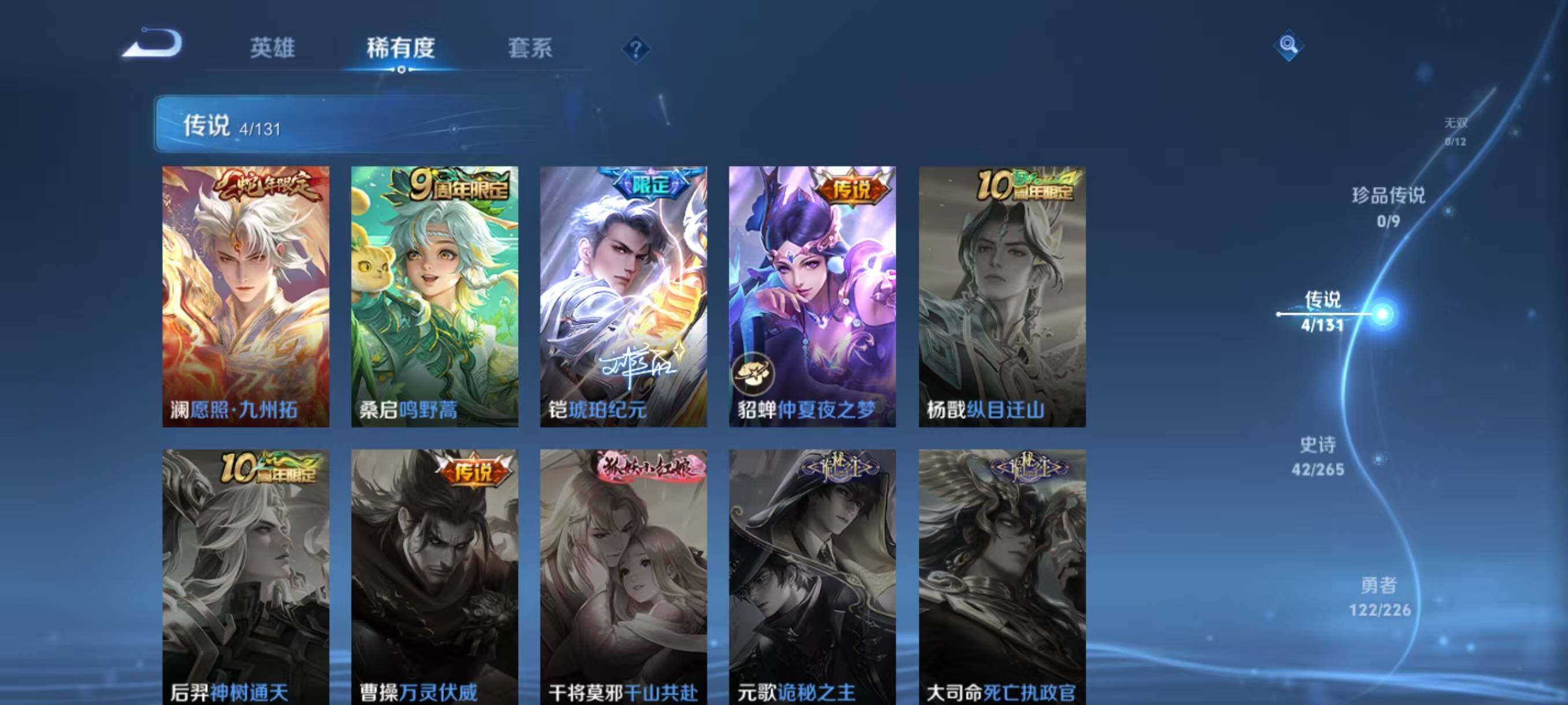【限定皮肤】:大乔绒语心约,姜子牙天穹之誓,杨戬破阵退雄兵,狄仁杰阴阳师,赵云皇家上将,孙尚香蔷薇恋人,吕布猎兽之王,元歌无心,狄仁杰魔术师,狄仁杰万华元夜,达摩沙漠行僧,项羽海滩派对,韩信傲雪梅枪,兰陵王金庭之子,李元芳云中旅人,钟馗驱傩正仪,鬼谷子五谷丰年,苏烈千军破阵,沈梦溪大漠名商,裴擒虎擒涛扼浪,云中君纤云弄巧,上官婉儿梁祝,嫦娥拒霜思,西施玲珑珍味,鲁班大师探海日志,桑启海盐诗旅,戈娅驭风魔法,艾琳女武神,阿古朵江河有灵,张良古海寻踪,高渐离燃音魔法,妲己灵卜魔法,鬼谷子天穹祈灯,伽罗琥珀纪元,铠琥珀纪元,沈梦溪龙舞盛年,鲁班七号蔬乡物语,李元芳蔬乡物语,刘邦剑破天穹,程咬金群星魔术团,刘备异域游侠,周瑜熔金海岸