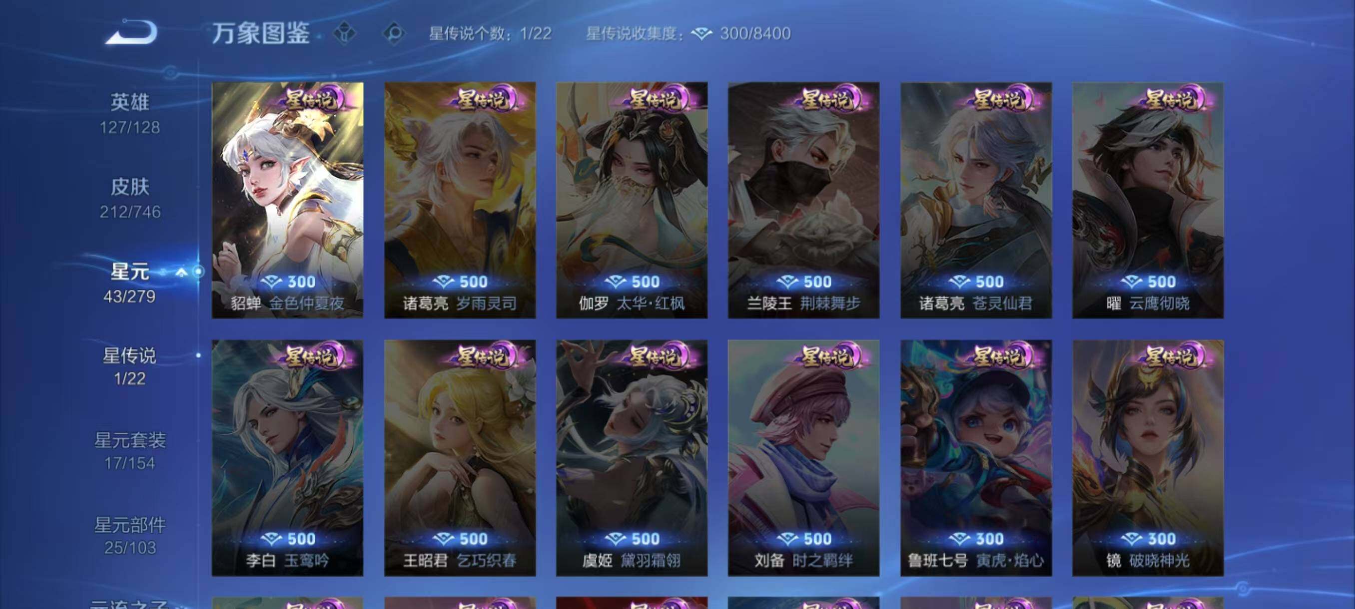 【赛季限定】:狄仁杰万华元夜,达摩沙漠行僧,兰陵王金庭之子,张良古海寻踪,李元芳云中旅人,钟馗驱傩正仪,苏烈千军破阵,沈梦溪大漠名商,裴擒虎擒涛扼浪,鲁班大师探海日志,桑启海盐诗旅,鬼谷子天穹祈灯,刘邦剑破天穹,姜子牙天穹之誓