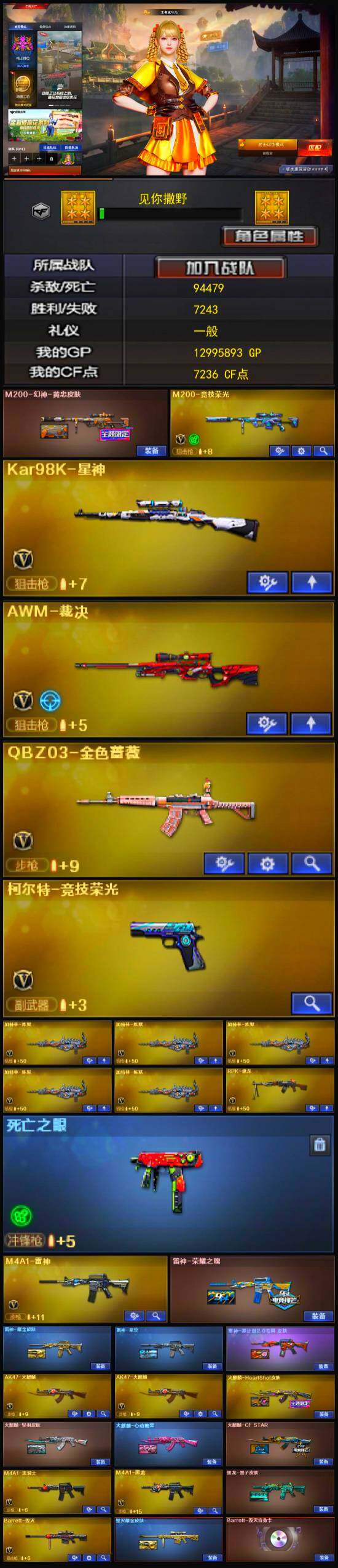 【热门武器】:QBZ03-金色蔷薇,M200-竞技荣光,死亡之眼,Kar98K-星神,M4A1-黑骑士,RPK-盘龙,加特林-炼狱*5,沙鹰-修罗*2
