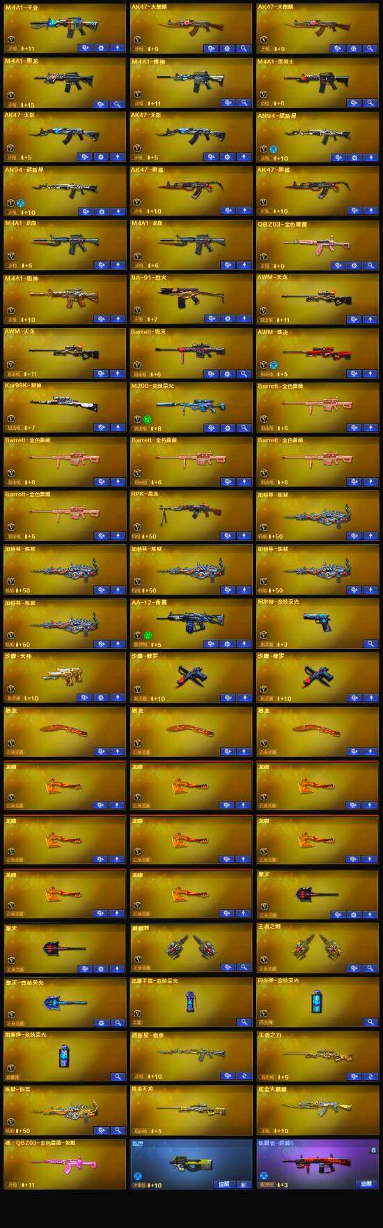 【英雄级武器】:M4A1-千变,AK47-火麒麟*2,M4A1-黑龙,M4A1-雷神,M4A1-黑骑士,AK47-无影*2,AN94-超新星*2,AK47-黑鲨*2,M4A1-龙血*2,QBZ03-金色蔷薇,M4A1-猎神,AWM-天龙*2,Barrett-毁灭,AWM-裁决,Kar98K-星神,M200-竞技荣光,Barrett-金色蔷薇*5,RPK-盘龙,加特林-炼狱*5,AA-12-雷霆,沙鹰-修罗*2,沙鹰-天神,柯尔特-竞技荣光,屠龙*3,龙啸*8,擎天*2,麒麟刺,擎天-竞技荣光,王者之刺-觉醒版,高爆手雷-竞技荣光,闪光弹-竞技荣光,烟雾弹-竞技荣光