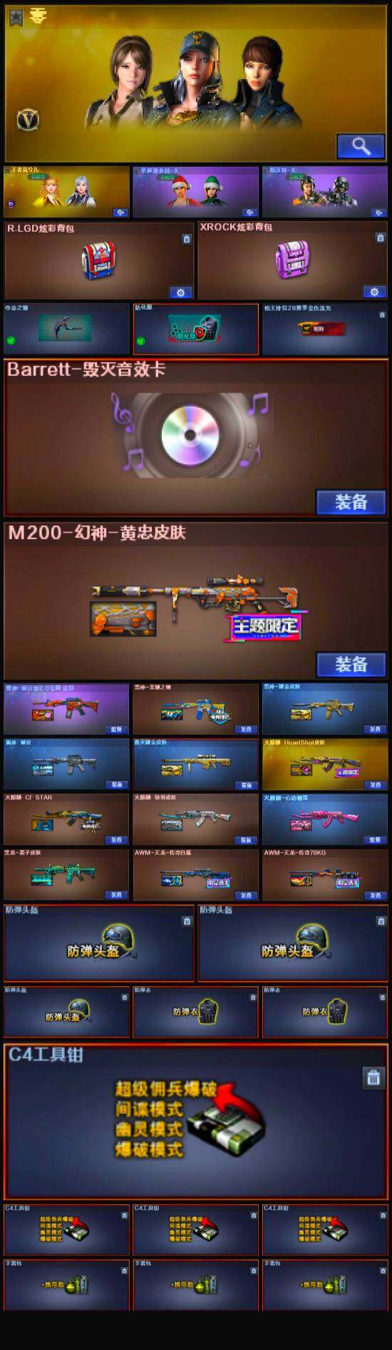 【道具】:R.LGD炫彩背包,XROCK炫彩背包,战舰背包,救世主-黑桃战神,夺命之镰,防化服,流光-再燃火线,枪王排位28赛季金色流光,枪王排位29赛季金色流光,防弹头盔*3,防弹衣*2,C4工具钳*4,手雷包*3