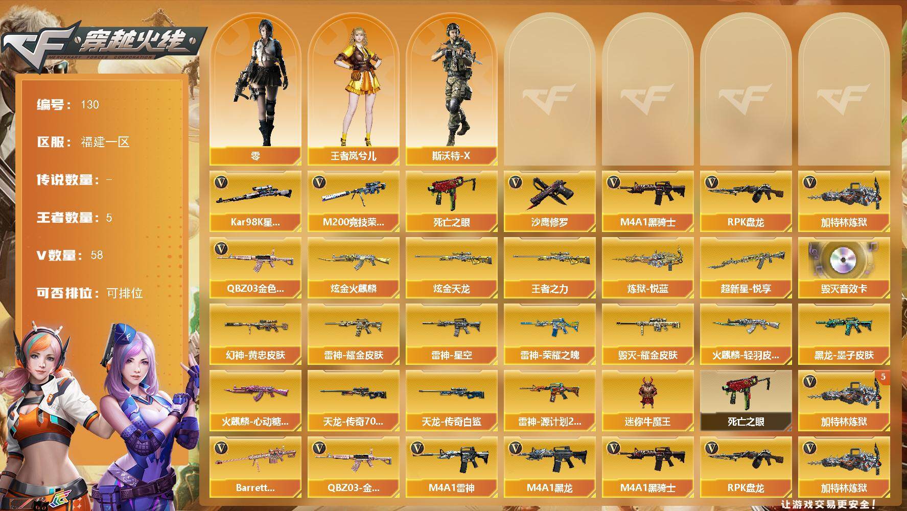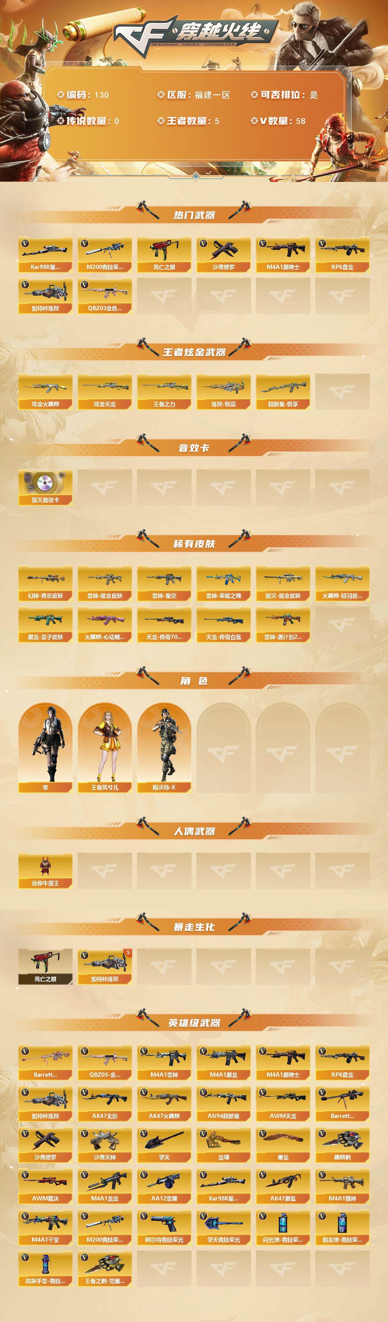[13916967]福建一区-58V-5王者-2炫金 【热门武器】:QBZ03-金色蔷薇,M200-竞技荣光,死亡之眼,Kar98K-星神,M4A1-黑骑士,RPK-盘龙,加特林-炼狱*5,沙鹰-修罗*2 【王者炫金武器】:超新星-悦享,王者之力,炼狱-悦蓝,炫金火麒麟,炫金天龙 【音效卡】:Barrett-毁灭音效卡 【皮肤】:M200-幻神-黄忠皮肤,雷神-荣耀之魄,雷神-星空,雷神-耀金皮肤,雷神-源计划2.0专属 皮肤,火麒麟-轻羽皮肤,火麒麟-心动糖果,毁灭耀金皮肤,黑龙-墨子皮肤,AWM-天龙-传奇70KG,AWM-天龙-传奇白鲨 【角色】:零,王者岚兮儿,斯沃特-X 【人偶武器】:迷你牛魔王 【暴走生化】:死亡之眼 【英雄级武器】:M4A1-千变,AK47-火麒麟*2,M4A1-黑龙,M4A1-雷神,M4A1-黑骑士,AK47-无影*2,AN94-超新星*2,AK47-黑鲨*2,M4A1-龙血*2,QBZ03-金色蔷薇,M4A1-猎神,AWM-天龙*2,Barrett-毁灭,AWM-裁决,Kar98K-星神,M200-竞技荣光,Barrett-金色蔷薇*5,RPK-盘龙,加特林-炼狱*5,AA-12-雷霆,沙鹰-修罗*2,沙鹰-天神,柯尔特-竞技荣光,屠龙*3,龙啸*8,擎天*2,麒麟刺,擎天-竞技荣光,王者之刺-觉醒版,高爆手雷-竞技荣光,闪光弹-竞技荣光,烟雾弹-竞技荣光 【道具】:R.LGD炫彩背包,XROCK炫彩背包,战舰背包,救世主-黑桃战神,夺命之镰,防化服,流光-再燃火线,枪王排位28赛季金色流光,枪王排位29赛季金色流光,防弹头盔*3,防弹衣*2,C4工具钳*4,手雷包*3 【特殊枪械】:1黑骑士,1盘龙,5炼狱