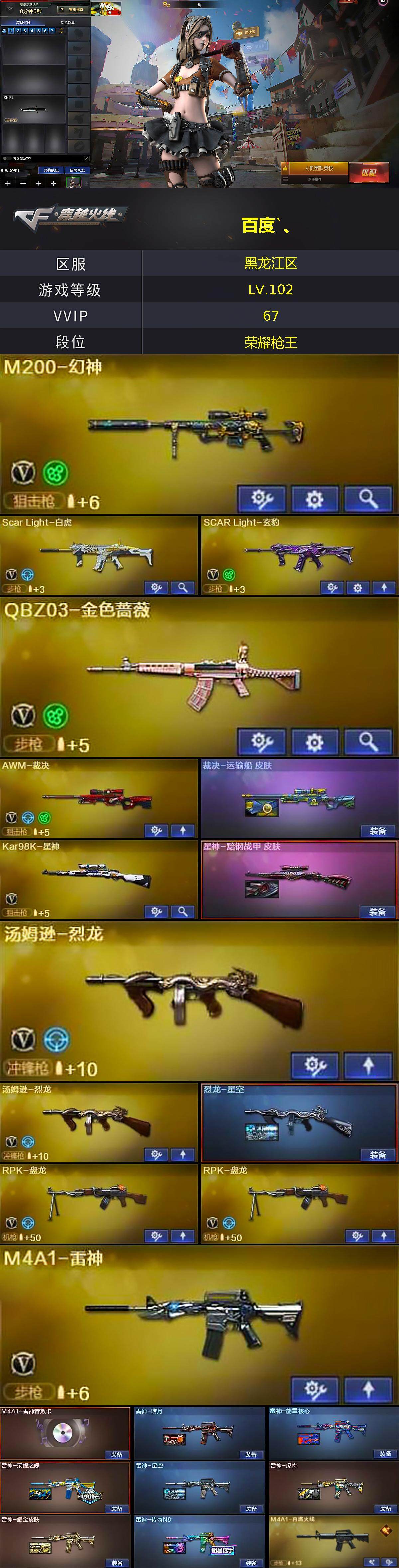 【热门武器】:QBZ03-金色蔷薇,Scar Light-白虎,HK417-朱雀,M200-幻神,死亡之眼,Kar98K-星神,C.A.T,M4A1-黑骑士,汤姆逊-烈龙*2,RPK-盘龙*2,加特林-炼狱,火麒麟-绝迹,沙鹰-修罗*3