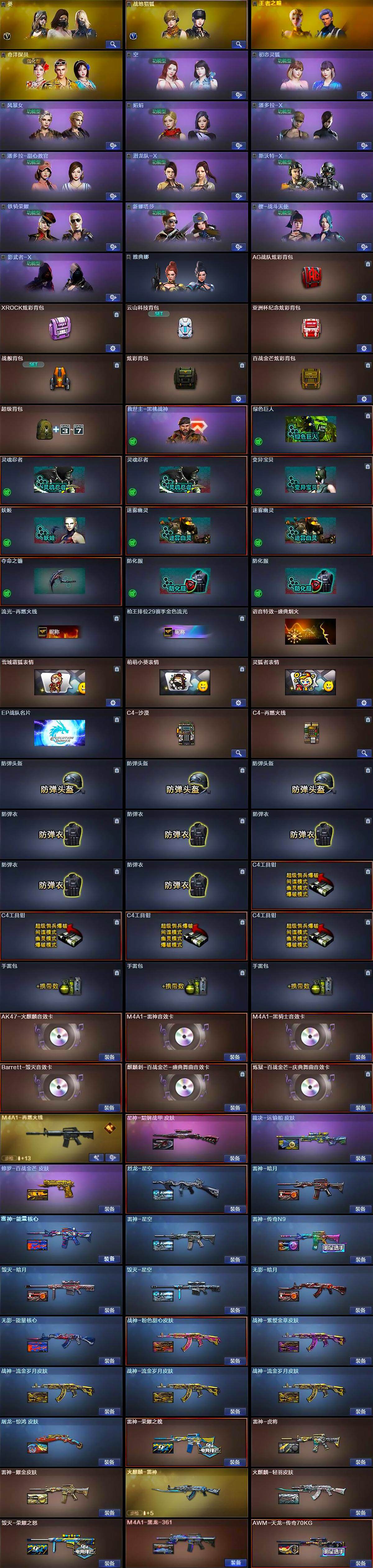 【英雄级武器】:AK47-火麒麟,M4A1-黑龙,M4A1-雷神,M4A1-黑骑士,AK47-无影,M4A1-死神,AK47-黑鲨,M4A1-龙血,HK417-朱雀,Scar Light-白虎,SCAR Light-玄豹,M4A1-玫瑰精灵,QBZ03-金色蔷薇,王者之心-觉醒版,AK-47-猩红传说,AWM-天龙,Barrett-毁灭,AWM-裁决,M200-幻神,Kar98K-星神,Barrett-金色蔷薇,RPK-盘龙*2,加特林-炼狱,炼狱-百战金芒,汤姆逊-烈龙*2,AA-12-雷霆,沙鹰-修罗*3,沙鹰-天神,柯尔特-荣耀世冠EP,屠龙,马来剑-夜魔