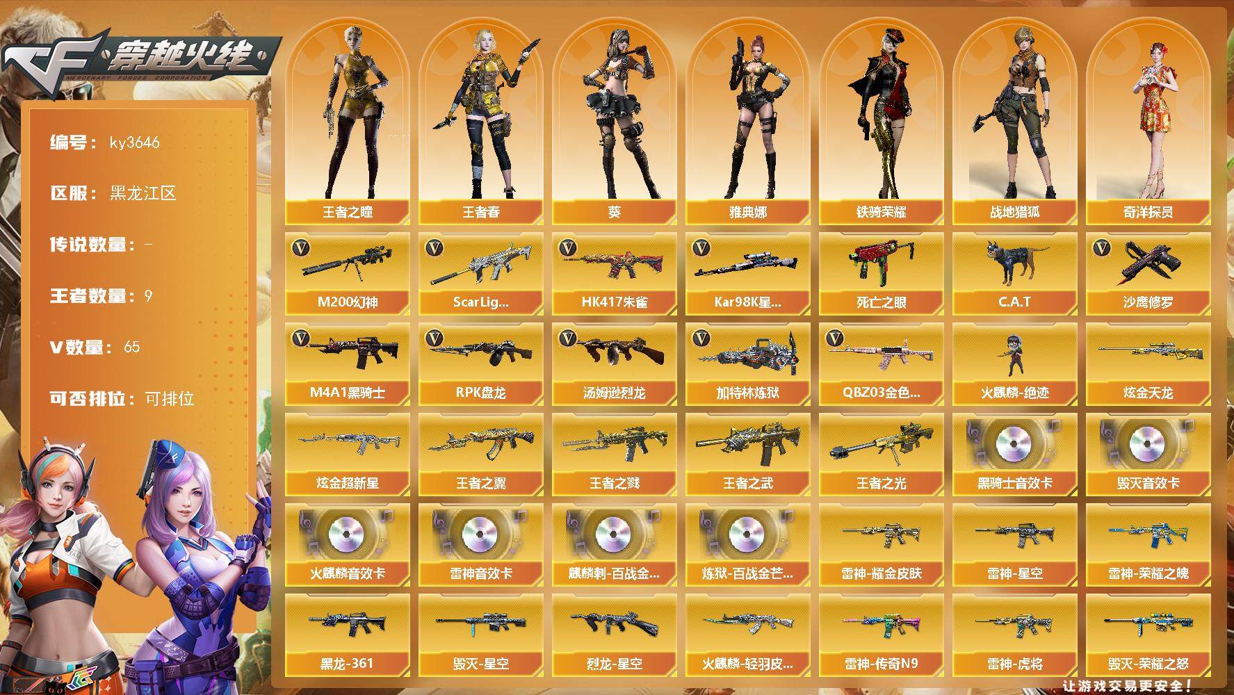 [13916956]黑龙江区-65V-9王者-2炫金 【热门武器】:QBZ03-金色蔷薇,Scar Light-白虎,HK417-朱雀,M200-幻神,死亡之眼,Kar98K-星神,C.A.T,M4A1-黑骑士,汤姆逊-烈龙*2,RPK-盘龙*2,加特林-炼狱,火麒麟-绝迹,沙鹰-修罗*3 【王者炫金武器】:王者之戮,王者之翼,王者之武,王者之光,炫金超新星,炫金天龙 【音效卡】:AK47-火麒麟音效卡,M4A1-雷神音效卡,M4A1-黑骑士音效卡,Barrett-毁灭音效卡,麒麟刺-百战金芒-盛典舞曲音效卡,炼狱-百战金芒-庆典舞曲音效卡 【皮肤】:裁决-运输船 皮肤,星神-黯钢战甲 皮肤,烈龙-星空,雷神-暗月,雷神-能量核心,雷神-荣耀之魄,雷神-星空,雷神-虎将,雷神-耀金皮肤,雷神-传奇N9,M4A1-再燃火线,火麒麟-雷神,火麒麟-轻羽皮肤,毁灭-暗月,毁灭-荣耀之怒,毁灭-星空,毁灭-英雄计划 皮肤,M4A1-黑龙-361,无影-暗月,无影-能量核心,战神-粉色甜心皮肤,战神-紫绶金章皮肤,战神-流金岁月皮肤*3,AWM-天龙-传奇70KG,修罗-百战金芒 皮肤,屠龙-惊鸿 皮肤,轻型军用手斧-再燃火线 【角色】:葵,战地猎狐,王者之瞳,王者春,奇洋探员,空,初恋灵狐,风暴女,娟娟,潘多拉-X,潘多拉-甜心教官,潜龙队-X,斯沃特-X,铁骑荣耀,新娜塔莎,樱-战斗天使,樱-缤纷夏日,影武者-X,雅典娜 【人偶武器】:火麒麟-绝迹,C.A.T,迷你牛魔王,生化手雷-机甲核心,闪光弹-小乔 【暴走生化】:死亡之眼,超级对讲机 【挑战大师】:冰龙粉碎者-白马银枪,激光毁灭者III,神圣爆裂者-末日III,阐释者III 【英雄级武器】:AK47-火麒麟,M4A1-黑龙,M4A1-雷神,M4A1-黑骑士,AK47-无影,M4A1-死神,AK47-黑鲨,M4A1-龙血,HK417-朱雀,Scar Light-白虎,SCAR Light-玄豹,M4A1-玫瑰精灵,QBZ03-金色蔷薇,王者之心-觉醒版,AK-47-猩红传说,AWM-天龙,Barrett-毁灭,AWM-裁决,M200-幻神,Kar98K-星神,Barrett-金色蔷薇,RPK-盘龙*2,加特林-炼狱,炼狱-百战金芒,汤姆逊-烈龙*2,AA-12-雷霆,沙鹰-修罗*3,沙鹰-天神,柯尔特-荣耀世冠EP,屠龙,马来剑-夜魔