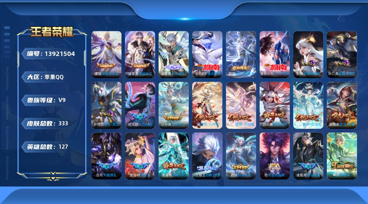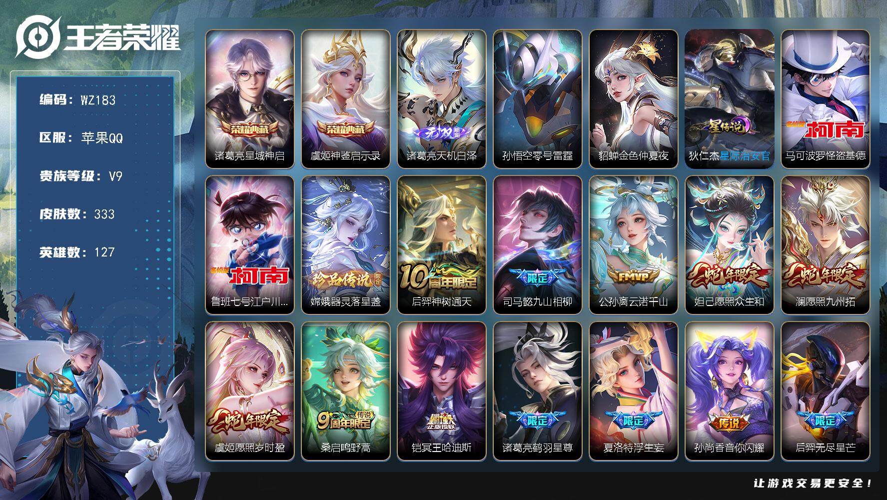 [13921504]苹果Q-V9-333皮肤-2典藏-1无双-3珍品传说-27传说-95史诗 【英雄全皮】:孙权全皮,钟馗全皮,苍全皮,鬼谷子全皮,猪八戒全皮,影全皮 【荣耀典藏】:诸葛亮星域神启,虞姬神鉴启示录 【无双皮肤】:诸葛亮天机白泽 【珍品传说】:马可波罗怪盗基德,鲁班七号江户川柯南,嫦娥器灵落星盏 【传说皮肤】:后羿神树通天,司马懿九山相柳,公孙离云诺千山,妲己愿照众生和,澜愿照九州拓,虞姬愿照岁时盈,桑启鸣野蒿,铠冥王哈迪斯,诸葛亮鹤羽星尊,夏洛特浮生妄,孙尚香音你闪耀,后羿无尽星芒,裴擒虎寅虎赤拳,鲁班七号寅虎瑞焰,西施游龙清影,李元芳飞鸢探春,兰陵王默契交锋,公孙离祈雪灵祝,诸葛亮时雨天司,铠绛天战甲,虞姬启明星使,孙悟空零号赤焰,后羿黄金射手座,貂蝉仲夏夜之梦,孙悟空地狱火,吕布天魔缭乱,狄仁杰超时空战士 【限定皮肤】:白起狰,铠冥王哈迪斯,大乔绒语心约,虞姬夏日便利店,姜子牙天穹之誓,狄仁杰阴阳师,赵云皇家上将,嬴政优雅恋人,孙尚香蔷薇恋人,鲁班七号狮舞东方,鲁班七号寅虎瑞焰,庄周高山流水,阿轲迷踪丽影,钟无艳超时空战士,白起夜都怪侠,芈月重明,芈月幻夜卜梦,吕布天魔缭乱,周瑜赤莲之焰,元歌云间偶戏,夏侯惇朔风刀,甄姬落雪兰心,曹操烛龙,典韦穷奇,典韦蓝屏警告,马可波罗暗影游猎,狄仁杰魔术师,狄仁杰万华元夜,达摩星际陆战队,达摩沙漠行僧,项羽海滩派对,老夫子醍醐杖,程咬金演武夺筹,韩信飞衡,韩信傲雪梅枪,王昭君午后时光,兰陵王默契交锋,兰陵王驯魔猎人,兰陵王金庭之子,花木兰默契交锋,亚瑟潮玩骑士王,孙悟空零号赤焰,孙悟空孙行者,牛魔御旌,后羿辉光之辰,后羿如梦令,后羿圣弓游侠,后羿无尽星芒,李元芳匿光侦查者,李元芳云中旅人,虞姬启明星使,钟馗神迹守卫,钟馗驱傩正仪,杨玉环遇见飞天,女娲朔望之晖,干将莫邪真爱魔法,雅典娜单词大作战,蔡文姬繁星吟游,太乙真人饕餮,鬼谷子原初探秘者,鬼谷子五谷丰年,诸葛亮时雨天司,诸葛亮鹤羽星尊,黄忠烈魂,黄忠火炮绅士,苏烈千军破阵,弈星混沌棋,梦奇顽趣,公孙离祈雪灵祝,沈梦溪大漠名商,明世隐疑决卦,明世隐吟游魔法,裴擒虎李小龙,裴擒虎寅虎赤拳,裴擒虎擒涛扼浪,狂铁御狮,狂铁电玩高手,米莱狄御霄,米莱狄胡桃异想国,盾山御銮,猪八戒西部大镖客,猪八戒猪悟能,上官婉儿梁祝,嫦娥拒霜思,蒙犽狂想玩偶喵,鲁班大师探海日志,桑启海盐诗旅,夏洛特