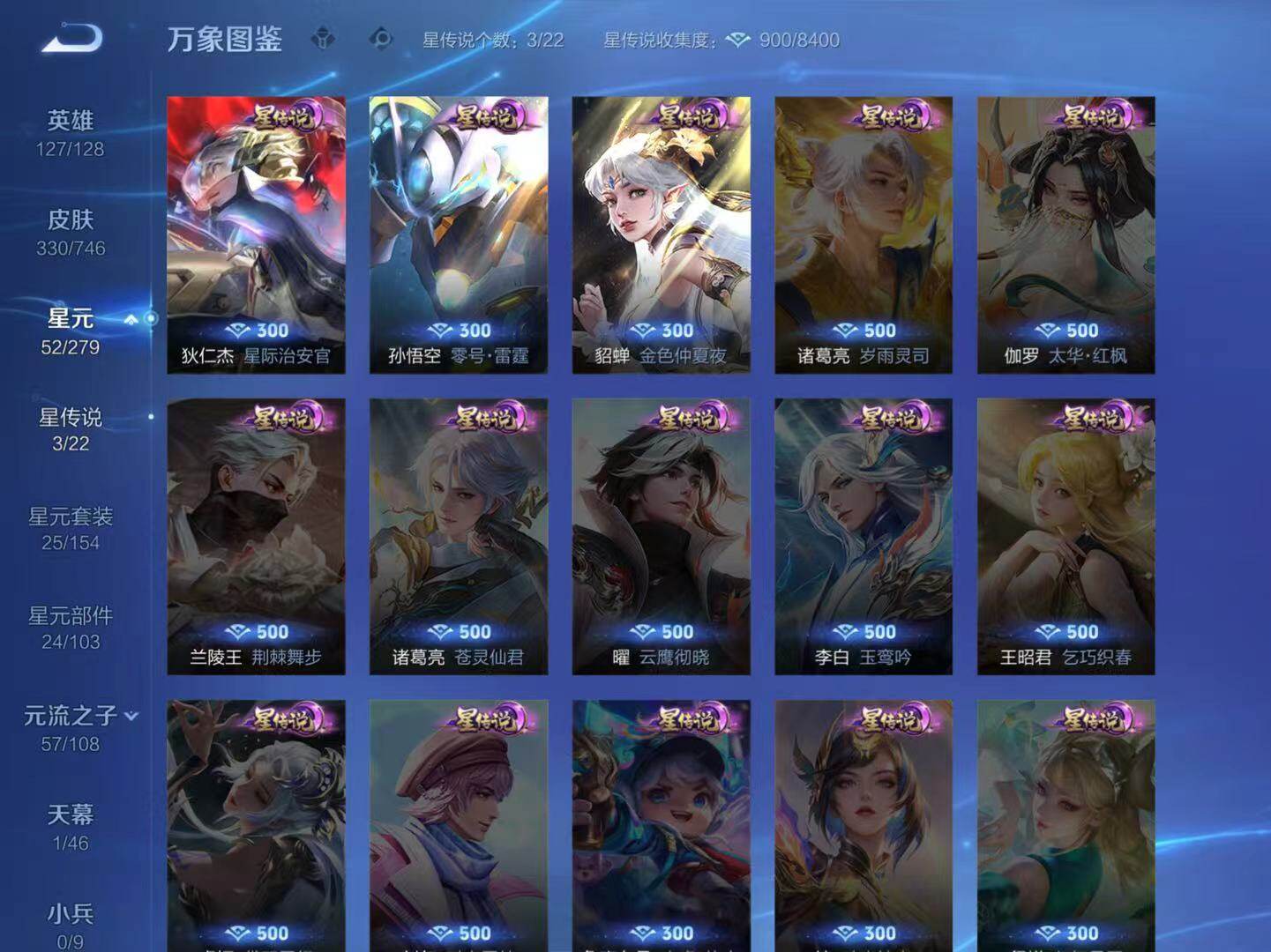 白起狰,太乙真人饕餮,曹操烛龙,芈月重明,典韦穷奇,狂铁御狮,米莱狄御霄,牛魔御旌,盾山御銮,夏侯惇朔风刀,明世隐疑决卦,老夫子醍醐杖,鬼谷子原初探秘者,狄仁杰万华元夜,程咬金演武夺筹,钟馗驱傩正仪,苏烈千军破阵,女娲朔望之晖,典韦蓝屏警告,钟馗神迹守卫,鲁班七号狮舞东方,马可波罗暗影游猎,蒙犽狂想玩偶喵,元歌云间偶戏,弈星混沌棋,达摩沙漠行僧,兰陵王金庭之子,沈梦溪大漠名商,李元芳云中旅人,桑启海盐诗旅,裴擒虎擒涛扼浪,鲁班大师探海日志,张良古海寻踪