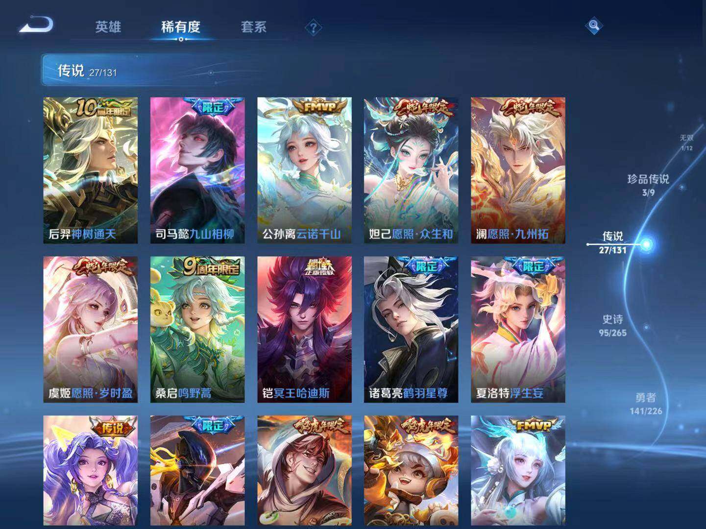 【传说皮肤】:后羿神树通天,司马懿九山相柳,公孙离云诺千山,妲己愿照众生和,澜愿照九州拓,虞姬愿照岁时盈,桑启鸣野蒿,铠冥王哈迪斯,诸葛亮鹤羽星尊,夏洛特浮生妄,孙尚香音你闪耀,后羿无尽星芒,裴擒虎寅虎赤拳,鲁班七号寅虎瑞焰,西施游龙清影,李元芳飞鸢探春,兰陵王默契交锋,公孙离祈雪灵祝,诸葛亮时雨天司,铠绛天战甲,虞姬启明星使,孙悟空零号赤焰,后羿黄金射手座,貂蝉仲夏夜之梦,孙悟空地狱火,吕布天魔缭乱,狄仁杰超时空战士