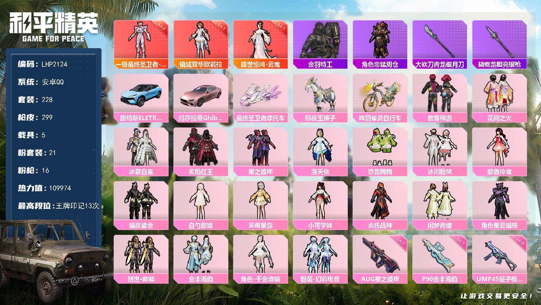[13923108]安卓 手Q-3红装-21粉装-16特效枪-5载具-10.9w热力值-13印记-228套装-299枪皮【热门品类】:套装-金羽特工,角色-忠猛周仓,大砍刀-青龙偃月刀,撬棍-龙胆亮银枪【角色神装等级】:最终圣卫者-帕修斯(二级),盛世惊鸿-云鸾(一级),镜域双华-欧若拉(一级)【稀有载具】:路特斯ELETRE(冰川蓝),玛莎拉蒂Ghibli(粉),最终圣卫者摩托车,照夜玉狮子,辉羽雀灵自行车【特效枪等级】:AKM-梦之光华(四级),SCAR-L-梦幻火箭(四级),M416-暖熊萌萌(四级),GROZA-镜光银凌(五级),AUG-星之彼岸(七级),AUG-暖羊咩咩(五级),UMP45-量子极限(五级),Vector-最终圣卫者(三级),AKS-74U-星穹咏叹调(二级),P90-金丰海韵(七级),Kar98K-巳巳如意(五级),M24-镜域双华(三级),DP-28-千金淑猫(二级),MG3-梦幻舞会(二级),MG3-辉羽雀灵(三级)【优质套装】:粉装-梦幻火箭,粉装-放客神游,粉装-花间之火,粉装-冰霜白皇,粉装-炙焰红王,粉装-星之彼岸,角色-洛天依,粉装-恐龙拽拽,粉装-冰川粉黛,角色-歌者泠鸢,粉装-暗夜鎏金,角色-白勺歌姬,角色-呆萌星弥,角色-小可学妹,粉装-炎氏战神,粉装-闲梦青缨,角色-星云暗核,套装-创世·救赎,粉装-金丰海韵,角色-千金淑猫,粉装-幻彩电音【优质飞行器】:梦幻火箭飞行器,星之彼岸飞行器,星夜魔法师飞行翼,镜域双华-灵镜之阶,雀灵庇佑飞行器,终晖之翼飞行器