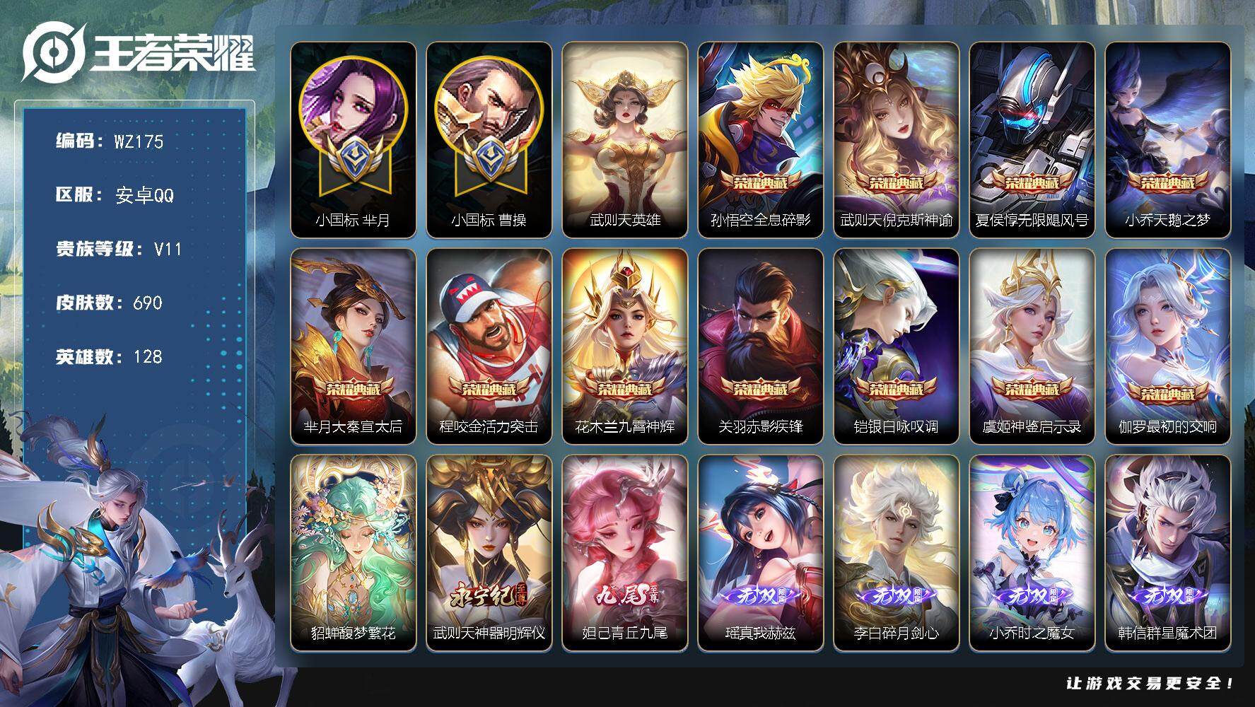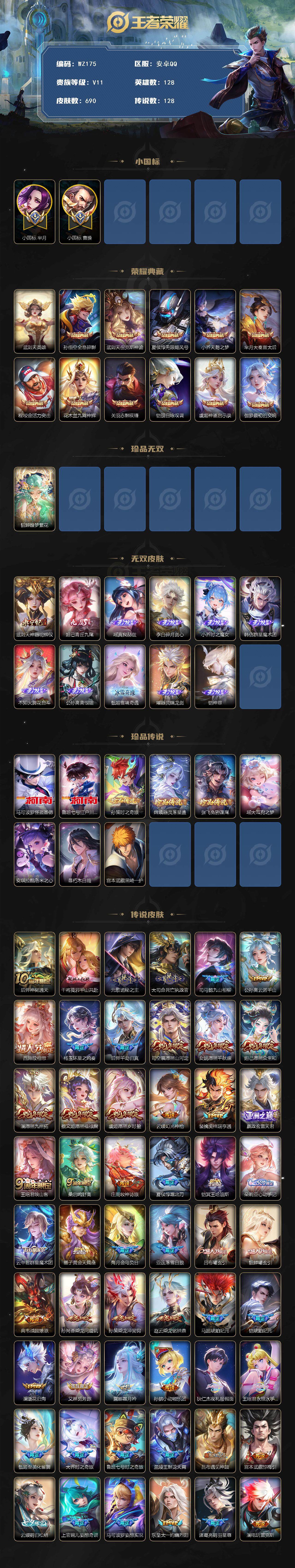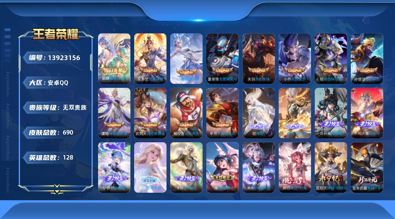 [13923156]安卓Q-V11-最强王者段位-128英雄-690皮肤-11典藏-1珍品无双-11无双-9珍品传说-128传说-253史诗