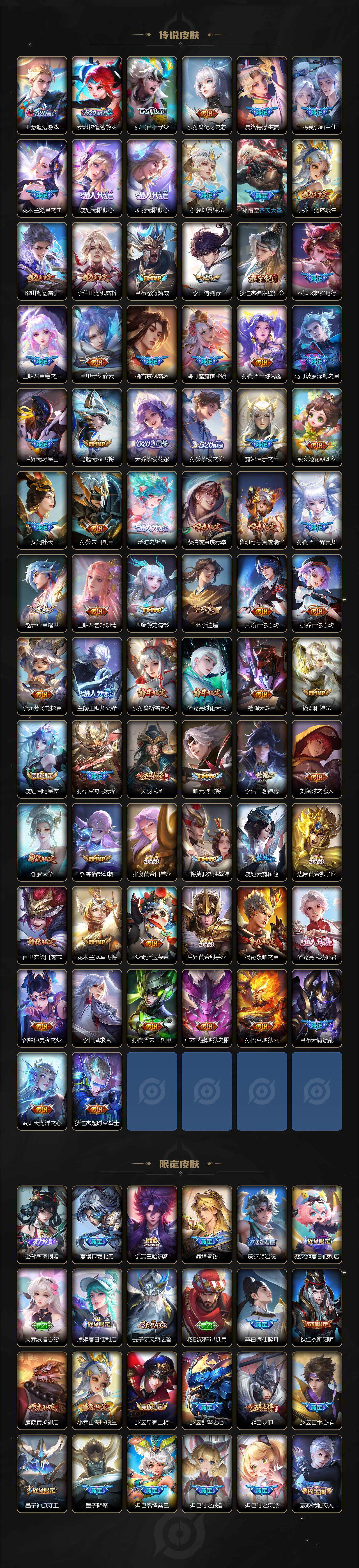 【传说皮肤】:后羿神树通天,干将莫邪千山共赴,元歌诡秘之主,大司命死亡执政官,司马懿九山相柳,公孙离云诺千山,西施续相思,杨玉环星之鸣奏,后羿千劫归真,司空震愿照山河定,女娲愿照千秋盛,妲己愿照众生和,澜愿照九州拓,蔡文姬愿照福禄聚,虞姬愿照岁时盈,云缨幻光神枪,裴擒虎祥瑞亨通,嬴政玄雷天君,王昭君映山客,桑启鸣野蒿,庄周牧神诗旅,夏侯惇霜北刀,铠冥王哈迪斯,朵莉亚心动手记,云中君群星魔术团,墨子黄金天蝎座,海月金乌负日,亚连落雪白狼,吕布曦玄引,貂蝉曦玄引,典韦战鼓燎原,孙尚香乘龙问璇玑,孙策乘龙淬吴钩,赵云乘