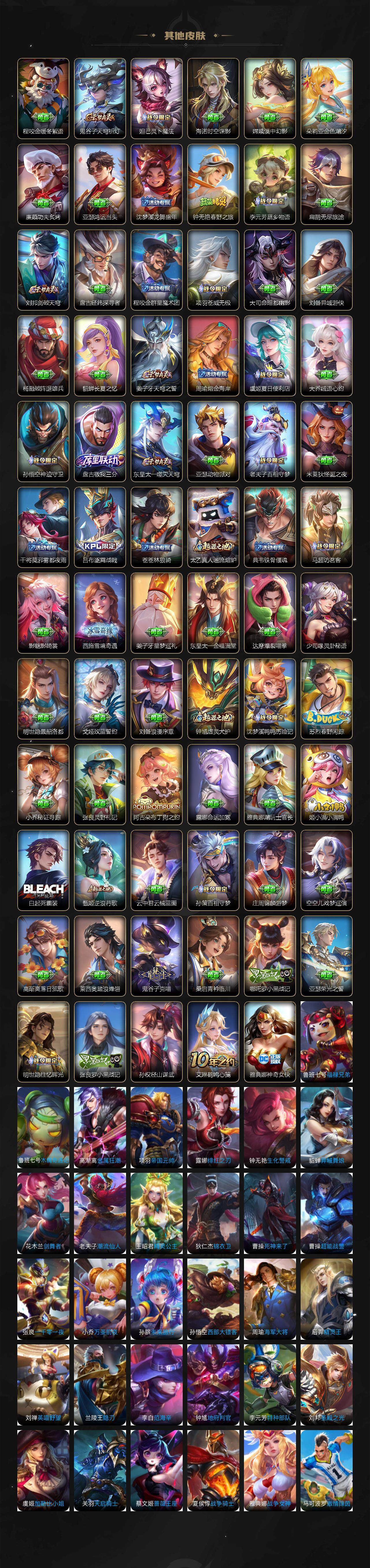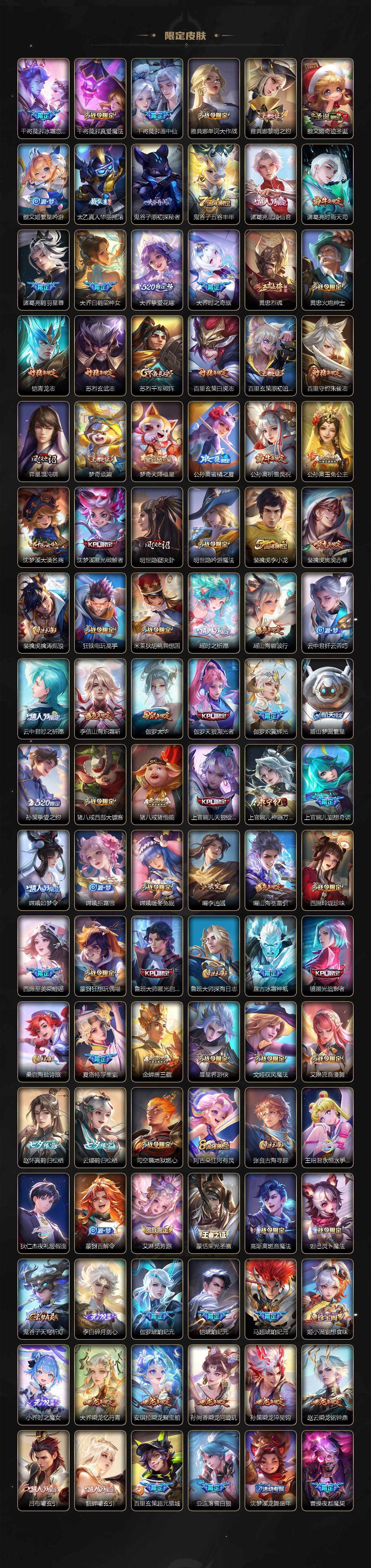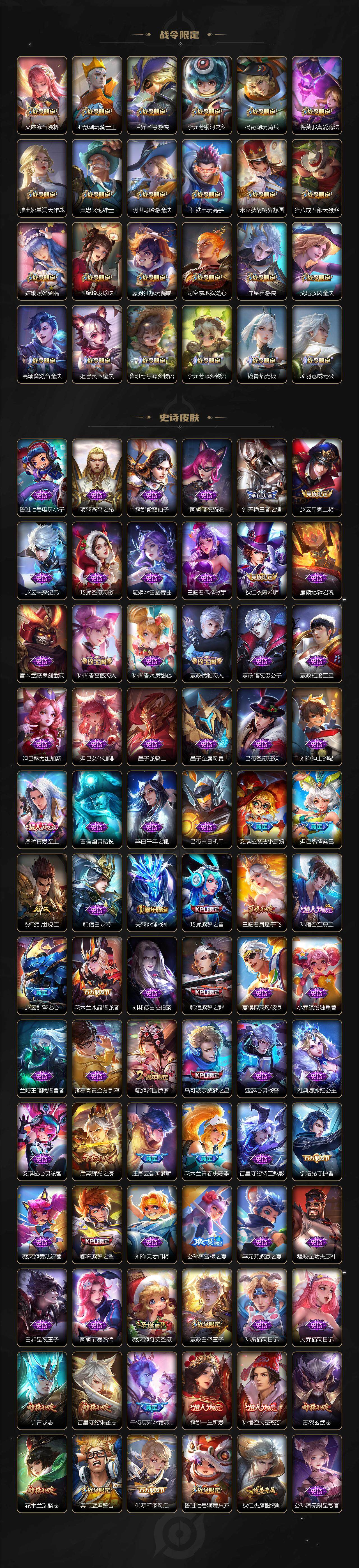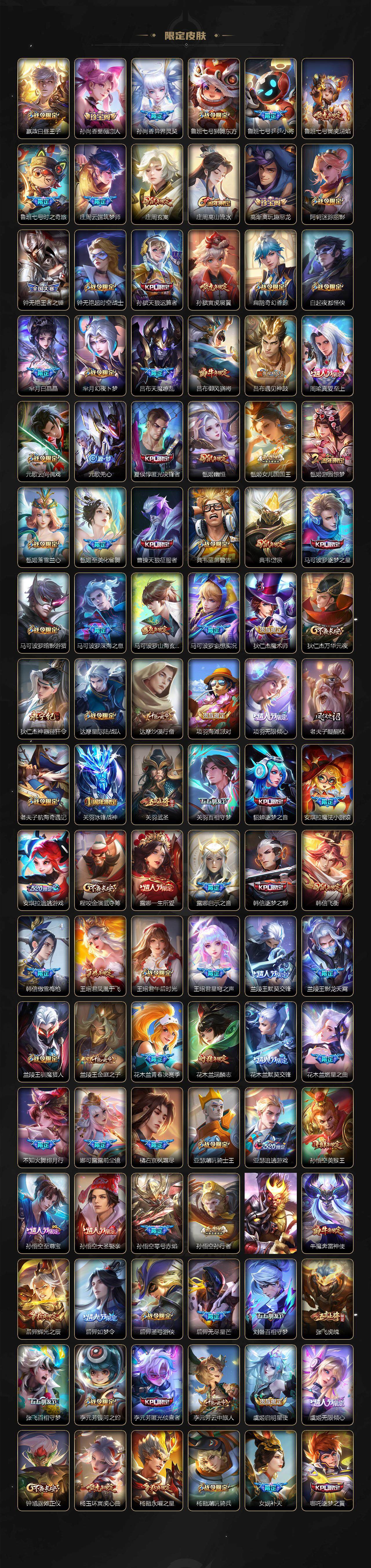 关羽冰锋战神,裴擒虎李小龙,牛魔奔雷神使,貂蝉逐梦之音,公孙离祈雪灵祝,吕布御风骁将,诸葛亮时雨天司,赵云龙胆,关羽武圣,黄忠烈魂,张飞虎魄,马超神威,后羿辉光之辰,庄周玄嵩,典韦岱宗,甄姬幽恒,韩信飞衡,伽罗太华,曹操天狼征服者,孙膑天狼运算者,上官婉儿天狼绘梦者,伽罗天狼溯光者,哪吒逐梦之翼,马可波罗逐梦之星,韩信逐梦之影,铠青龙志,百里玄策白虎志,花木兰瑞麟志,苏烈玄武志,百里守约朱雀志,王昭君凤凰于飞,周瑜真爱至上,孙悟空大圣娶亲,露娜一生所爱,花木兰默契交锋,兰陵王默契交锋,后羿如梦令,嫦娥如梦令,孙悟空至尊宝,雅典娜神奇女侠,妲己热情桑巴,干将莫邪冰霜恋舞曲,花木兰青春决赛季,蔡文姬奇迹圣诞,妲己时之彼端,公孙离蜜橘之夏,芈月白晶晶,安琪拉魔法小厨娘,赵云引擎之心,孙悟空美猴王,庄周云端筑梦师,鲁班七号乒乒小将,大乔白鹤梁神女,猪八戒猪悟能,廉颇寅虎·御盾,孙尚香异界灵契,孙悟空孙行者,甄姬女儿国国王,镜匿光追影者,韩信傲雪梅枪,鲁班七号寅虎·瑞焰,孙膑寅虎·展翼,杨玉环寅虎·心曲,裴擒虎寅虎·赤拳,云中君时之祈愿,瑶时之祈愿,女娲补天,赵云百木心枪,公孙离玉兔公主,露娜启示之音,夏侯惇匿光决锋者,后羿无尽星芒,马可波罗深海之息,金蝉唐三藏,娜可露露前尘镜,橘右京枫霜尽,鲁班大师匿光启智者,妲己时之奇旅,王昭君星穹之声,不知火舞绯月行,上官婉儿神器·万象笔,盾山梦圆繁星,墨子降魔,李白诗剑行,马可波罗山海·玄木吟,盘古冰霜神祇,瑶山海·碧波行,兰陵王影龙天霄,西施至美·乘鲤谣,甄姬至美·化雀舞,夏侯惇霜北刀,桑启鸣野蒿,艾琳陌上桑,王昭君映山客,澜愿照·九州拓,蔡文姬愿照·福禄聚,虞姬愿照·岁时盈,司空震愿照·山河定,妲己愿照·众生和,女娲愿照·千秋盛