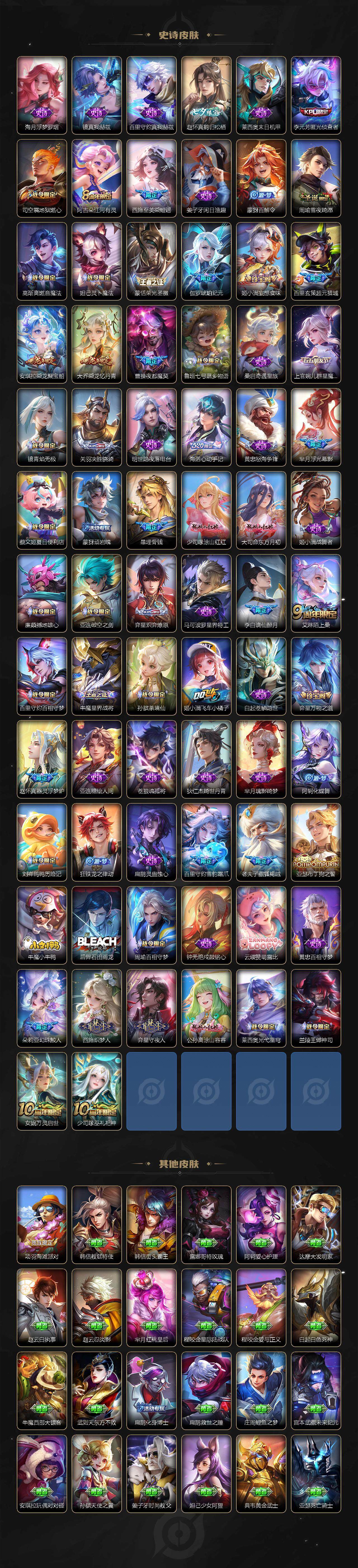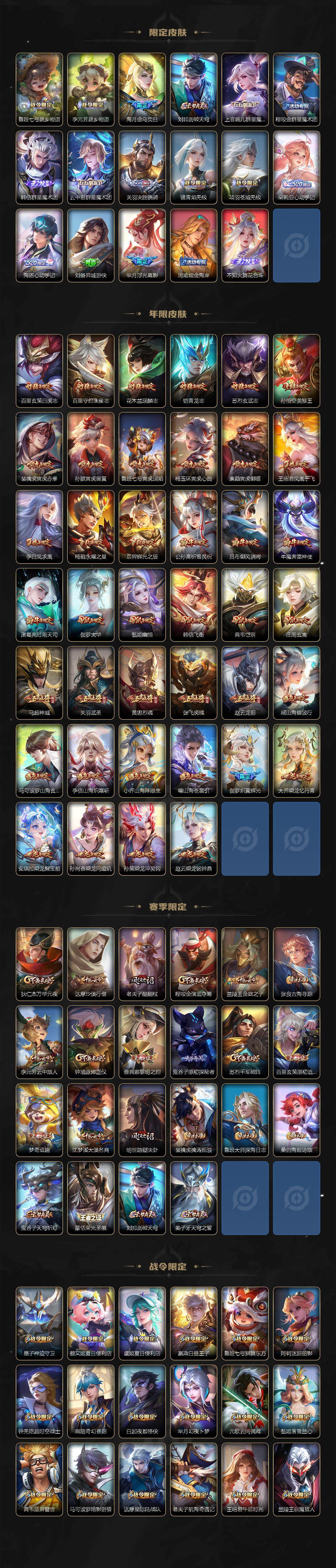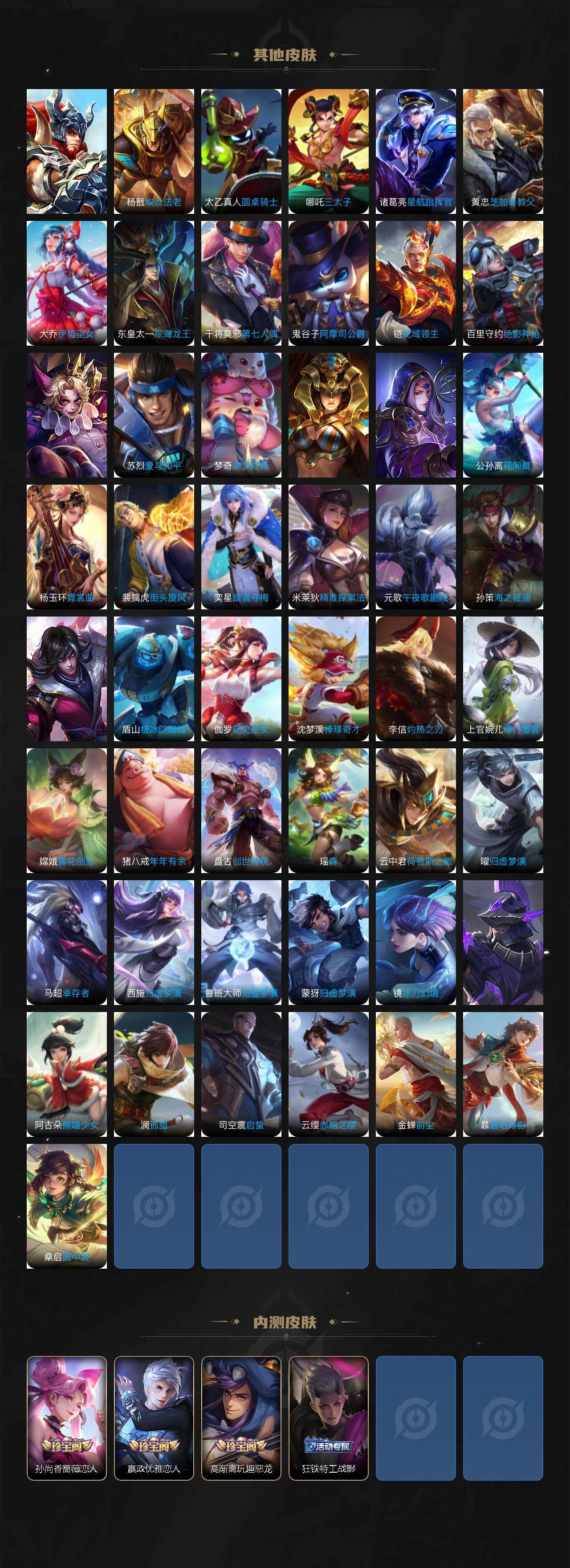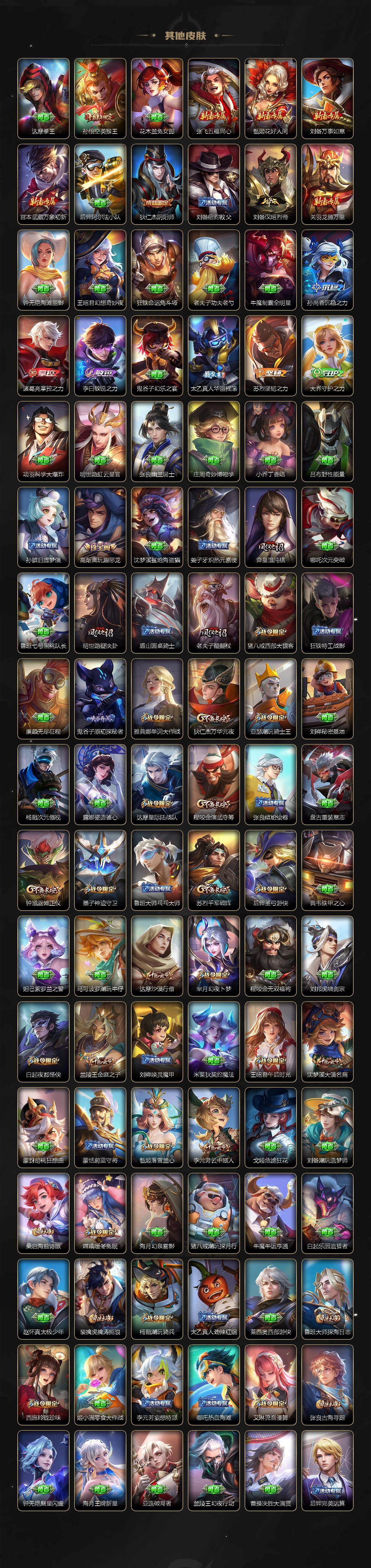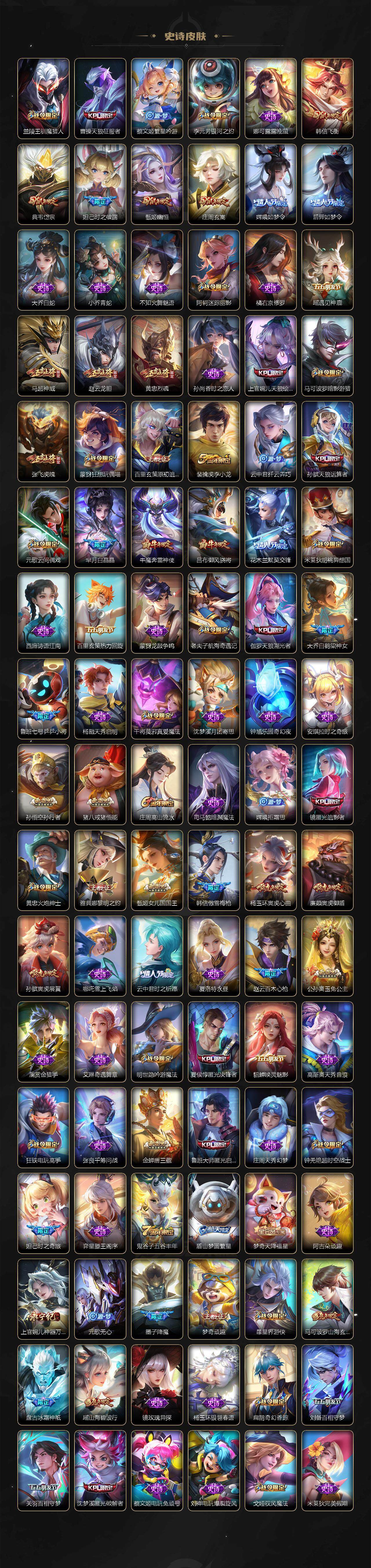 关羽冰锋战神,裴擒虎李小龙,牛魔奔雷神使,貂蝉逐梦之音,公孙离祈雪灵祝,吕布御风骁将,诸葛亮时雨天司,赵云龙胆,关羽武圣,黄忠烈魂,张飞虎魄,马超神威,后羿辉光之辰,庄周玄嵩,典韦岱宗,甄姬幽恒,韩信飞衡,伽罗太华,曹操天狼征服者,孙膑天狼运算者,上官婉儿天狼绘梦者,伽罗天狼溯光者,哪吒逐梦之翼,马可波罗逐梦之星,韩信逐梦之影,铠青龙志,百里玄策白虎志,花木兰瑞麟志,苏烈玄武志,百里守约朱雀志,王昭君凤凰于飞,周瑜真爱至上,孙悟空大圣娶亲,露娜一生所爱,花木兰默契交锋,兰陵王默契交锋,后羿如梦令,嫦娥如梦令,孙悟空至尊宝,雅典娜神奇女侠,妲己热情桑巴,干将莫邪冰霜恋舞曲,花木兰青春决赛季,蔡文姬奇迹圣诞,妲己时之彼端,公孙离蜜橘之夏,芈月白晶晶,安琪拉魔法小厨娘,赵云引擎之心,孙悟空美猴王,庄周云端筑梦师,鲁班七号乒乒小将,大乔白鹤梁神女,猪八戒猪悟能,廉颇寅虎·御盾,孙尚香异界灵契,孙悟空孙行者,甄姬女儿国国王,镜匿光追影者,韩信傲雪梅枪,鲁班七号寅虎·瑞焰,孙膑寅虎·展翼,杨玉环寅虎·心曲,裴擒虎寅虎·赤拳,云中君时之祈愿,瑶时之祈愿,女娲补天,赵云百木心枪,公孙离玉兔公主,露娜启示之音,夏侯惇匿光决锋者,后羿无尽星芒,马可波罗深海之息,金蝉唐三藏,娜可露露前尘镜,橘右京枫霜尽,鲁班大师匿光启智者,妲己时之奇旅,王昭君星穹之声,不知火舞绯月行,上官婉儿神器·万象笔,盾山梦圆繁星,墨子降魔,李白诗剑行,马可波罗山海·玄木吟,盘古冰霜神祇,瑶山海·碧波行,兰陵王影龙天霄,西施至美·乘鲤谣,甄姬至美·化雀舞,夏侯惇霜北刀,桑启鸣野蒿,艾琳陌上桑,王昭君映山客,澜愿照·九州拓,蔡文姬愿照·福禄聚,虞姬愿照·岁时盈,司空震愿照·山河定,妲己愿照·众生和,女娲愿照·千秋盛