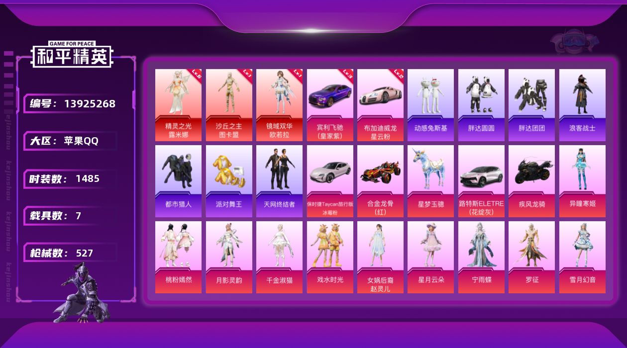 [13925268]实名: 可修改 时装数: 1485 载具数: 7 枪械数: 527 战备数: 372 神级装扮: 沙丘之主-图卡盟,镜域双华-欧若拉,精灵之光-露米娜 热门装扮: 梦幻火箭(新101),蝶舞迷情,星际漫游者,甜心巧克力,怪诞乔克,宝贝奶油派,浪漫波比,天使彩虹糖,梦魇先生,放客神游,万圣娃娃,迅捷狂鲨,静灵氛围,鹰眼刺客,缤纷油彩,向日葵,粉色回忆,都市猎人,恒星战甲,香水柠檬,绚金战神,炙焰红王,花间之火,冰霜白皇,雪国幻梦,琉璃脉冲,迪迦闪耀型,洛天依,焦糖拿铁,薄荷物语,海盐物语,灵感创作师,女娲后裔-赵灵儿,旋转彩虹,冰川幽秘,暗夜行者,潮萌小黄鸭,浪客战士,萌神柯基,胖达团团,胖达圆圆,奇迹天团,神秘黑猫,动感兔斯基,兔兔白日梦,启明星,暗夜鎏金,派对舞王,第五大道,小可学妹,白勺歌姬,炫光之旅,莲影清波,镜光幻境,蜜语绒猫,鸢尾晶梦,千金淑猫,月影灵韵,桃粉嫣然,戏水时光,星月云朵,雪月幻音,绯果甜心,幻彩电音,宁雨蝶,罗征,异瞳寒姬 载具: 合金龙骨(红),空客H135-恋语之翼,路特斯ELETRE(花绽灰),宾利飞驰(皇家紫),布加迪威龙(星云粉),疾风龙骑,星梦玉骢,保时捷Taycan旅行版(冰莓粉) 稀有枪皮: MG3洛神天依,AKM炫紫旋律,Kar98K伏魔团,AKM甜心宝贝,M416心之恋语,M762激战未来,SCAR-L童趣迷兔,Groza香水柠檬,UMP45相思残雪,GROZA焦糖拿铁,M416暖熊萌萌,Vector灵感创作师,P90甜蜜草莓,M417第五大道,AMR炫光之旅,AUG超新星,P90沙丘之主,SPAS-12蜜语绒猫,M24镜域双华,Mk14精灵梦叶罗丽,M416墨龙九天,GROZA-精灵之光,AKM-幽焰骑士,DP-28-千金淑猫,AUG-许七安,Kar98K-巳巳如意,M416-女娲灵识,SCAR-L金蛇镇世,破片手榴弹-热量炸弹,Famas-翎光蝶翼,MK12-雪月幻音,UZI-圣斗士星矢,AKS-74U-星穹咏叹调,烟雾弹-甜梦果泡,汤姆逊-热量炸弹,DP-28-豹影疾电