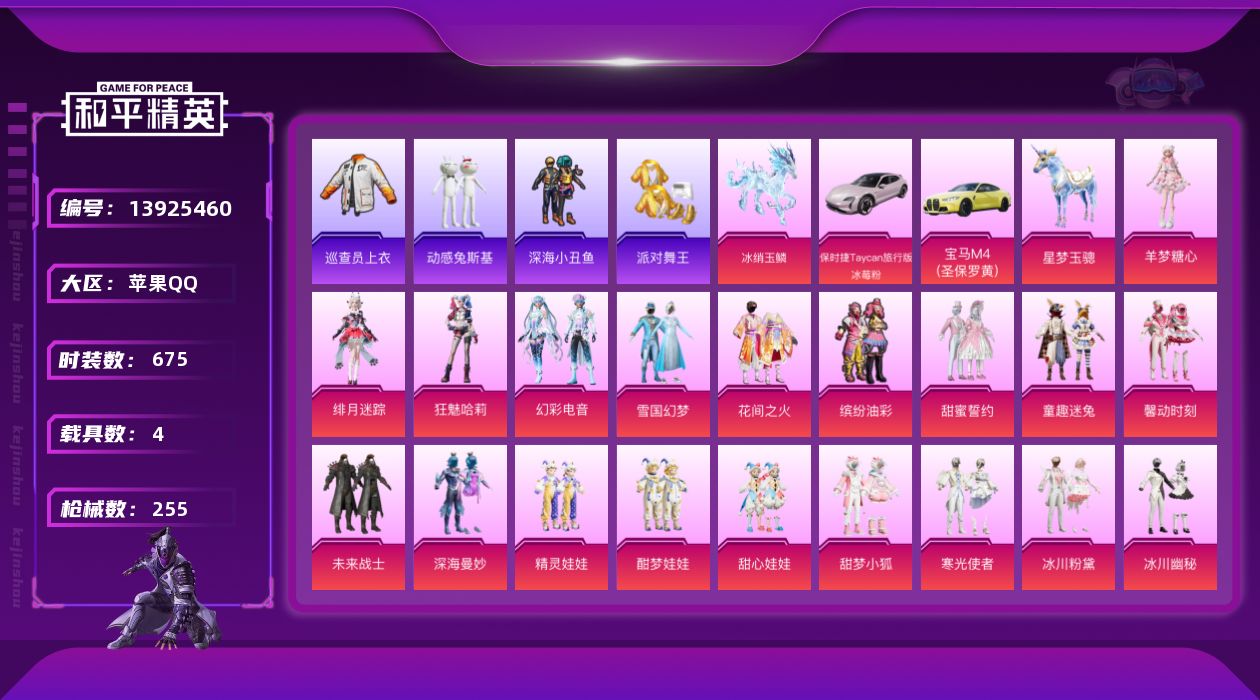 [13925460]实名: 可修改 时装数: 675 载具数: 4 枪械数: 255 战备数: 217 热门装扮: 未来战士,深海小丑鱼,深海曼妙,缤纷油彩,甜蜜誓约,花间之火,童趣迷兔,雪国幻梦,馨动时刻,巡查员衣服,精灵娃娃,酣梦娃娃,甜心娃娃,甜梦小狐,寒光使者,冰川粉黛,冰川幽秘,潮萌小黄鸭,激萌罗小黑,动感兔斯基,兔兔白日梦,派对舞王,仲夏莫吉托,诡夜天鹅,第五大道,小可学妹,白勺歌姬,傲傲奶龙,蜜语绒猫,小蓝,金丰海韵,幻彩电音,狂魅哈莉,绯月迷踪,羊梦糖心 载具: 星梦玉骢,宝马M4(圣保罗黄),保时捷Taycan旅行版(冰莓粉),冰绡玉鳞 稀有枪皮: M762甜心娃娃,M416暖熊萌萌,UMP45启明星,SCAR-L纯梦嫁纱,M417第五大道,Kar98K未来歌姬,AUG超新星,MG3酷泡奶龙,AKM绿萝繁花,SPAS-12蜜语绒猫,PKM江南烟雨,P90-金丰海韵,GROZA-镜光银凌,Kar98K-巳巳如意,AUG-暖羊咩咩,破片手榴弹-热量炸弹,AKS-74U-星穹咏叹调,MK14-甜梦熊击,烟雾弹-甜梦果泡,MG-36-幻彩电音,Vector-最终圣卫者,汤姆逊-热量炸弹,M416-灵猫魔法师,DP-28-豹影疾电,P90-魔童闹海 敖丙