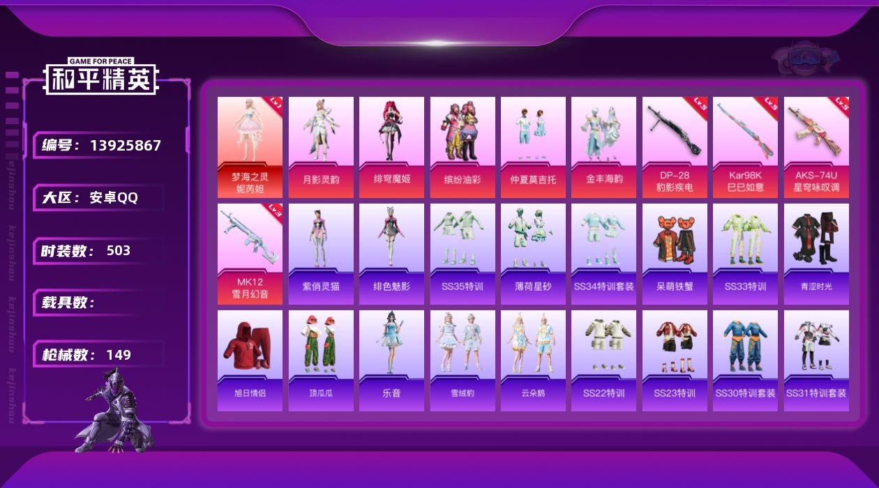 [13925867]实名: 可修改 时装数: 503 枪械数: 149 战备数: 151 神级装扮: 梦海之灵-妮芮妲 热门装扮: 呆萌铁蟹,缤纷油彩,仲夏莫吉托,金丰海韵,月影灵韵,绯穹魔姬 稀有枪皮: Kar98K-巳巳如意,MK12-雪月幻音,AKS-74U-星穹咏叹调,DP-28-豹影疾电