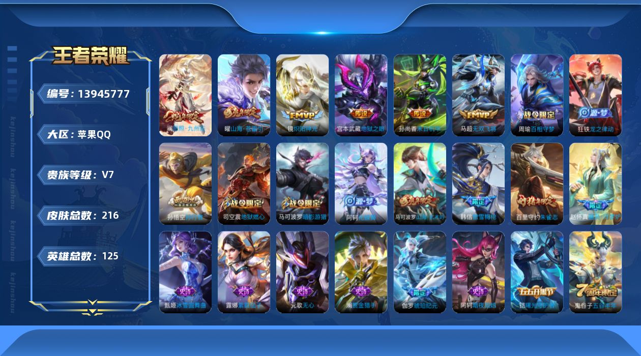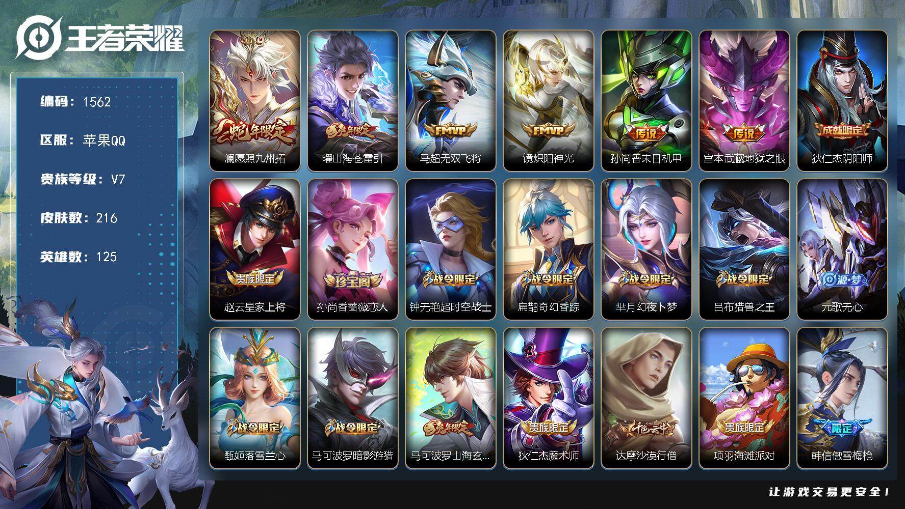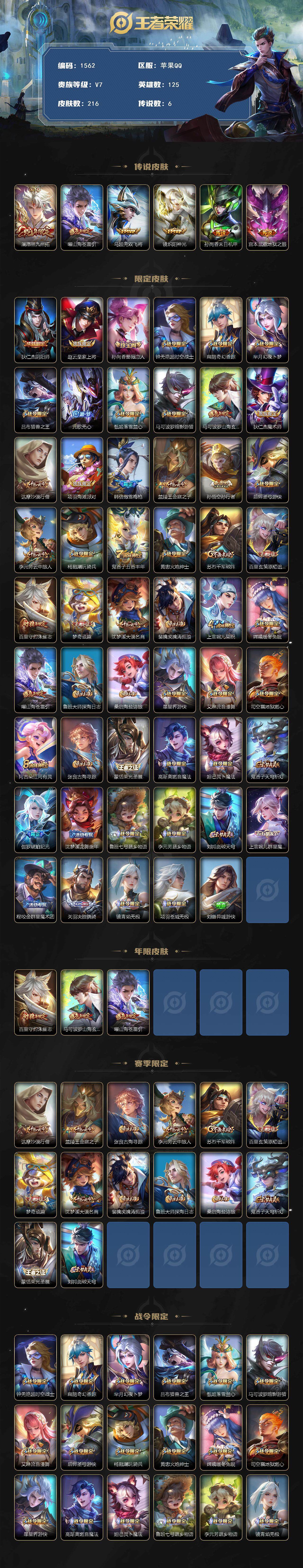 [13945777]苹果Q-V7-永恒钻石I段位-125英雄-216皮肤-0典藏-0珍品无双-0无双-0珍品传说-6传说-64史诗
