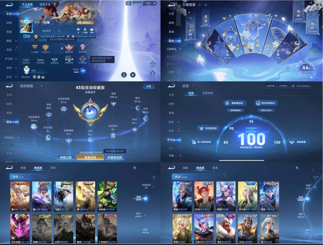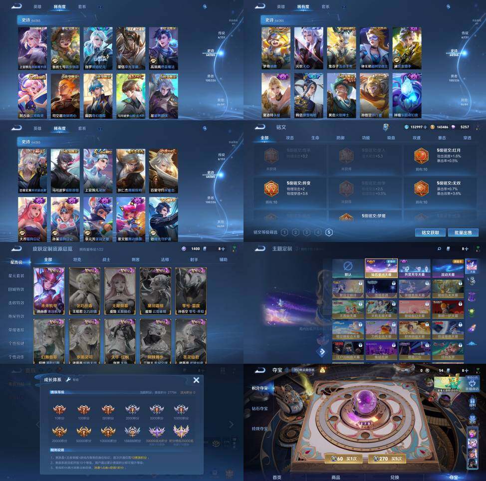 - [12090878]V9 2典藏 1无双 1珍品传说 40传说 125英雄 368皮肤 可修改实名 优质装备:星空梦想(太空人),全息碎影(猴子典藏),器灵·螭龙剑,黄金狮子座,黄金射手座,冠军飞将,云鹰飞将(小将军),绛天战甲(鸡嘴战神),黄金白羊座,炽阳神光,一念神魔,云霓雀翎,末日机甲-孙尚香(绿蚂蚱),地狱火,仲夏夜之梦(大飞蛾),音你心动-小乔,零号·赤焰,地狱之眼,飞鸢探春,音你心动-周瑜,李逍遥,乞巧织情,时之恋人-刘备(电焊工),淬星耀世,超时空战士-狄仁杰,末日机甲-孙策,音你闪耀(rap皮),鲁班七号-时之奇旅 珍品传说:时之奇旅-孙策 传说皮:乘龙·问璇玑(孙尚香年限),乘龙·淬吴钩(孙策年限),典韦战鼓燎原,祥瑞亨通,幻光神枪 珍宝阁皮:妄想食味,蔷薇恋人 限定皮:愿照·九州拓(澜年限),鸣野蒿,异界灵契(白毛香),傲雪梅枪,寅虎·展翼(孙膑年限),神威(电光马子),高山流水,诗剑行,齐天大圣,怒海麟威,降魔,五谷丰年,青龙志(铠年限),冰锋战神,烈魂,岱宗(典韦年限),天狼溯光者,祈雪灵祝(雪兔子),李小龙,逐梦之影,如梦令-后羿,孙行者,乒乒小将,寅虎·御盾(廉颇年限),寅虎·瑞焰(虎皮蛋子),寅虎·赤拳(老虎年限),百木心枪 史诗皮:鸭鸭历险记-刘禅,苍鳞隐世,器灵·浮梦炉,化蝶舞,灵蛊蚀心,龙之律动,石田雨龙,茶境仙,百相守梦-百里守约,遇见神鹿,紫霞仙子,电玩小子(小书包),白龙吟,黄金分割率,特工魅影,千年之狐,永昼,江河有灵,匿光侦查者,末日机甲-莱西奥,魅语,百解令(蒙犽),无限星赏官,冰冠公主,偶像歌手,晚萤,暗夜猫娘,龙骑士(小龙虾),末日机甲-吕布,猫狗日记-孙策,猫狗日记-大乔,时之恋人-孙尚香,乱世虎臣,节奏热浪,修罗,女仆咖啡,摇滚巨星,水果甜心,绅士熊喵,天才门将,星夜王子,心灵骇客,功夫厨神,德古拉伯爵,暗隐猎兽者,幽灵船长,鬼剑武藏,暗渊魔法,心灵战警,乐园奇幻夜,天秀·启明,舞动绿茵,地狱岩魂,诗语江南,纤云弄巧,繁星吟游(呼啦呼啦),缤纷独角兽,乘风破浪,逐浪之夏,龙鼓争鸣,水晶猎龙者,曙光守护者,热力回旋,箭羽风息,金属风暴,圣诞狂欢,圣诞恋歌,鹰眼统帅,暗夜贵公子,魅力维加斯,赏金猎手,寅虎·御盾,千筹问战,无心,未来纪元-赵云