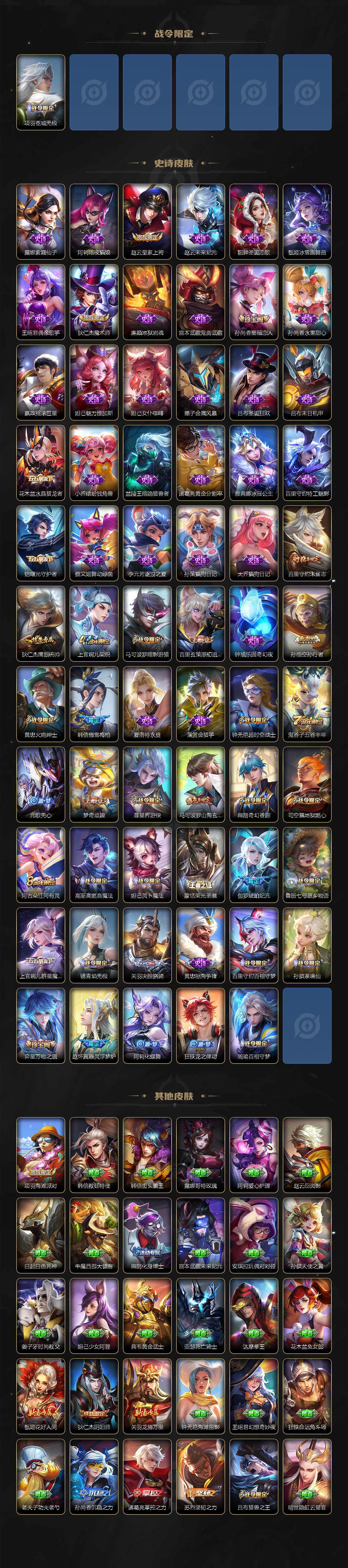 【战令限定】:钟无艳超时空战士,扁鹊奇幻香踪,芈月幻夜卜梦,吕布猎兽之王,甄姬落雪兰心,马可波罗暗影游猎,艾琳流音漫舞,后羿圣弓游侠,杨戬潮玩骑兵,黄忠火炮绅士,嫦娥暖冬兔眠,司空震地狱燃心,暃星界游侠,高渐离燃音魔法,妲己灵卜魔法,鲁班七号蔬乡物语,李元芳蔬乡物语,镜青焰无极,项羽苍威无极