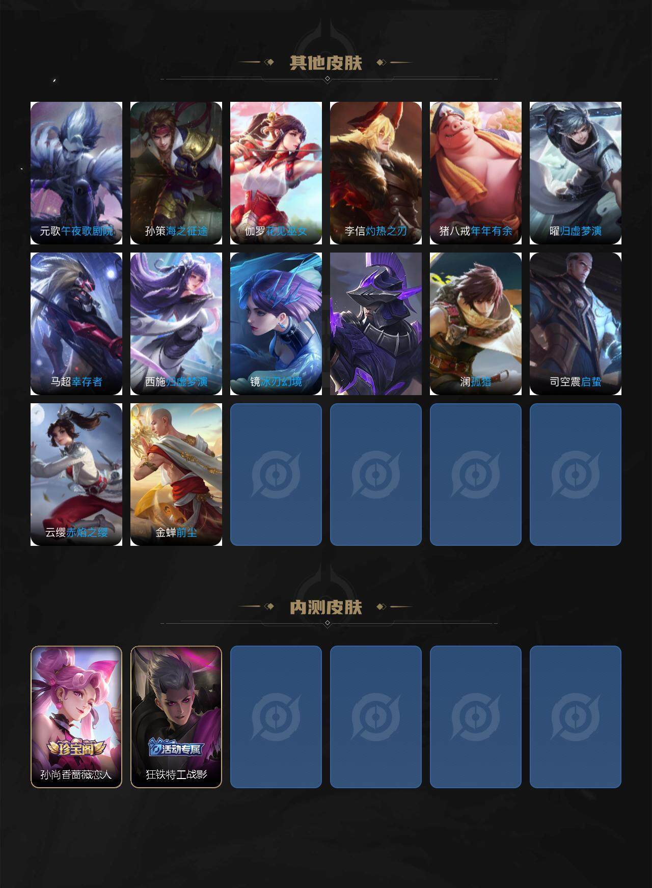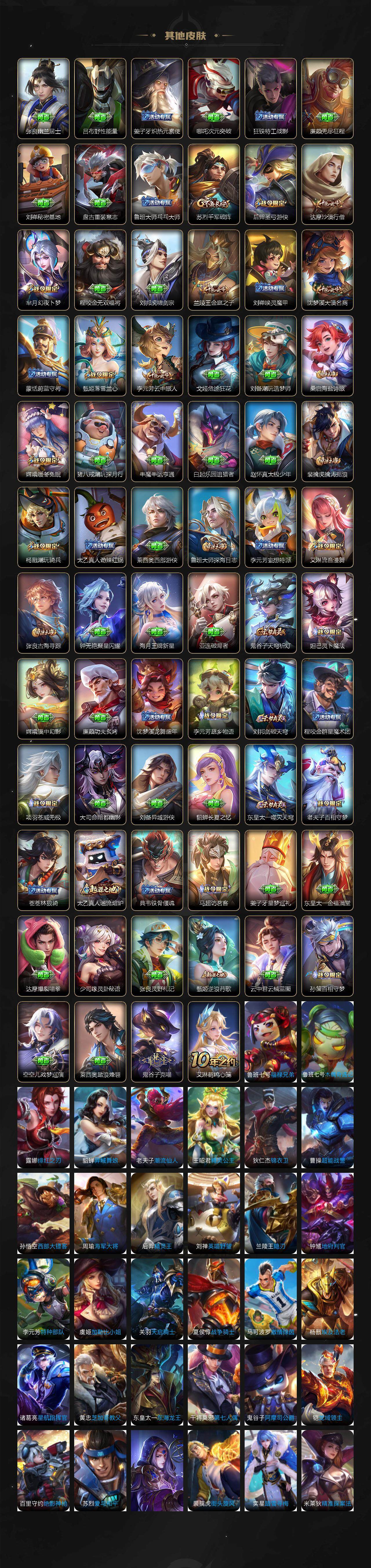 李元芳逐浪之夏,大乔猫狗日记,孙策猫狗日记,露娜紫霞仙子,诸葛亮黄金分割率,王昭君偶像歌手,阿轲暗夜猫娘,雅典娜冰冠公主,吕布末日机甲,嬴政摇滚巨星,兰陵王暗隐猎兽者,宫本武藏鬼剑武藏,钟馗乐园奇幻夜,蔡文姬舞动绿茵,廉颇地狱岩魂,小乔缤纷独角兽,花木兰水晶猎龙者,铠曙光守护者,墨子金属风暴,百里玄策原初追逐者,吕布圣诞狂欢,貂蝉圣诞恋歌,百里守约特工魅影,夏洛特永昼,澜赏金猎手,高渐离燃音魔法,伽罗琥珀纪元,上官婉儿群星魔术团,关羽决胜骁骑,赵怀真器灵·浮梦炉