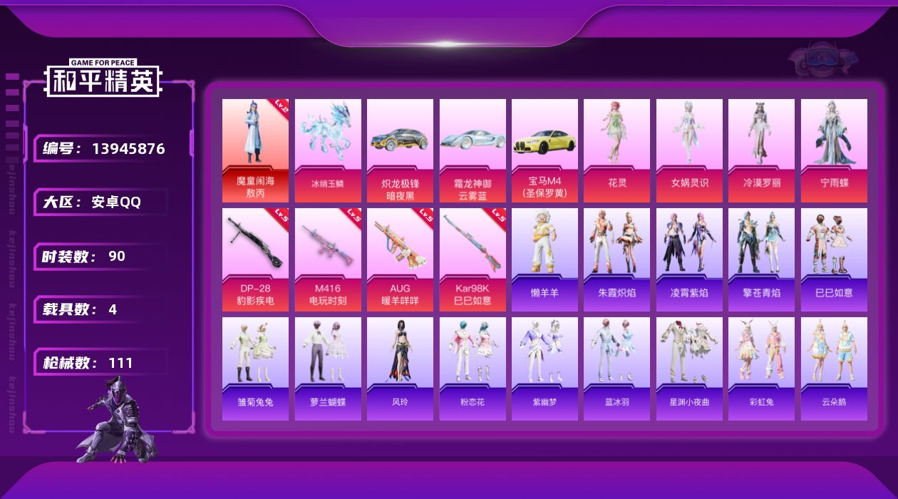 [13945876]安卓 手Q-1神装-4粉装-5特效枪-4载具-2粉色飞行器-40923热力值-5王牌印记-90套装-111枪皮