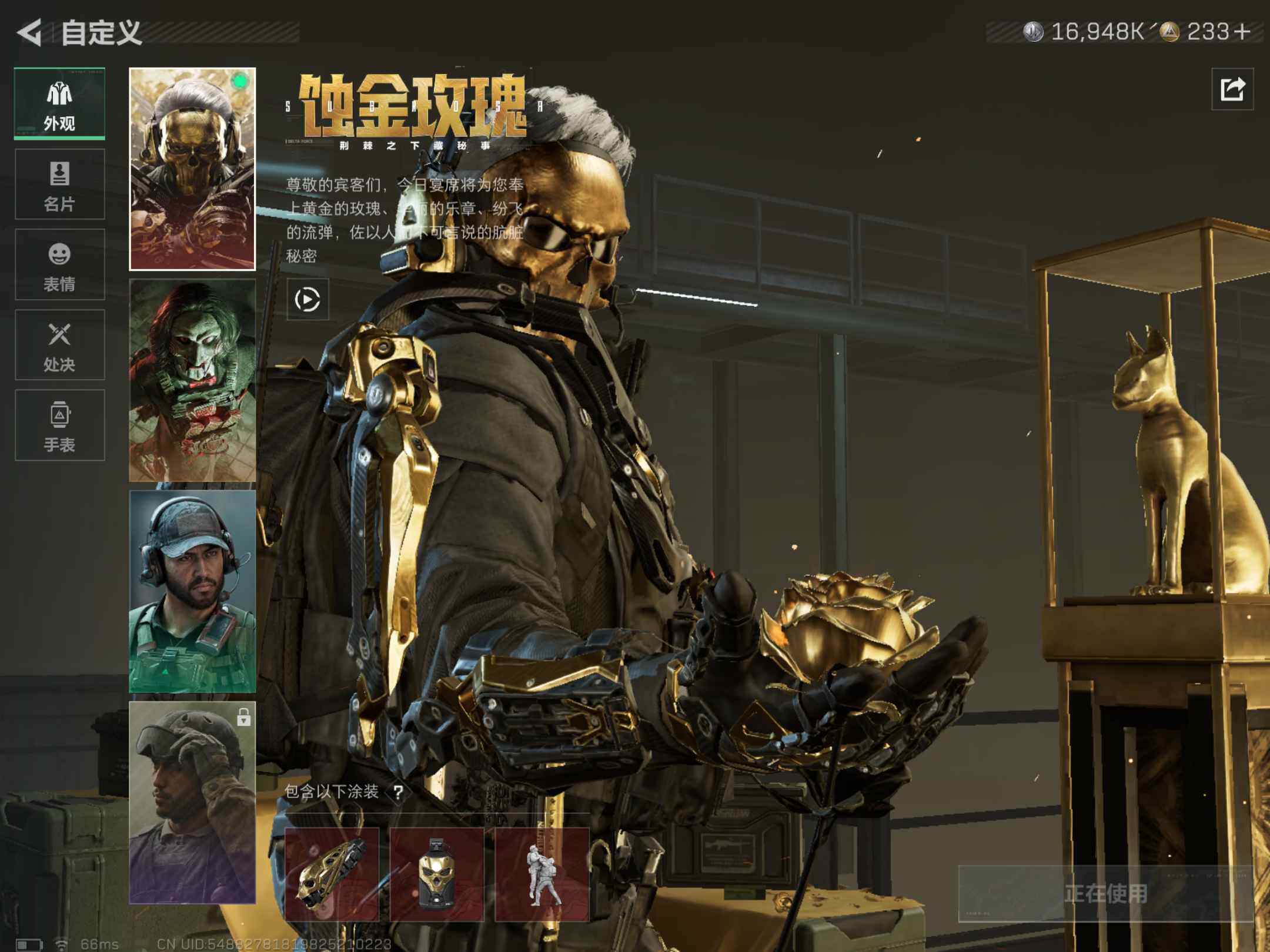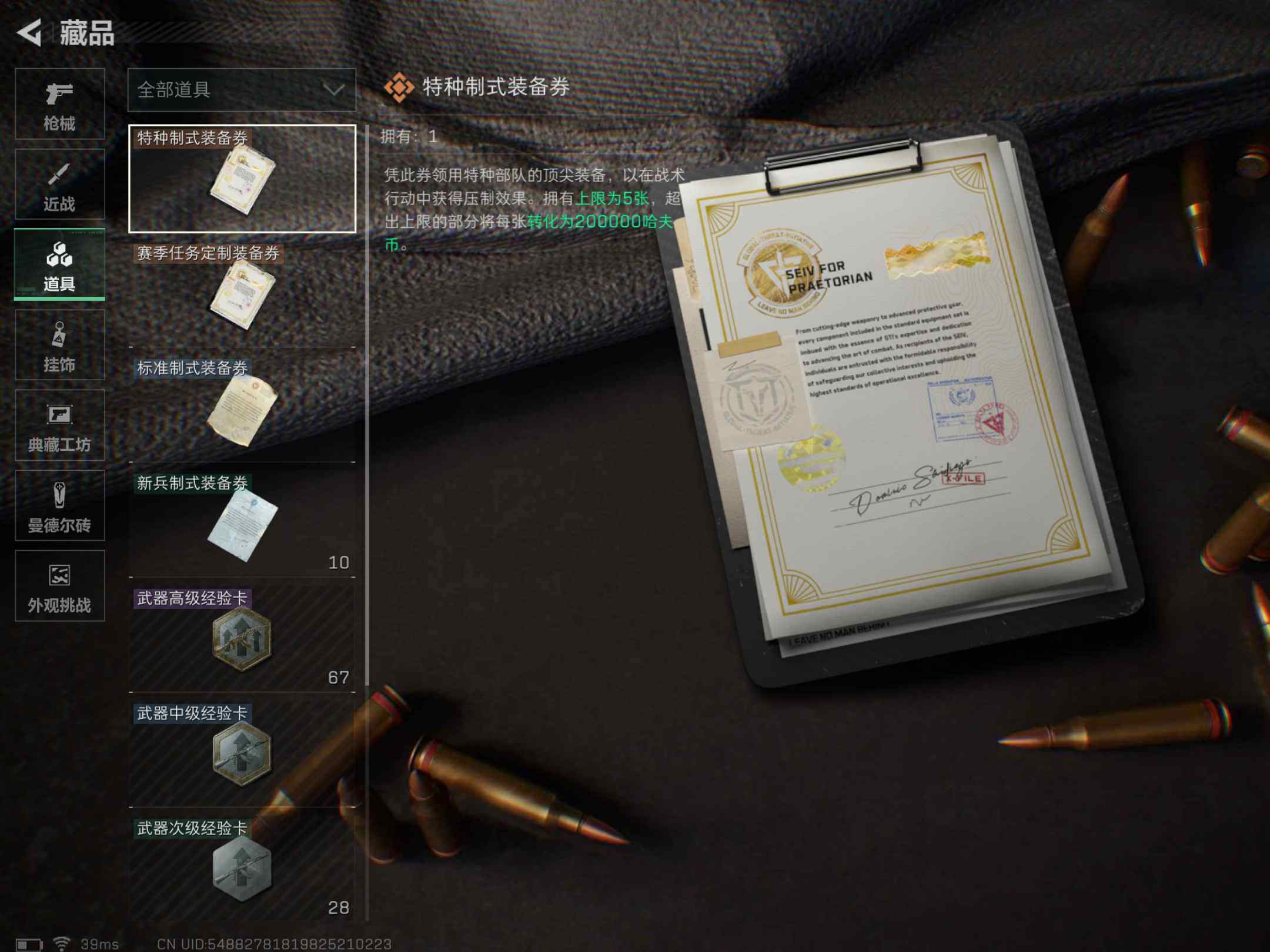 [13946071]可直接换绑 总资产55m 16948k哈伏币-55m流动资产-36烽火等级-白银-1战场等级-无军衔 【干员外观】:红狼-蚀金玫瑰,红狼-电锯惊魂 【近战皮肤】:近战-黑鹰 【传说级普通外观】:M4A1突击步枪-蚀金玫瑰,SCAR-H战斗步枪-启航,KC17突击步枪-电锯惊魂 【史诗级普通外观】:MP5冲锋枪-战术竞备 【稀有级普通外观】:SCAR-H战斗步枪-荣耀列队,SMG-45-行动开启,SR-25射手步枪-开拓,G18-星链科技 【普通级普通外观】:M4A1突击步枪-粉色涂装,QBZ191突击步枪-三角洲力量,AUG突击步枪-浅蓝涂装,M7战斗步枪-红色涂装,MP5冲锋枪-黄蜂,Vector冲锋枪-几何迷彩,UZI冲锋枪-海色,M1014霰弹枪-海浪,M249轻机枪-黄蜂 【军牌】:军牌-幸福国,军牌-信誉优秀 【挂饰】:挂饰-维什戴尔,挂饰-蚀金玫瑰,挂饰-诡影狙击兵,挂饰-诡影喷火兵,挂饰-暗行哨兵,挂饰-启程