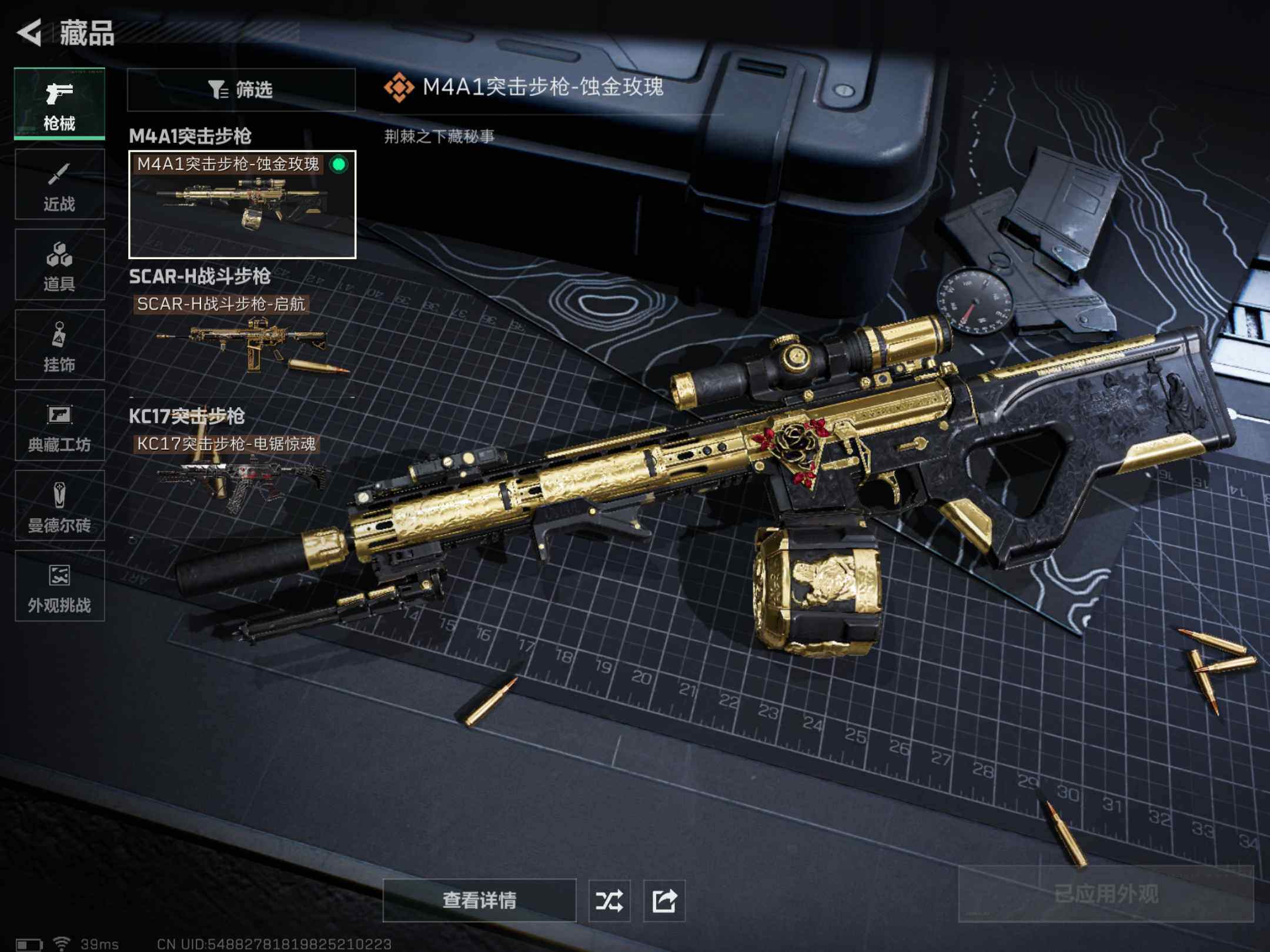【传说级普通外观】:M4A1突击步枪-蚀金玫瑰,SCAR-H战斗步枪-启航,KC17突击步枪-电锯惊魂