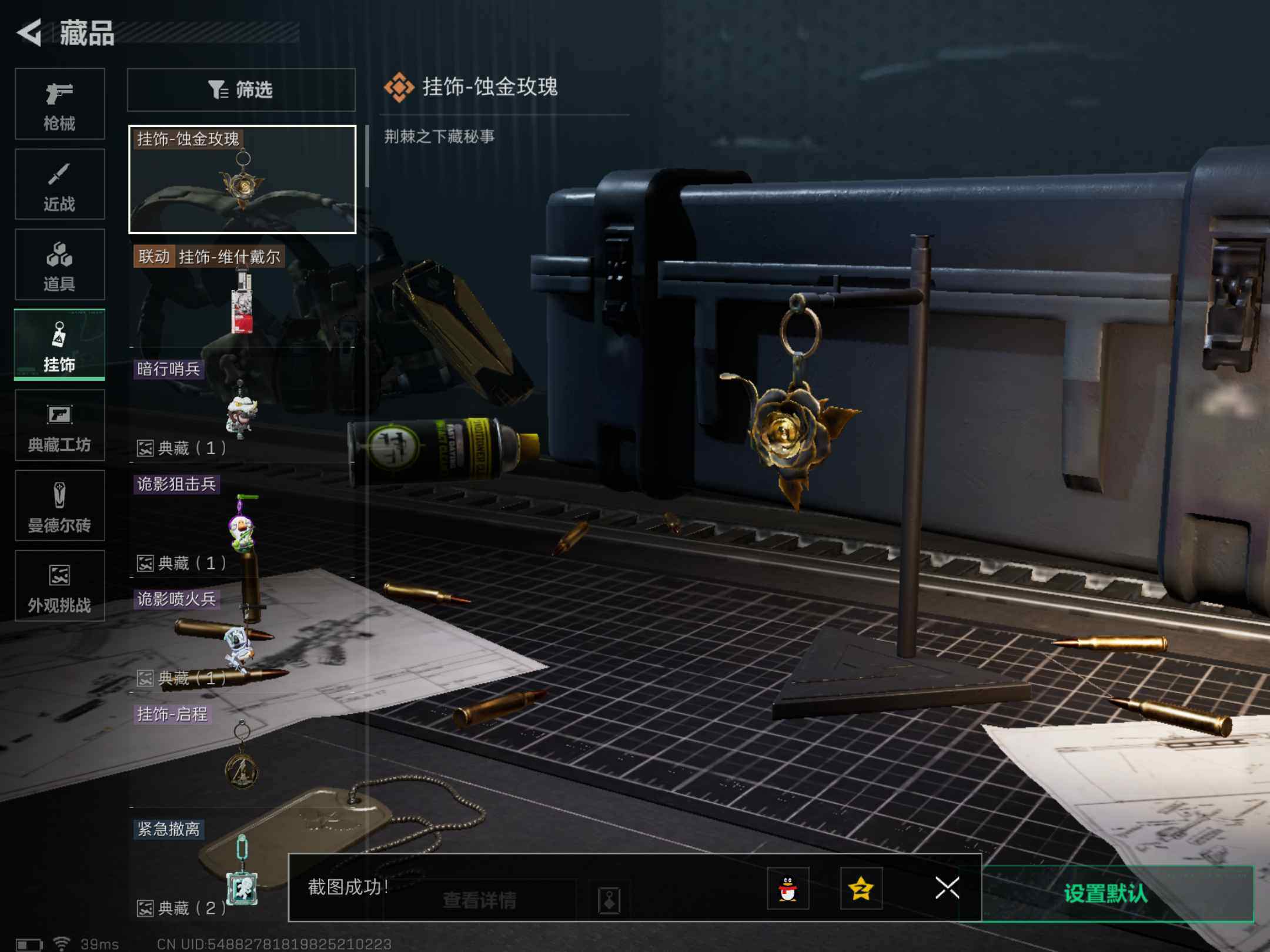 【挂饰】:挂饰-维什戴尔,挂饰-蚀金玫瑰,挂饰-诡影狙击兵,挂饰-诡影喷火兵,挂饰-暗行哨兵,挂饰-启程