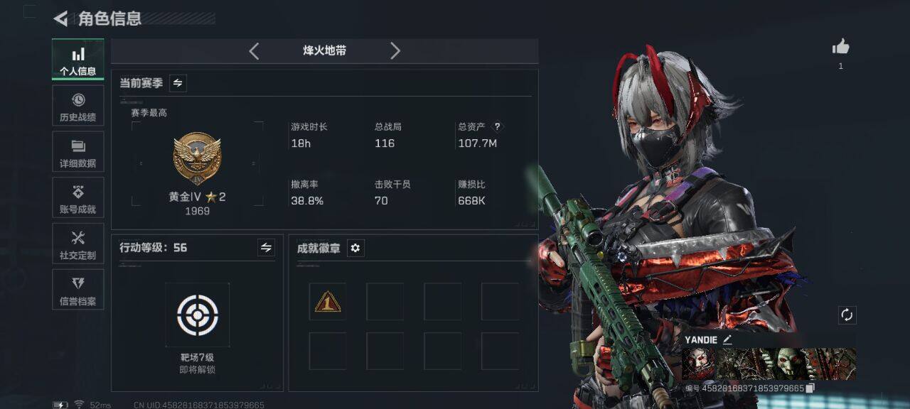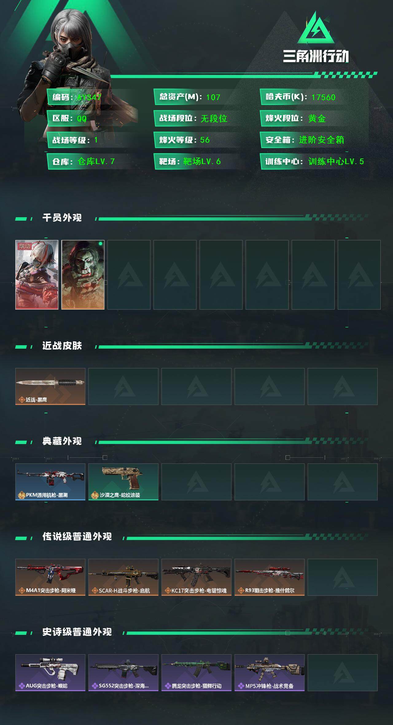 [13946099]可直接换绑 总资产107m 【店主推荐捡漏号!可直接换绑】 17560k哈伏币-107m流动资产-56烽火等级-黄金-1战场等级-无军衔